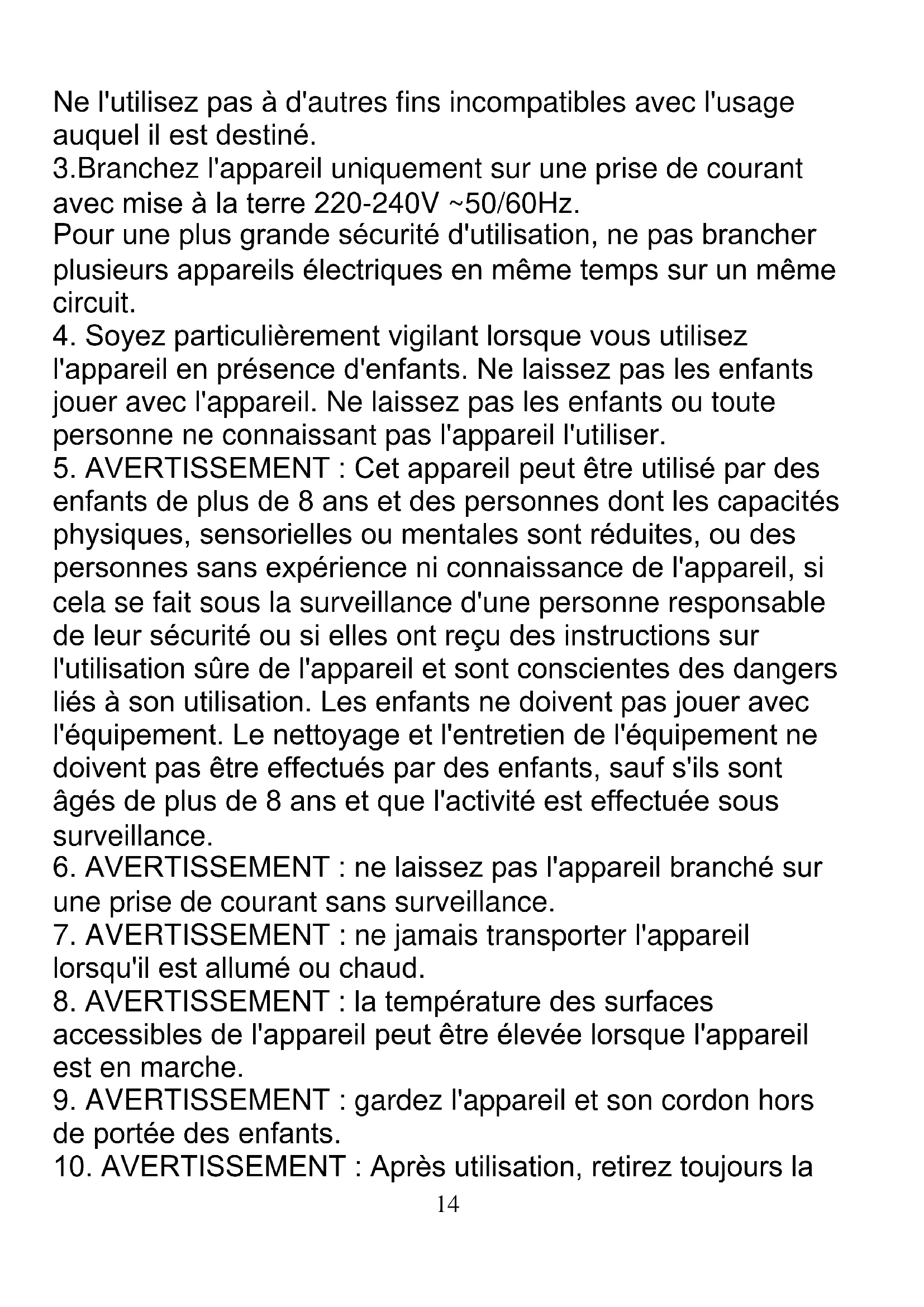 Ne l'utilisez pas à d'autres fins incompatibles avec l'usage auquel il est destiné. 3.Branchez l'appareil uniquement sur une prise de courant avec mise à la terre 220-240V ~50/60Hz. Pour une plus grande sécurité d'utilisation, ne pas brancher plusieurs appareils électriques en même temps sur un même circuit.