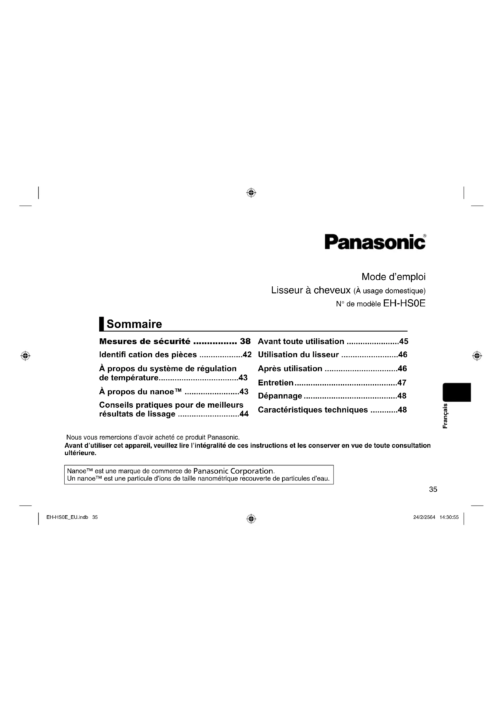 - Ne pas endommager, modifi er, plier de force ou tirer sur le cordon ou la fi che. De même, ne pas placer d’objet lourd sur le cordon, ni le tordre ou le pincer. - Cela pourrait provoquer un choc électrique, des brûlures ou un incendie en raison d’un court-circuit. Ne pas utiliser avec le cordon embobiné. - Procéder de la sorte peut provoquer des incendies ou des électrocutions. Ne pas enrouler le cordon autour du corps principal lors du stockage. - Procéder de la sorte peut faire céder le câble du cordon à cause de la charge et peut provoquer des électrocutions ou des incendies causés par court-circuit. Ne pas utiliser si la fi che ou le cordon d’alimentation est endommagé (fi ssures, fi ls électriques visibles, etc.) ou brûlant. - Procéder de la sorte peut provoquer des brûlures, des électrocutions ou des incendies causés par court-circuit. EH-HS0E_EU.indb 38EH-HS0E_EU.indb 38 24/2/2564 14:30:5524/2/2564 14:30:5539 Français AVERTISSEMENT Ne jamais utiliser l’appareil si la fi che s’insère de manière lâche dans une prise domestique. - Procéder de la sorte peut provoquer des brûlures, des électrocutions ou des incendies causés par court-circuit. Ne pas raccorder la fi che sur une prise électrique ni la débrancher avec les mains humides. - Procéder de la sorte peut provoquer des électrocutions ou des blessures. Ne pas utiliser l’appareil avec les mains humides. - Procéder de la sorte peut provoquer des brûlures, des électrocutions ou des incendies provoqués par court- circuit. Ne jamais laisser l’appareil branché sans surveillance ni débranché lorsque la plaque de fer est encore chaude après usage. - Cela peut provoquer des incendies, des brûlures ou des décolorations, voire des déformations d’objets à proximité. Ne pas ranger l’appareil dans une salle de bain ou un lieu à forte humidité. En outre, ne pas placer l’appareil dans un lieu exposé aux projections d’eau (par exemple en haut d’un meuble-lavabo). - Procéder de la sorte peut provoquer des électrocutions ou des incendies. Ne pas appliquer de laque ou de produits capillaires infl ammables sur le corps principal ou les cheveux pendant l’utilisation de l’appareil. - Procéder de la sorte peut provoquer des incendies, des électrocutions ou des incendies. Ne pas plonger l’appareil dans l’eau. Ne pas utiliser ce matériel à proximité d’une source d’eau. - Procéder de la sorte peut provoquer des électrocutions ou des incendies. Ne pas bloquer ni insérer des objets étrangers comme des épingles à cheveux dans la sortie nanoe™. - Procéder de la sorte peut provoquer des incendies, des électrocutions ou des incendies. Cesser immédiatement d’utiliser l’appareil, puis débrancher la prise, en cas d’anomalie ou de dysfonctionnement. - Un tel problème peut être source d’incendies, d’électrocutions ou de blessures. <Cas d’anomalies ou de dysfonctionnements>