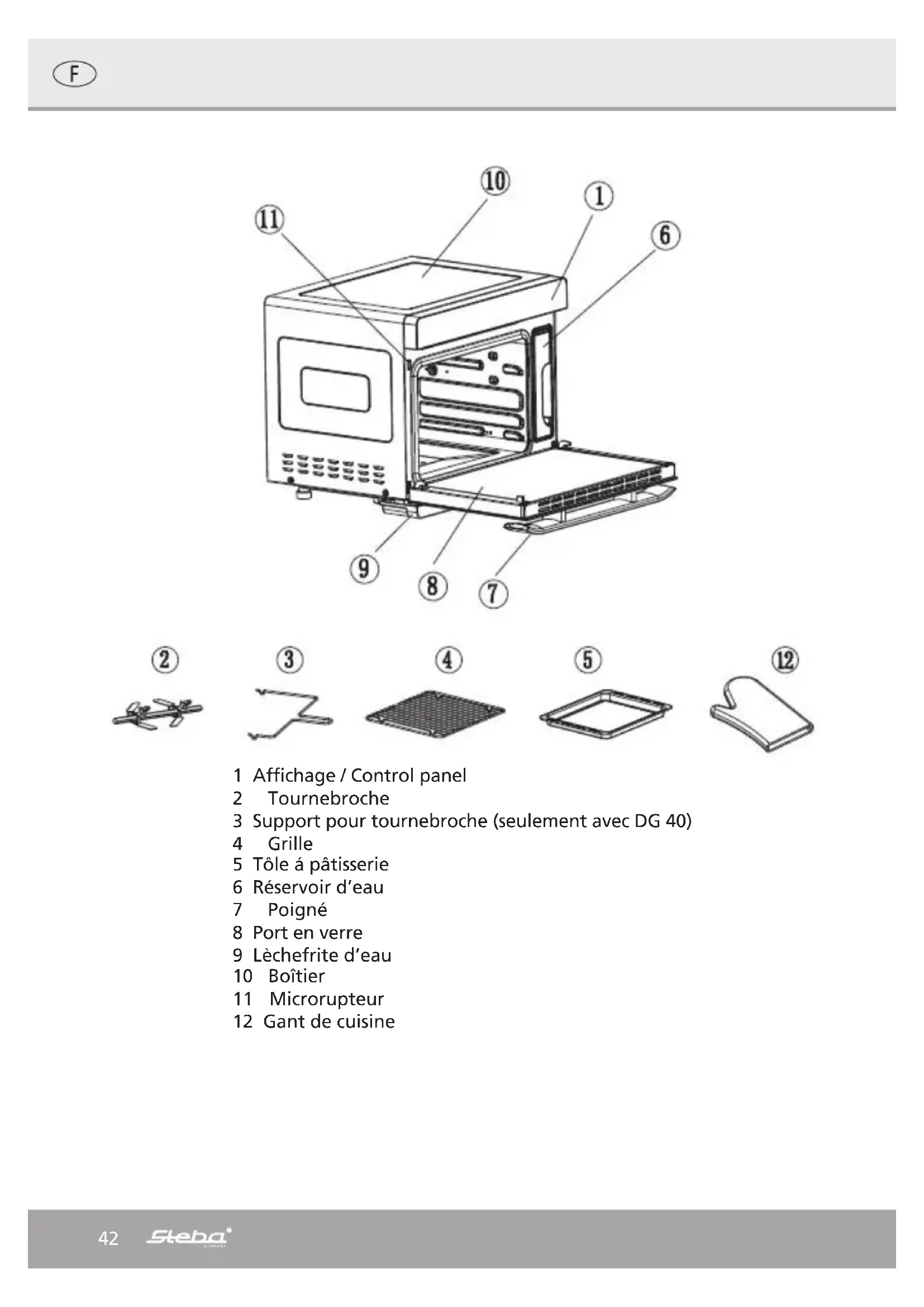 ∙ Put coffee machine descaler and water into the water tank. ∙ Press and use the buttons to select the symbol and press . ∙ The system heats up slowly to 85°C. ∙ After 30 minutes, the device indicates that the tank with the descaler should be emptied and refilled with pure water. ∙ After another 10 minutes change the water again and restart. ∙ The default time of 50 minutes cannot be changed. At the end of the program, the device beeps 10 times and goes into standby mode. Residual heat This symbol indicates that the interior temperature is higher than 50°C. the ventilation for cooling keeps running for about 3 minutes in order to cool the electronics.40 Troubleshooting Dear Client, Thank you for buying this STEBA product. The following table will help you with problems that may occur when using your device. For many problems there is a sim- ple solution, because not everything that appears like a malfunction must be serious. Please check the following list before contacting our customer service. Problem Reason Solution Device does not work ∙ No power ∙ To many devices at one power cord ∙ Door not closed ∙ Check is plug is plugged-in cor- rectly ∙ Check the fuse ∙ Close door Display does not light up ∙ Unplug the device for 1 minute Device does not heat ER1 / ER2 ER3 / ER 4 ∙ Overheat of sensor ∙ Open the door and leave 10 minutes to cool down ∙ Contact our service ER 7 ∙ Steam sensor ∙ Contact our service ER 8 ∙ Short circuit f steam sensor ∙ Contact our service Ventilation does not work ∙ Bad contacts ∙ Ventilation is damaged ∙ Contact our service No steam ∙ No water in tank ∙ Water tank nor inserted correctly ∙ Steam generator is damaged ∙ Refill water ∙ Insert tank correctly ∙ Contact our service Steam emerge the oven ∙ Door not closed prop- erly ∙ Seal has loosened or is damaged ∙ Door is damaged ∙ Contact our service Noise of ventila- tion after turning off ∙ Cooling of the electron- ics ∙ Will turn off automatically Heating up takes long ∙ Steam generator is limed ∙ Descale the device ∙ Use distilled water41 Correct Disposal of this product This marking indicates that this product should not be disposed with other household wastes throughout the EU. To prevent possible harm to the envi- ronment or human health from uncontrolled waste disposal, recycle it re- sponsibly to promote the sustainable reuse of material resources. To return your used device, please use the return and collection systems or contact the retailer where the product was purchased. They can take this product for environmental safe recycling. Packaging disposal: Do not throw away the package materials. Please put it in the recycling bin. Gift box: Paper, should be put to the old paper collection point. Plastic packaging material and foils should be collected in the spe- cial collection containers. Service and Repair: If the appliance must be repaired, please get in touch with your trader or with the manufacturer: STEBA Elektrogeräte GmbH & Co KG Pointstr. 2, 96129 Strullendorf / Germany Distribution-Tel.: 09543 / 449-17 / -18, Service-Tel.: 09543 / 449-44, Fax: 09543 / 449-19 e-Mail: elektro@steba.com Internet: http://www.steba.com42 1 Affichage / Control panel 2 Tournebroche 3 Support pour tournebroche (seulement avec DG 40) 4 Grille 5 Tôle á pâtisserie 6 Réservoir d’eau 7 Poigné 8 Port en verre 9 Lèchefrite d’eau 10 Boîtier 11 Microrupteur 12 Gant de cuisine43 Généralement Cet appareil isolé contre la chaleur est conçu pour un usage privé et non commercial. Il est adapté pour griller, cuisson, gra- tiner et réchauffer la nourriture. Veuillez lire attentivement le mode d‘emploi et gardez-le soigneusement. En cas de remise de l‘appareil à une tierce personne, n’oubliez pas de joindre le mode d’emploi. N’utilisez l‘appareil que selon les indications et respectez les consignes de sécurité. Nous déclinons toute respon- sabilité en cas de dommages ou d’accidents résultant du non- respect des indications du mode d’emploi. Enlever tout matériel d‘emballage et tous les autocollants. Nettoyez toutes les pièces (voir nettoyage). Consignes de sécurité ∙ Surface chaude ! Il y a un risque de brûlure en tou- chant la surface pendant le fonctionnement. Placez l‘appareil avec le dos avec une distance de 10cm au mur de la cuisine. ∙ L‘appareil doit être branché et utilisé conformément aux indica- tions de la plaque signalétique. ∙ L‘appareil n‘est pas un four encastrable et ne doit pas être uti- lisé comme tel. ∙ Contrôler avant chaque utilisation, que l’appareil ou le câble d’alimentation en courant n’est pas endommagé. ∙ Ne touchez jamais la fiche d’alimentation avec des mains mouil- lées. ∙ Connectez la fiche d’alimentation seulement à une prise de courant correctement installée et facilement accessible. ∙ Pour débranchez la fiche d’alimentation, tirez toujours la fiche – pas le câble. ∙ Retirer la prise après chaque utilisation ou en cas de disfonc- tionnement. ∙ N’arracher pas la prise et ne l’endommager pas. Ne coincer pas le câble d’alimentation. ∙ Tenir le câble d’alimentation éloigné des parties chaudes.44 ∙ L‘appareil peut être utilisé par des enfants à partir de 8 ans ainsi que par des personnes atteintes de déficiences phy- siques, sensorielles ou mentales, ou manquant d‘expérience et/ ou de connaissances, si elles sont surveillées ou ont été instruites de la manière d‘utiliser l‘appareil en toute sécurité et qu‘elles en ont compris les dangers potentiels. Le nettoyage et l‘entretien de l‘appareil ne doivent pas être réalisés par des enfants, sauf s‘ils sont âgés de plus de 8 ans et exécutent ces opérations sous surveillance. ∙ Tenir l‘appareil et le cordon d‘alimentation hors de portée des enfants de moins de 8 ans. ∙ Veillez á ce que des enfants ne jouent pas avec l’emballage 