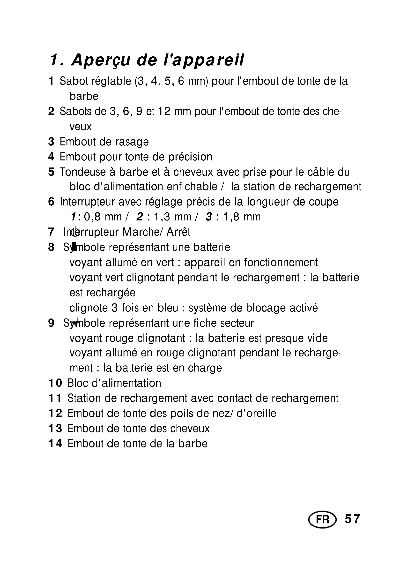 1 Sabot réglable (3, 4, 5, 6 mm) pour l'embout de tonte de la barbe 2 Sabots de 3, 6, 9 et 12 mm pour l'embout de tonte des che- veux 3 Embout de rasage 4 Embout pour tonte de précision 5 Tondeuse à barbe et à cheveux avec prise pour le câble du bloc d'alimentation enfichable / la station de rechargement 6 Interrupteur avec réglage précis de la longueur de coupe 1: 0,8 mm / 2 : 1,3 mm / 3 : 1,8 mm 7 Interrupteur Marche/Arrêt 8 Symbole représentant une batterie voyant allumé en vert : appareil en fonctionnement voyant vert clignotant pendant le rechargement : la batterie est rechargée clignote 3 fois en bleu : système de blocage activé 9 Symbole représentant une fiche secteur voyant rouge clignotant : la batterie est presque vide voyant allumé en rouge clignotant pendant le recharge- ment|: la batterie est en charge 10 Bloc d'alimentation 11 Station de rechargement avec contact de rechargement 12 Embout de tonte des poils de nez/d'oreille 13 Embout de tonte des cheveux 14 Embout de tonte de la barbe58