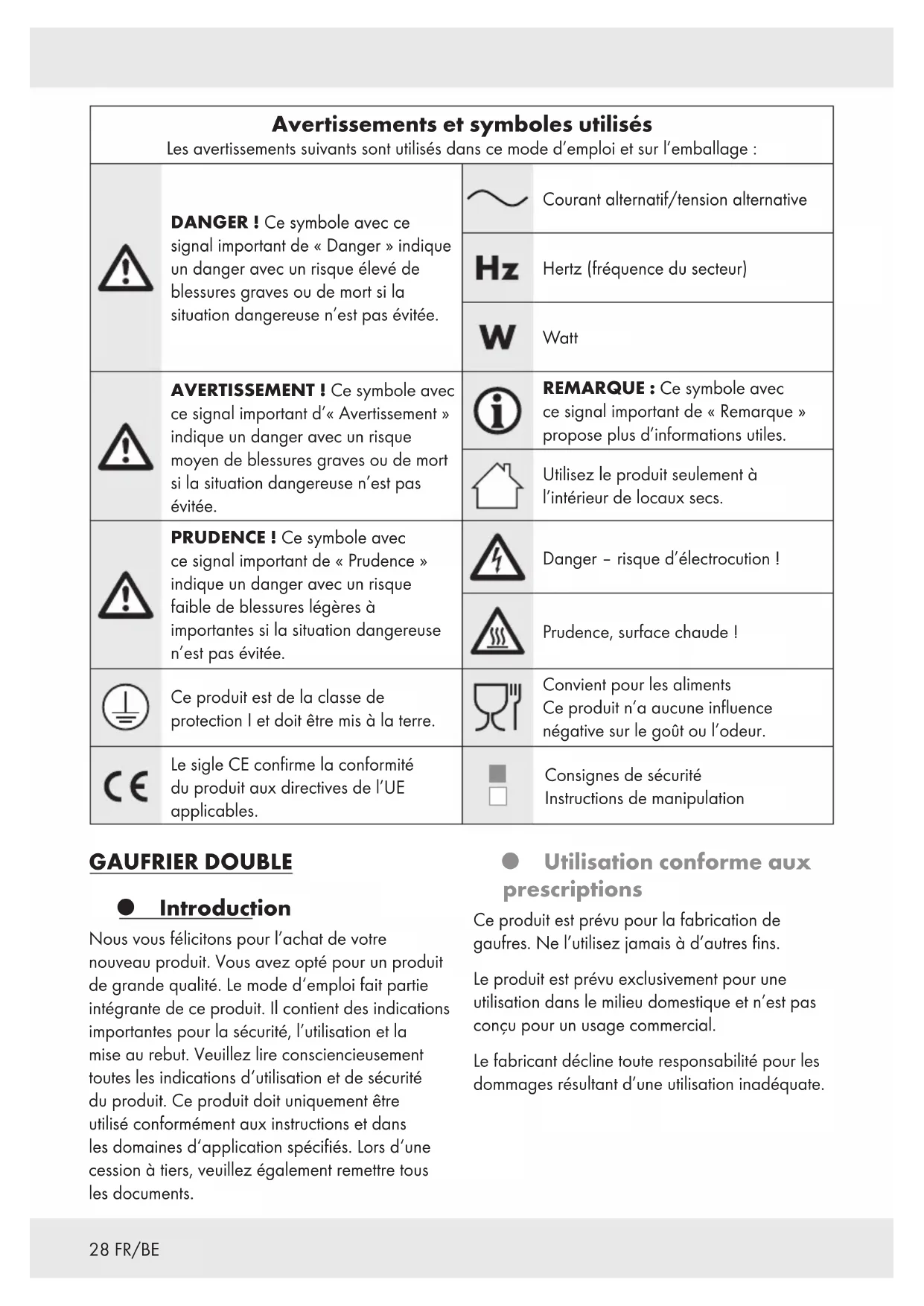 AVERTISSEMENT! Ne plongez jamais les composants électriques du produit dans l’eau ou dans tout autre liquide. Ne maintenez jamais le produit sous l’eau courante. REMARQUES: o Nettoyez le produit dès qu’il a refroidi. Une fois que des restes de nourriture sont secs, ils ne sont pas faciles à retirer. o N’utilisez jamais de produits de nettoyage soit agressifs soit récurants ou de brosses dures pour effectuer le nettoyage du produit ou des accessoires. o Séchez soigneusement le produit avant de le réutiliser. Pièce Méthode de nettoyage Boîtier o Nettoyez le boîtier avec un torchon légèrement humidifié. Utilisez si besoin un produit de nettoyage doux. o Ne laissez jamais d’eau ou d’autres liquides pénétrer à l’intérieur du produit.36 FR/BE Pièce Méthode de nettoyage Plaques [4] o Éliminer la graisse et les liquides: Utilisez une feuille de papier absorbant. o Retirer des résidus brûlés, attachés: Utilisez une spatule en bois ou de petits bâtonnets en bois. o Essuyez les plaques avec un chiff on légèrement humide imbibé d’un produit de nettoyage doux. Dépannage Problème Solution Le produit ne fonctionne pas. o Branchez la fi che secteur [6] dans une prise de courant appropriée. Les gaufres sont trop foncées. o Réduisez le niveau de brunissement. o Raccourcissez le temps de cuisson. Les gaufres sont trop claires. o Augmentez le niveau de brunissement. o Rallongez le temps de cuisson. Les gaufres cuites sont diffi ciles à retirer du produit. o Graissez légèrement les plaques [4] avant de cuire. o Essayez une autre recette de pâte. Rangement PRUDENCE! Surface chaude! Ne rangez pas le produit immédiatement après son utilisation. Laissez d’abord le produit complètement refroidir. o Nettoyez le produit avant de le ranger. o Roulez le cordon d’alimentation[6] dans l’enrouleur de câble [5]. o Rangez le produit dans son emballage d’origine lorsqu’il n’est pas utilisé. o Conservez le produit dans un endroit sec hors de la portée des enfants. Mise au rebut L’emballage se compose de matières recyclables pouvant être mises au rebut dans les déchetteries locales. Veuillez respecter l‘identifi cation des matériaux d‘emballage pour le tri sélectif, ils sont identifi és avec des abbréviations (a) et des chiff res (b) ayant la signifi cation suivante : 1–7 : plastiques/ 20–22 : papiers et cartons/ 80–98 : matériaux composite. Produit : Le produit ainsi que les accessoires et les matériaux d’emballage sont recyclables et relèvent de la responsabilité élargie du producteur. Éliminez‑les séparément, en suivant l’Info‑tri illustrée, dans l’intérêt d’un meilleur traitement des déchets. Le logo Triman n’est valable qu’en France. Votre mairie ou votre municipalité vous renseigneront sur les possibilités de mise au rebut des produits usagés. Afi n de contribuer à la protection de l’environnement, veuillez ne pas jeter votre produit usagé dans les ordures ménagères, mais éliminez‑le de manière appropriée. Pour obtenir des renseignements concernant les points de collecte et leurs horaires d’ouverture, vous pouvez contacter votre municipalité.37FR/BE Garantie Article L217–16 du Code de la consommation Lorsque l‘acheteur demande au vendeur, pendant le cours de la garantie commerciale qui lui a été consentie lors de l‘acquisition ou de la réparation d‘un bien meuble, une remise en état couverte par la garantie, toute période d‘immobilisation d‘au moins sept jours vient s‘ajouter à la durée de la garantie qui restait à courir. Cette période court à compter de la demande d‘intervention de l‘acheteur ou de la mise à disposition pour réparation du bien en cause, si cette mise à disposition est postérieure à la demande d‘intervention. Indépendamment de la garantie commerciale souscrite, le vendeur reste tenu des défauts de conformité du bien et des vices rédhibitoires dans les conditions prévues aux articles L217–4 à L217–13 du Code de la consommation et aux articles 1641 à 1648 et 2232 du Code Civil. Article L217–4 du Code de la consommation Le vendeur livre un bien conforme au contrat et répond des défauts de conformité existant lors de la délivrance. Il répond également des défauts de conformité résultant de l‘emballage, des instructions de montage ou de l‘installation lorsque celle‑ci a été mise à sa charge par le contrat ou a été réalisée sous sa responsabilité. Article L217–5 du Code de la consommation Le bien est conforme au contrat : 1° S´il est propre à l‘usage habituellement attendu d‘un bien semblable et, le cas échéant :