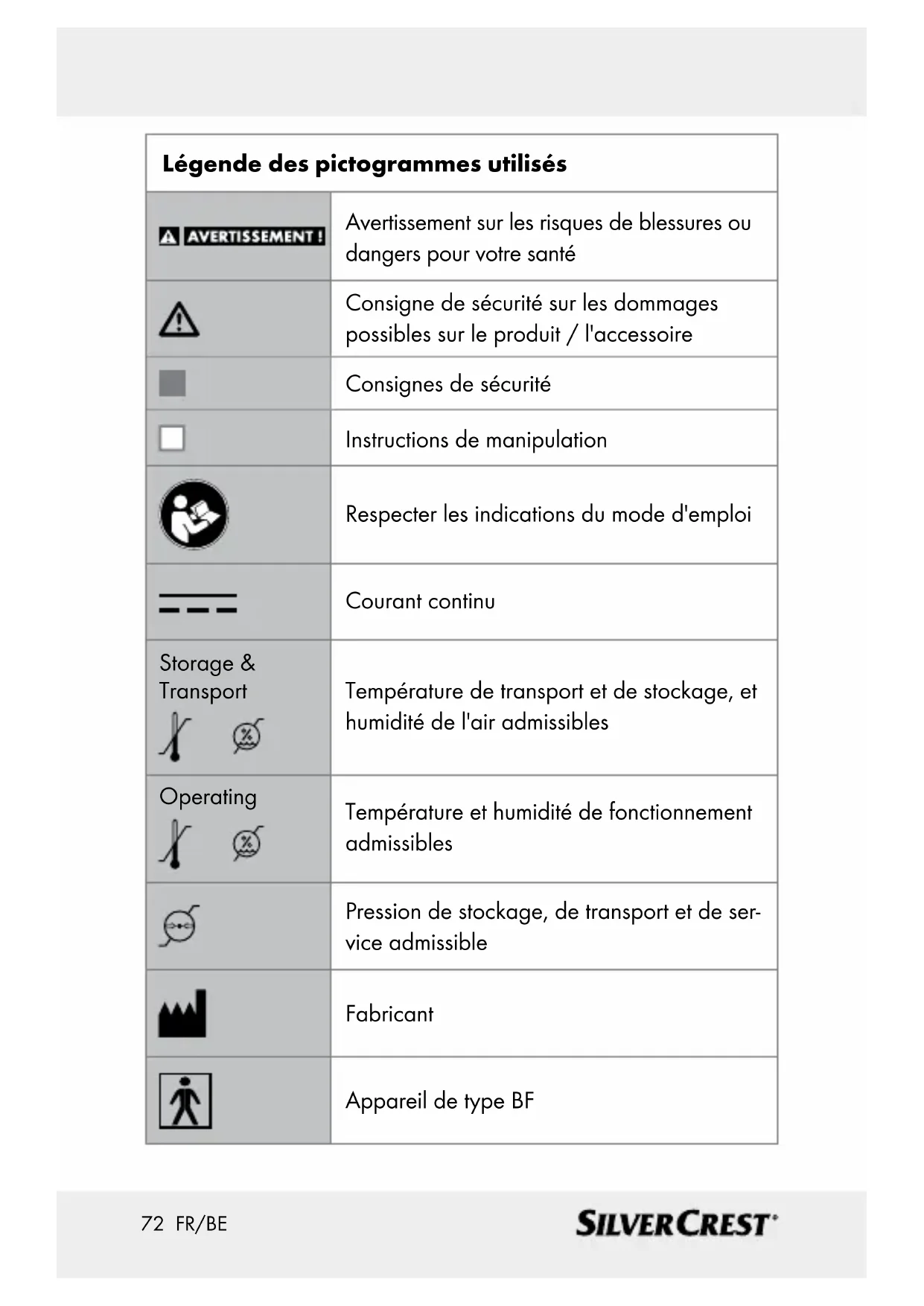 ...........................................Page 90 Évaluer les valeurs mesurées ................................... Page 92 Classification des résultats de mesure ............................ Page 93 Enregistrer, récupérer et supprimer les valeurs mesurées .............................Page 94 Nettoyage et entretien ...............................................Page 96 Rangement ....................................................................... Page 96 Dépannage ......................................................................Page 97 Mise au rebut ..................................................................Page 98 Garantie / Service client .............................................. Page 9972 FR/BE Légende des pictogrammes utilisés Avertissement sur les risques de blessures ou dangers pour votre santé Consigne de sécurité sur les dommages possibles sur le produit / l'accessoire Consignes de sécurité Instructions de manipulation Respecter les indications du mode d'emploi Courant continu Storage & Transport Température de transport et de stockage, et humidité de l'air admissibles Operating Température et humidité de fonctionnement admissibles Pression de stockage, de transport et de ser- vice admissible Fabricant Appareil de type BF73 FR/BE Numéro de série