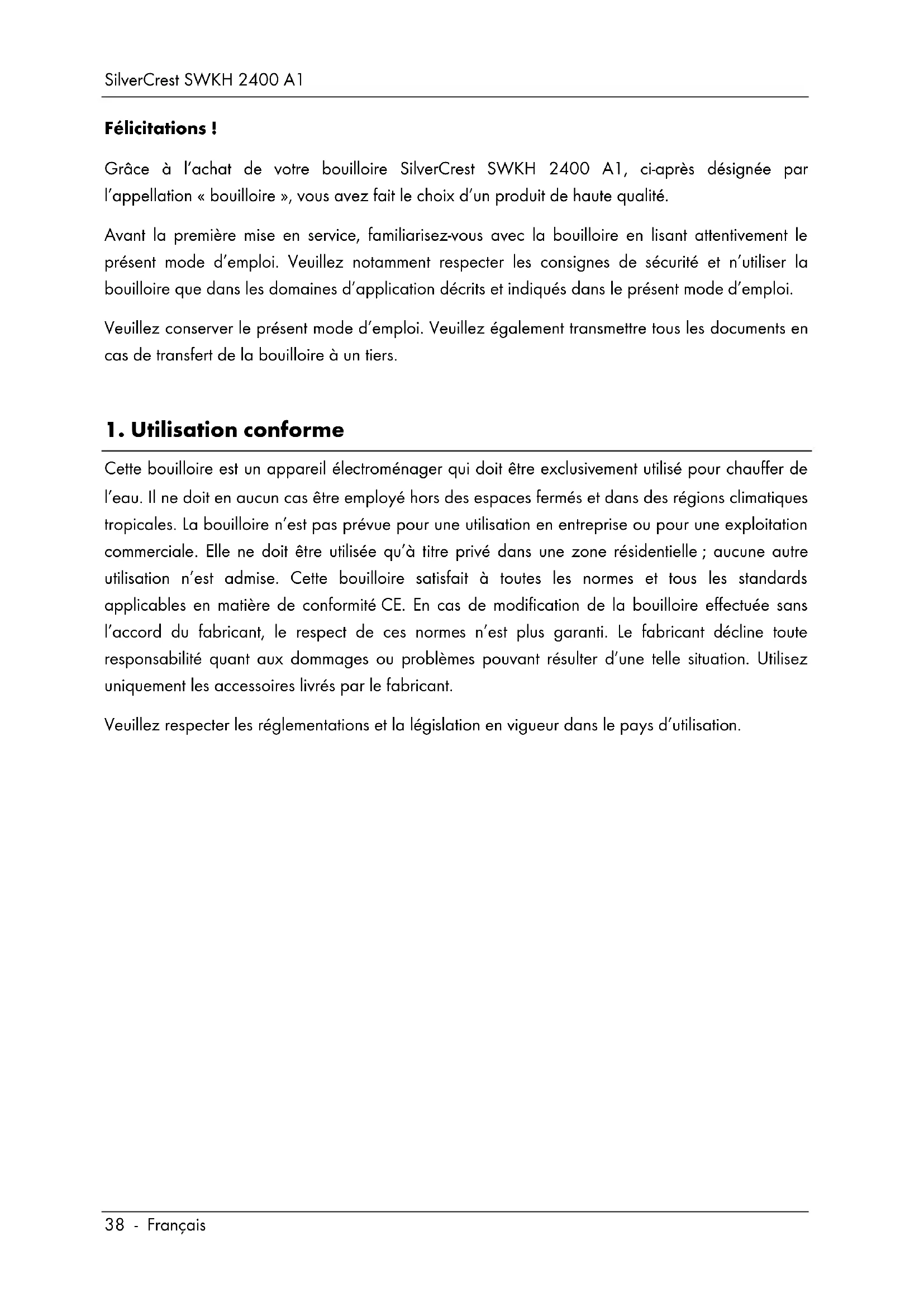 Félicitations ! Grâce à l’achat de votre bouilloire SilverCrest SWKH 2400 A1, ci-après désignée par l’appellation « bouilloire », vous avez fait le choix d’un produit de haute qualité. Avant la première mise en service, familiarisez-vous avec la bouilloire en lisant attentivement le présent mode d’emploi. Veuillez notamment respecter les consignes de sécurité et n’utiliser la bouilloire que dans les domaines d’application décrits et indiqués dans le présent mode d’emploi. Veuillez conserver le présent mode d’emploi. Veuillez également transmettre tous les documents en cas de transfert de la bouilloire à un tiers.
