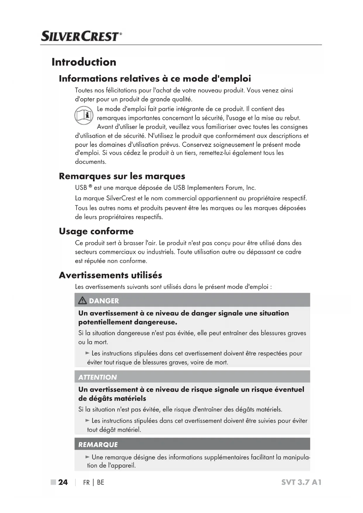 est une marque déposée de USB Implementers Forum, Inc. La marque SilverCrest et le nom commercial appartiennent au propriétaire respectif. Tous les autres noms et produits peuvent être les marques ou les marques déposées de leurs propriétaires respectifs. Usage conforme Ce produit sert à brasser l'air. Le produit n'est pas conçu pour être utilisé dans des secteurs commerciaux ou industriels. Toute utilisation autre ou dépassant ce cadre est réputée non conforme. Avertissements utilisés Les avertissements suivants sont utilisés dans le présent mode d'emploi: DANGER Un avertissement à ce niveau de danger signale une situation potentiellement dangereuse. Si la situation dangereuse n'est pas évitée, elle peut entraîner des blessures graves ou la mort. ► Les instructions stipulées dans cet avertissement doivent être respectées pour éviter tout risque de blessures graves, voire de mort. ATTENTION Un avertissement à ce niveau de risque signale un risque éventuel de dégâts matériels Si la situation n'est pas évitée, elle risque d'entraîner des dégâts matériels. ► Les instructions stipulées dans cet avertissement doivent être suivies pour éviter tout dégât matériel. REMARQUE ► Une remarque désigne des informations supplémentaires facilitant la manipula- tion de l'appareil.FR