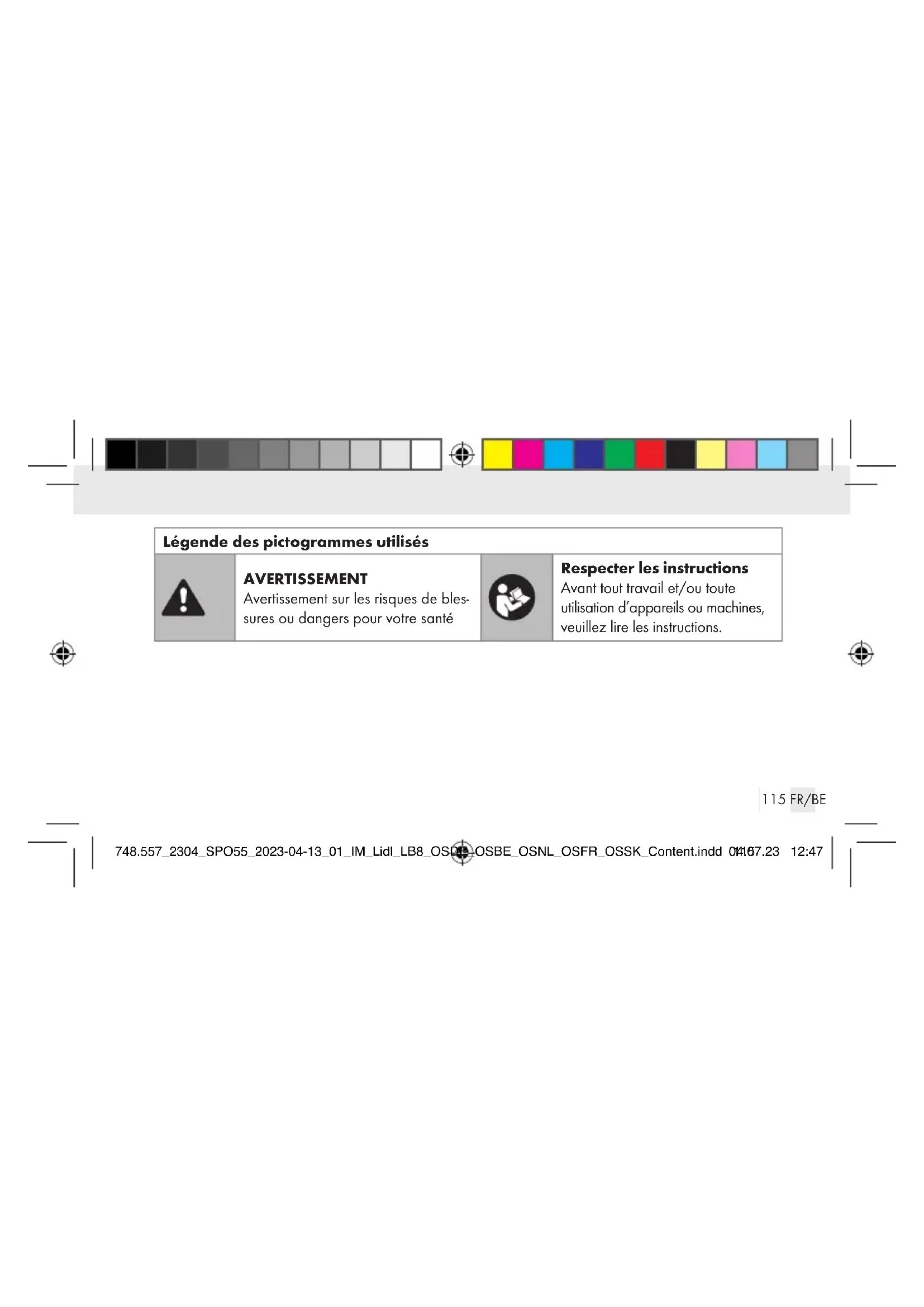 des valeurs mesurées dans l’application «HealthForYou» ................................. Page 149 Évaluer les valeurs de mesure .............Page 152 Chute de la saturation en oxygène dépendant de l’altitude .......................Page 154 Nettoyage et entretien .......Page 156 Stockage ...........................................Page 157 Dépannage ....................................Page 158 Mise au rebut ............................... Page 161 Garantie / Service après-vente ...............Page 166 Remarques au sujet de la compatibilité électromagnétique .................Page 173 748.557_2304_SPO55_2023-04-13_01_IM_Lidl_LB8_OSDE_OSBE_OSNL_OSFR_OSSK_Content.indd 114748.557_2304_SPO55_2023-04-13_01_IM_Lidl_LB8_OSDE_OSBE_OSNL_OSFR_OSSK_Content.indd 11404.07.23 12:4704.07.23 12:47115 FR/BE Légende des pictogrammes utilisés AVERTISSEMENT Avertissement sur les risques de bles- sures ou dangers pour votre santé Respecter les instructions Avant tout travail et/ou toute utilisation d’appareils ou machines, veuillez lire les instructions. 748.557_2304_SPO55_2023-04-13_01_IM_Lidl_LB8_OSDE_OSBE_OSNL_OSFR_OSSK_Content.indd 115748.557_2304_SPO55_2023-04-13_01_IM_Lidl_LB8_OSDE_OSBE_OSNL_OSFR_OSSK_Content.indd 11504.07.23 12:4704.07.23 12:47116 FR/BE Légende des pictogrammes utilisés ATTENTION Ce symbole invite à faire preuve