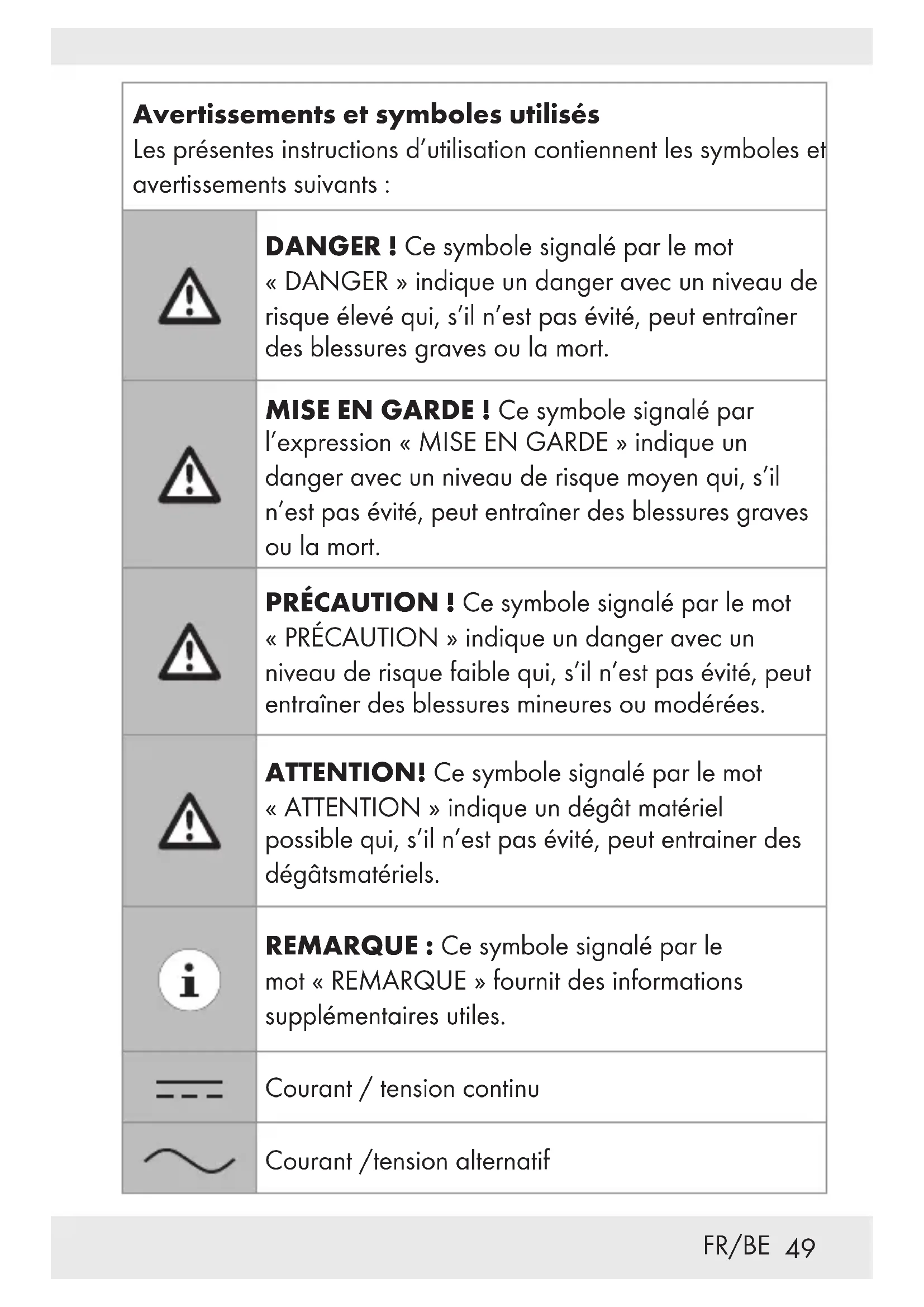 Avertissements et symboles utilisés... Page 49