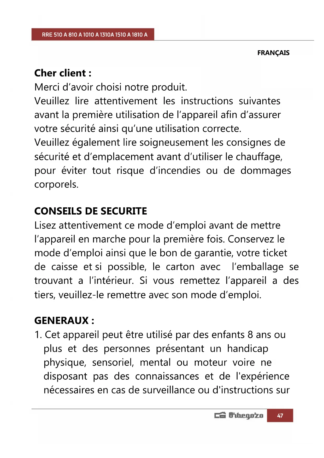 La directive européenne 2012/19/EU sur les Déchets des Equipements Electriques et Electroniques (DEEE), exige que les appareils ménagers usages ne soient pas jetés dans le flux normal des déchets municipaux. Les appareils usagés doivent être collectés séparément afin d’optimiser le taux de récupération et le recyclage des matériaux qui les composent, et réduire l’impact sur la santé humaine et l’environnement. Le symbole de la poubelle barrée est apposée sur tous les produits pour rappeler les obligations de collète séparée. Les consommateurs devront contacter les autorités locales ou leur revendeur concernant la démarche à suivre pour l’enlèvement de leur vieil appareil. DÉCLARATION DE CONFORMITÉ: Cet appareil est conforme aux exigences de la Directive Basse Tension 2014/35/EU et aux exigences de la directive EMC 2014/30/EU. GARANTIE Cet appareil est couvert et bénéficie de la garantie légale conformément à la législation en vigueur à compter de la date d'achat. Conservez le reçu d'achat pour pouvoir faire valoir votre droit à la garantie. Pour trouver le service le plus proche de votre emplacement, contactez via le lien Web suivant : https://orbegozo.com/asistencia-tecnica/ Pour tout type de requête, doute ou incident, vous pouvez nous contacter via notre e-mail indiqué sur la page principale de ce manuel ou via notre service d'assistance technique à https://orbegozo.com/contacto/ Orbegozo n'est pas responsable des composants et accessoires soumis à l'usure due à l'utilisation, ainsi que des composés périssables ou de ceux qui se sont détériorés en raison d'une mauvaise utilisation. Il ne sera pas non plus tenu responsable si le propriétaire a modifié techniquement l'appareil. Consultez les conditions légales sur notre site.RRE 510 A 810 A 1010 A 1310A 1510 A 1810 A