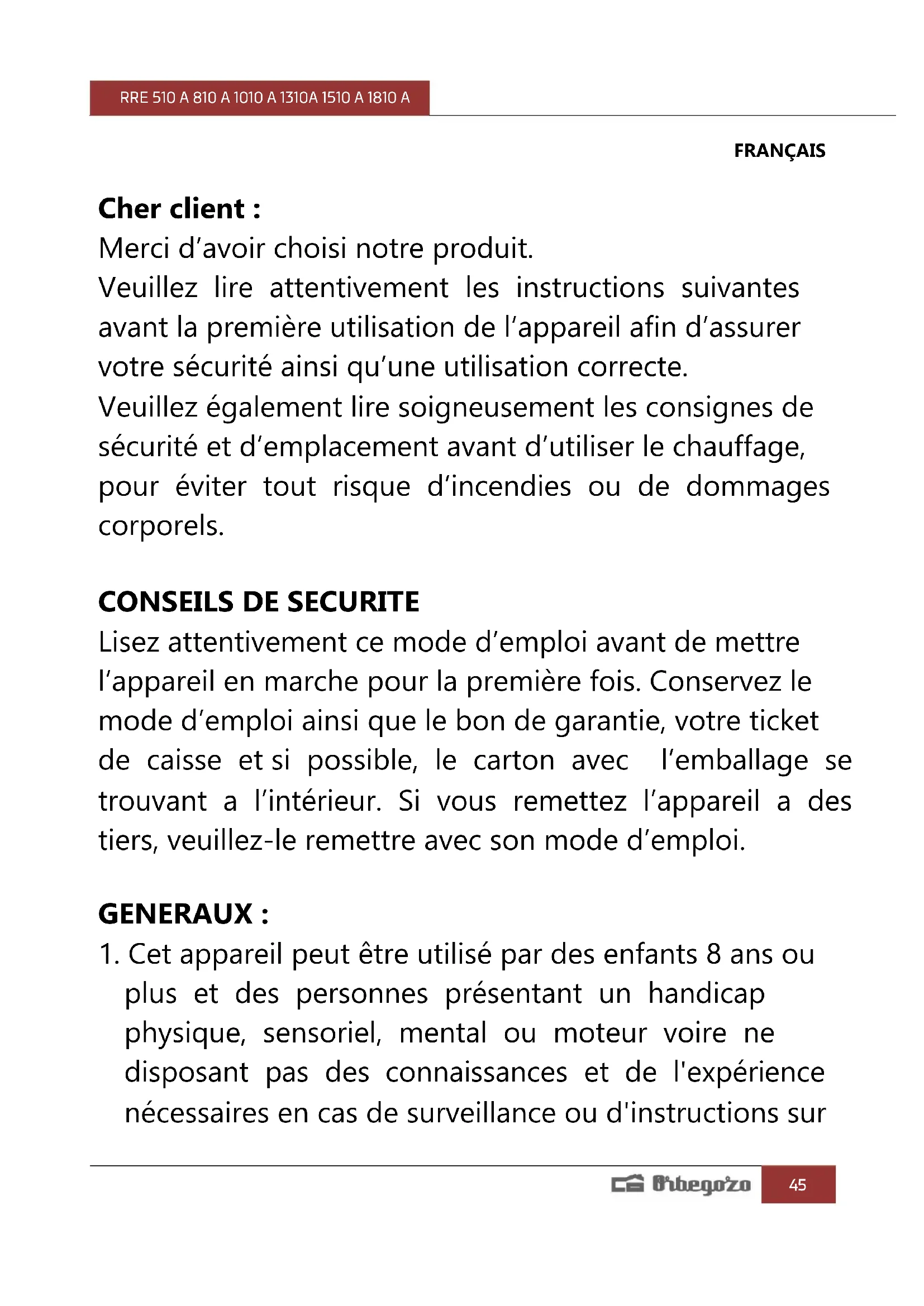 l'appareil, il y a un risque de blessure. MESURES DE SÉCURITÉ IMPORTANTES : Ce symbole reporté sur les étiquettes signifie “NE PAS COUVRIR”. ATTENTION : ne le couvrez jamais afin d’éviter une surchauffe. Enfants moins de 3 ans doivent être gardés hors de la portée de l'appareil à moins constamment surveillés. Enfants de 3 ans et de moins de 8 ans ne devraient allumer / éteindre l'appareil s'il a été placé ou installé dans sa position normale de fonctionnement et à condition qu'ils soient supervisés ou ont reçu des instructions sur l'utilisation de l'appareil dans un coffre-fort et comprendre les risques que l'appareil a. Les enfants de 3 ans et de moins de 8 ans doivent pas être branché régulière et propre de l'appareil ou d'effectuer l'entretien. ATTENTION: Certaines pièces de cet appareil peut chauffer et causer des brûlures. Il faut veiller enRRE 510 A 810 A 1010 A 1310A 1510 A 1810 A