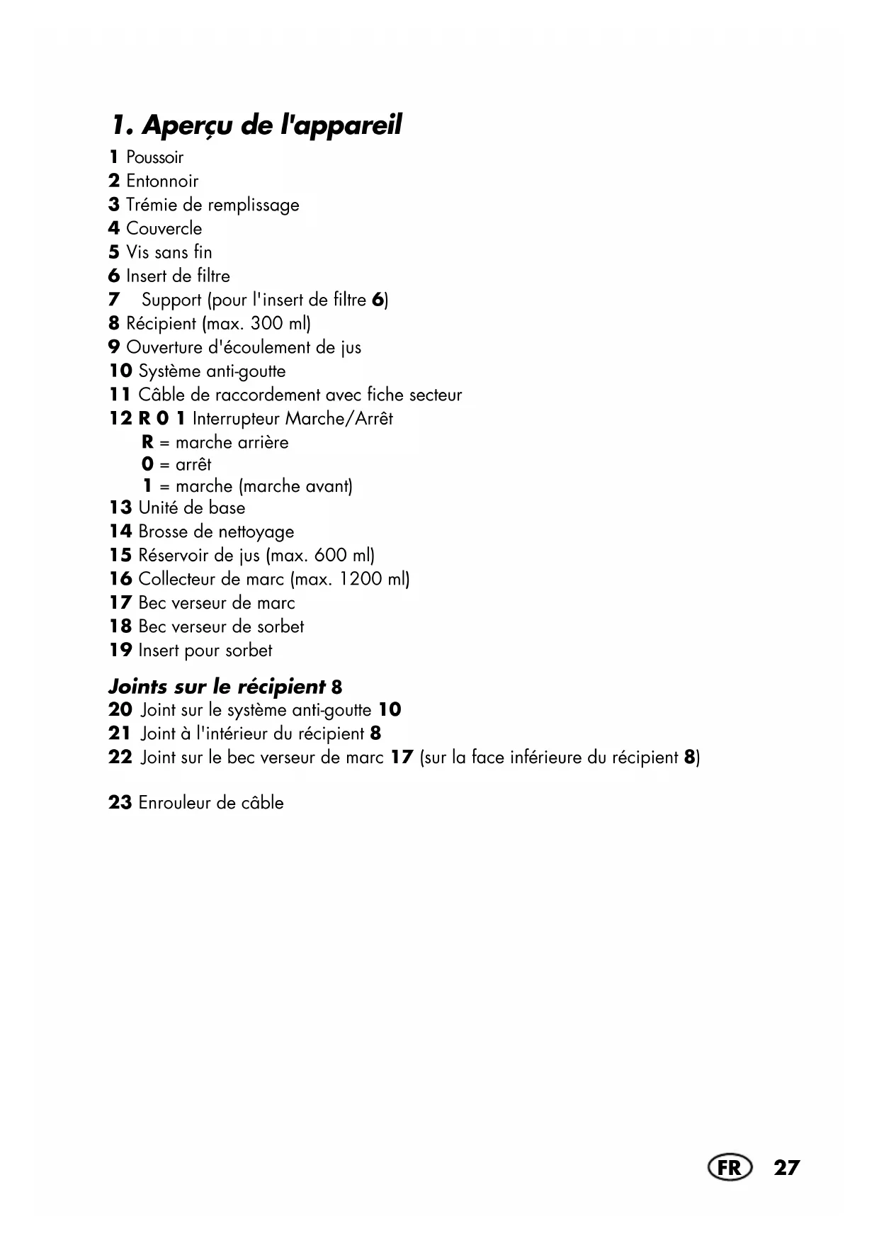 1 Poussoir 2 Entonnoir 3 Trémie de remplissage 4 Couvercle 5 Vis sans fin 6 Insert de filtre 7 Support (pour l'insert de filtre6) 8 Récipient (max. 300 ml) 9 Ouverture d'écoulement de jus 10 Système anti-goutte 11 Câble de raccordement avec fiche secteur 12 R 0 1 Interrupteur Marche/Arrêt R = marche arrière 0 = arrêt 1 = marche (marche avant) 13 Unité de base 14 Brosse de nettoyage 15 Réservoir de jus (max. 600 ml) 16 Collecteur de marc (max. 1200 ml) 17 Bec verseur de marc 18 Bec verseur de sorbet 19 Insert pour sorbet Joints sur le récipient8 20 Joint sur le système anti-goutte10 21 Joint à l'intérieur du récipient8 22 Joint sur le bec verseur de marc17 (sur la face inférieure du récipient8) 23 Enrouleur de câble __352263_2007_Slow_Juicer_B1.book Seite 27 Montag, 7. Dezember 2020 9:23 0928