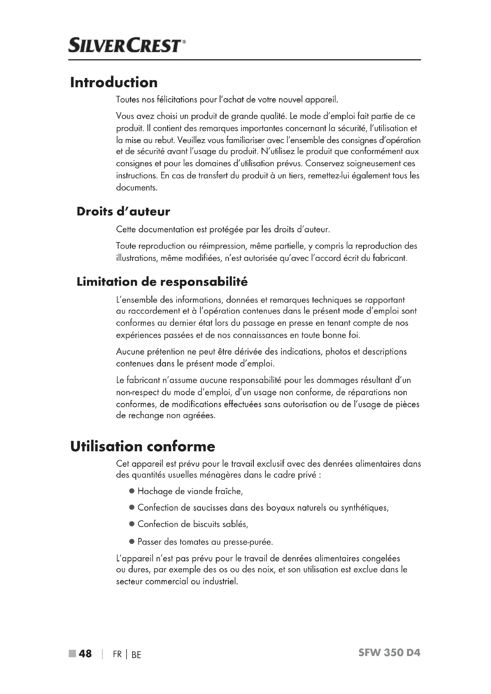 Introduction Toutes nos félicitations pour l’achat de votre nouvel appareil. Vous avez choisi un produit de grande qualité. Le mode d’emploi fait partie de ce produit. Il contient des remarques importantes concernant la sécurité, l’utilisation et la mise au rebut. Veuillez vous familiariser avec l’ensemble des consignes d’opération et de sécurité avant l’usage du produit. N’utilisez le produit que conformément aux consignes et pour les domaines d’utilisation prévus. Conservez soigneusement ces instructions. En cas de transfert du produit à un tiers, remettez-lui également tous les documents. Droits d’auteur Cette documentation est protégée par les droits d’auteur. Toute reproduction ou réimpression, même partielle, y compris la reproduction des illustrations, même modifiées, n’est autorisée qu’avec l’accord écrit du fabricant. Limitation de responsabilité L’ensemble des informations, données et remarques techniques se rapportant au raccordement et à l’opération contenues dans le présent mode d’emploi sont conformes au dernier état lors du passage en presse en tenant compte de nos expériences passées et de nos connaissances en toute bonne foi. Aucune prétention ne peut être dérivée des indications, photos et descriptions contenues dans le présent mode d’emploi. Le fabricant n’assume aucune responsabilité pour les dommages résultant d’un non-respect du mode d’emploi, d’un usage non conforme, de réparations non conformes, de modifications effectuées sans autorisation ou de l’usage de pièces de rechange non agréées. Utilisation conforme Cet appareil est prévu pour le travail exclusif avec des denrées alimentaires dans des quantités usuelles ménagères dans le cadre privé : ▯ Hachage de viande fraîche, ▯ Confection de saucisses dans des boyaux naturels ou synthétiques, ▯ Confection de biscuits sablés, ▯ Passer des tomates au presse-purée. L’appareil n’est pas prévu pour le travail de denrées alimentaires congelées ou dures, par exemple des os ou des noix, et son utilisation est exclue dans le secteur commercial ou industriel.SFW 350 D4