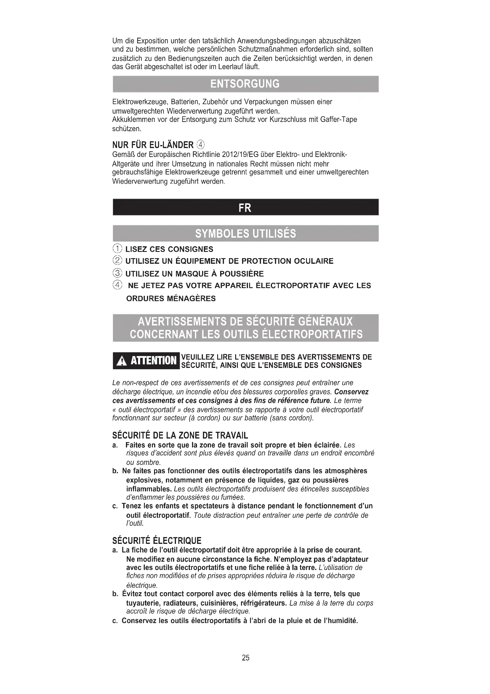 ATTENTION VEUILLEZ LIRE L’ENSEMBLE DES AVERTISSEMENTS DE SÉCURITÉ, AINSI QUE L’ENSEMBLE DES CONSIGNES Le non-respect de ces avertissements et de ces consignes peut entraîner une décharge électrique, un incendie et/ou des blessures corporelles graves. Conservez ces avertissements et ces consignes à des ns de référence future. Le terme « outil électroportatif » des avertissements se rapporte à votre outil électroportatif fonctionnant sur secteur (à cordon) ou sur batterie (sans cordon). SÉCURITÉ DE LA ZONE DE TRAVAIL a. Faites en sorte que la zone de travail soit propre et bien éclairée. Les risques d’accident sont plus élevés quand on travaille dans un endroit encombré ou sombre. b. Ne faites pas fonctionner des outils électroportatifs dans les atmosphères explosives, notamment en présence de liquides, gaz ou poussières inammables. Les outils électroportatifs produisent des étincelles susceptibles d’enammer les poussières ou fumées. c. Tenez les enfants et spectateurs à distance pendant le fonctionnement d’un outil électroportatif. Toute distraction peut entraîner une perte de contrôle de l’outil.