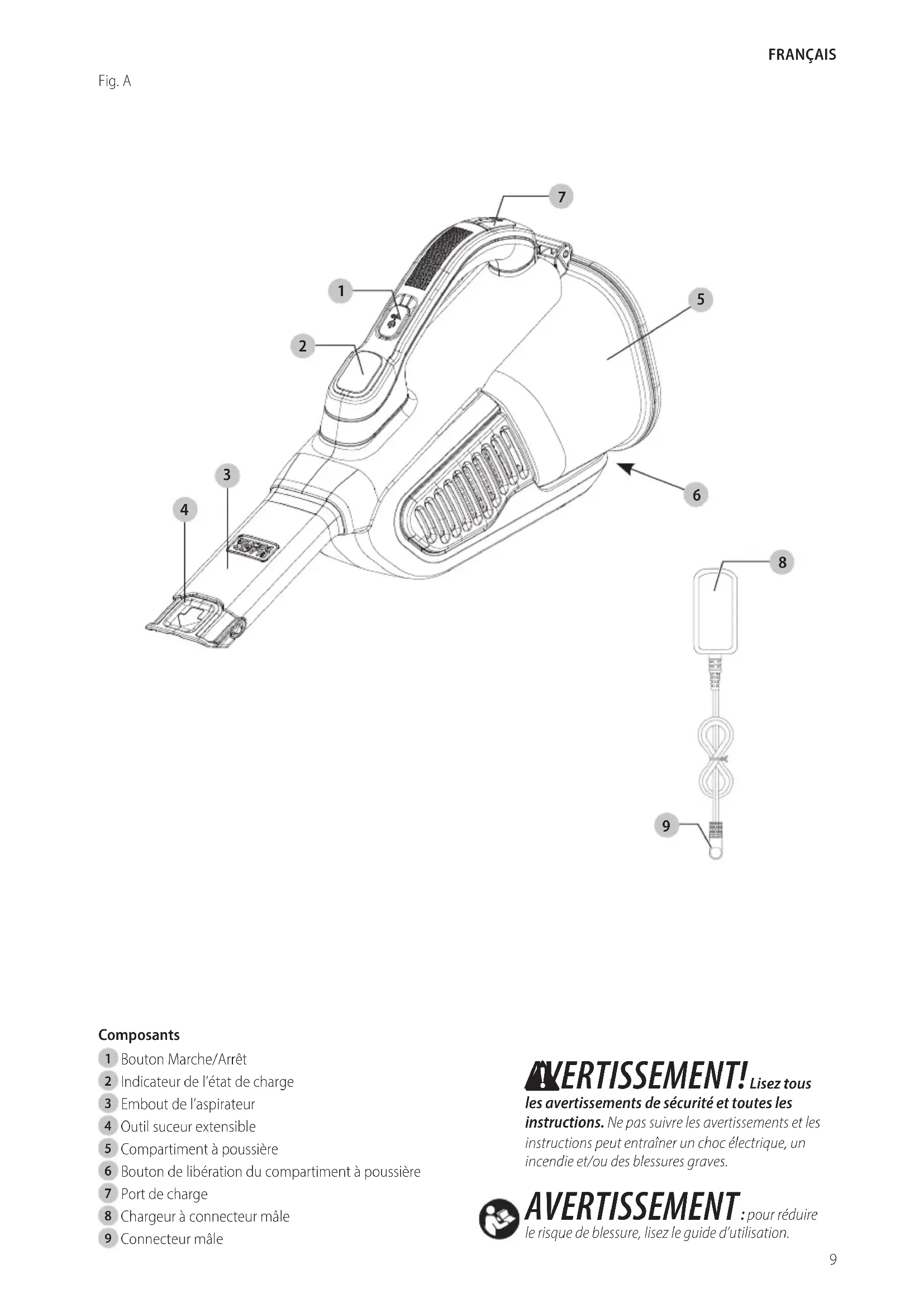 tout risque d’incendie, de choc électrique ou de dommages corporels:• Danger de choc électrique. Afin de vous protéger contre le risque de choc électrique, ne pas mettre la base de recharge dans l’eau ou autreliquide.• Ne pas la laisser être utilisée comme un jouet. Une attention particulière est nécessaire lorsqu’elle est utilisée par des enfants ou près desenfants.• Utilisez seulement comme décrit dans ce guide. Utilisez seulement les accessoires recommandés dufabricant.• Ne pas utiliser avec un cordon ou une fiche endommagée. Si l’outil ne fonctionne pas comme il le devrait, a été échappé, endommagé, laissé à l’extérieur ou échappé dans l’eau, retournez-le dans un centre de services.• Ne pas tirer ou transporter par le cordon, utiliser celui-ci comme une poignée, le passer sous une porte ou autour d'arêtes ou coins acérés. Ne pas passer la machine sur le cordon. Gardez le cordon hors de portée de surfaces chaudes.• Ne pas débrancher en tirant sur le cordon. Pour débrancher, saisissez la fiche, pas le cordon. • Ne pas toucher au chargeur ou sa fiche et ses contacts si vos mains sontmouillées.• Ne pas mettre tout objet dans les ouvertures. Ne pas utiliser si une ouverture est bloquée; tenez à l’écart de la poussière, de la charpie ainsi que des cheveux et de tout ce qui peut réduire la circulation del’air.• Gardez vos cheveux, vêtements amples, doigts et toutes les parties de votre corps loin des ouvertures et des pièces en mouvement del'outil.• Redoublez de prudence durant le nettoyaged'escaliers.• Ne pas utiliser pour ramasser des liquides combustibles ou inflammables, comme l’essence ou utiliser dans des endroits où ils sontprésents.• Ne pas ramasser tout ce qui brûle ou fume comme des cigarettes, des allumettes ou des cendreschaudes.• Ne pas utiliser sans le sac à poussière et/ou les filtres enplace.• Ne pas charger l’appareil àl’extérieur.• Utilisez seulement le chargeur fourni par le fabricant pourrecharger.• Ne pas incinérer l'appareil même s'il est sévèrement endommagé. Les piles peuvent exploser et causer unincendie.
