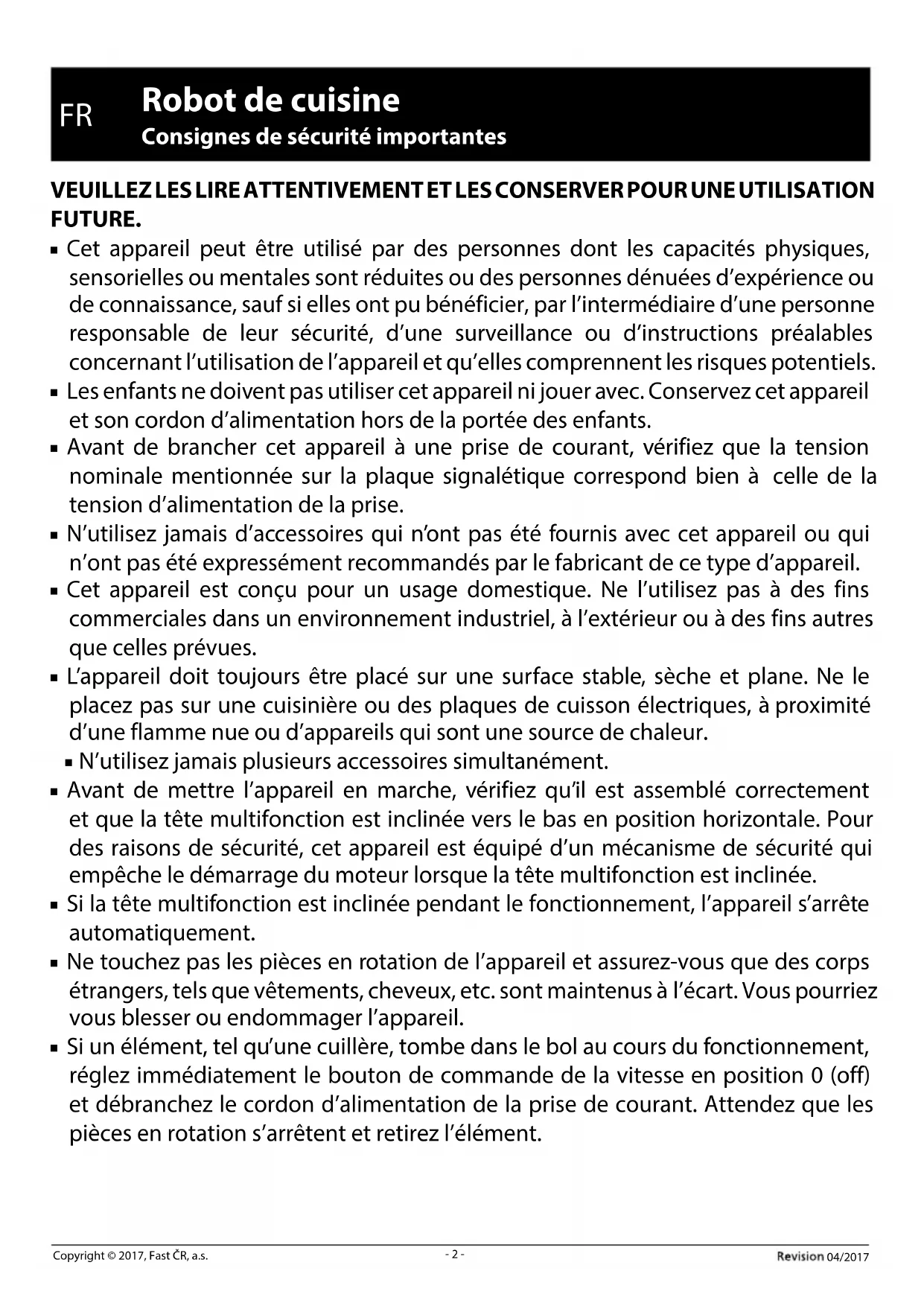 Robot de cuisine Consignes de sécurité importantes VEUILLEZ LES LIRE ATTENTIVEMENT ET LES CONSERVER POUR UNE UTILISATION FUTURE. ■ Cet appareil peut être utilisé par des personnes dont les capacités physiques, sensorielles ou mentales sont réduites ou des personnes dénuées d’expérience ou de connaissance, sauf si elles ont pu bénéficier, par l’intermédiaire d’une personne responsable de leur sécurité, d’une surveillance ou d’instructions préalables concernant l’utilisation de l’appareil et qu’elles comprennent les risques potentiels. ■ Les enfants ne doivent pas utiliser cet appareil ni jouer avec. Conservez cet appareil et son cordon d’alimentation hors de la portée des enfants. ■ Avant de brancher cet appareil à une prise de courant, vérifiez que la tension nominale mentionnée sur la plaque signalétique correspond bien à celle de la tension d’alimentation de la prise. ■ N’utilisez jamais d’accessoires qui n’ont pas été fournis avec cet appareil ou qui n’ont pas été expressément recommandés par le fabricant de ce type d’appareil. ■ Cet appareil est conçu pour un usage domestique. Ne l’utilisez pas à des fins commerciales dans un environnement industriel, àl’extérieur ou àdes fins autres que celles prévues. ■ L’appareil doit toujours être placé sur une surface stable, sèche et plane. Ne le placez pas sur une cuisinière ou des plaques de cuisson électriques, àproximité d’une flamme nue ou d’appareils qui sont une source de chaleur. ■ N’utilisez jamais plusieurs accessoires simultanément. ■ Avant de mettre l’appareil en marche, vérifiez qu’il est assemblé correctement et que la tête multifonction est inclinée vers le bas en position horizontale. Pour des raisons de sécurité, cet appareil est équipé d’un mécanisme de sécurité qui empêche le démarrage du moteur lorsque la tête multifonction est inclinée. ■ Si la tête multifonction est inclinée pendant le fonctionnement, l’appareil s’arrête automatiquement. ■ Ne touchez pas les pièces en rotation de l’appareil et assurez-vous que des corps étrangers, tels que vêtements, cheveux, etc. sont maintenus àl’écart. Vous pourriez vous blesser ou endommager l’appareil. ■ Si un élément, tel qu’une cuillère, tombe dans le bol au cours du fonctionnement, réglez immédiatement le bouton de commande de la vitesse en position 0 (off) et débranchez le cordon d’alimentation de la prise de courant. Attendez que les pièces en rotation s’arrêtent et retirez l’élément.04/2017