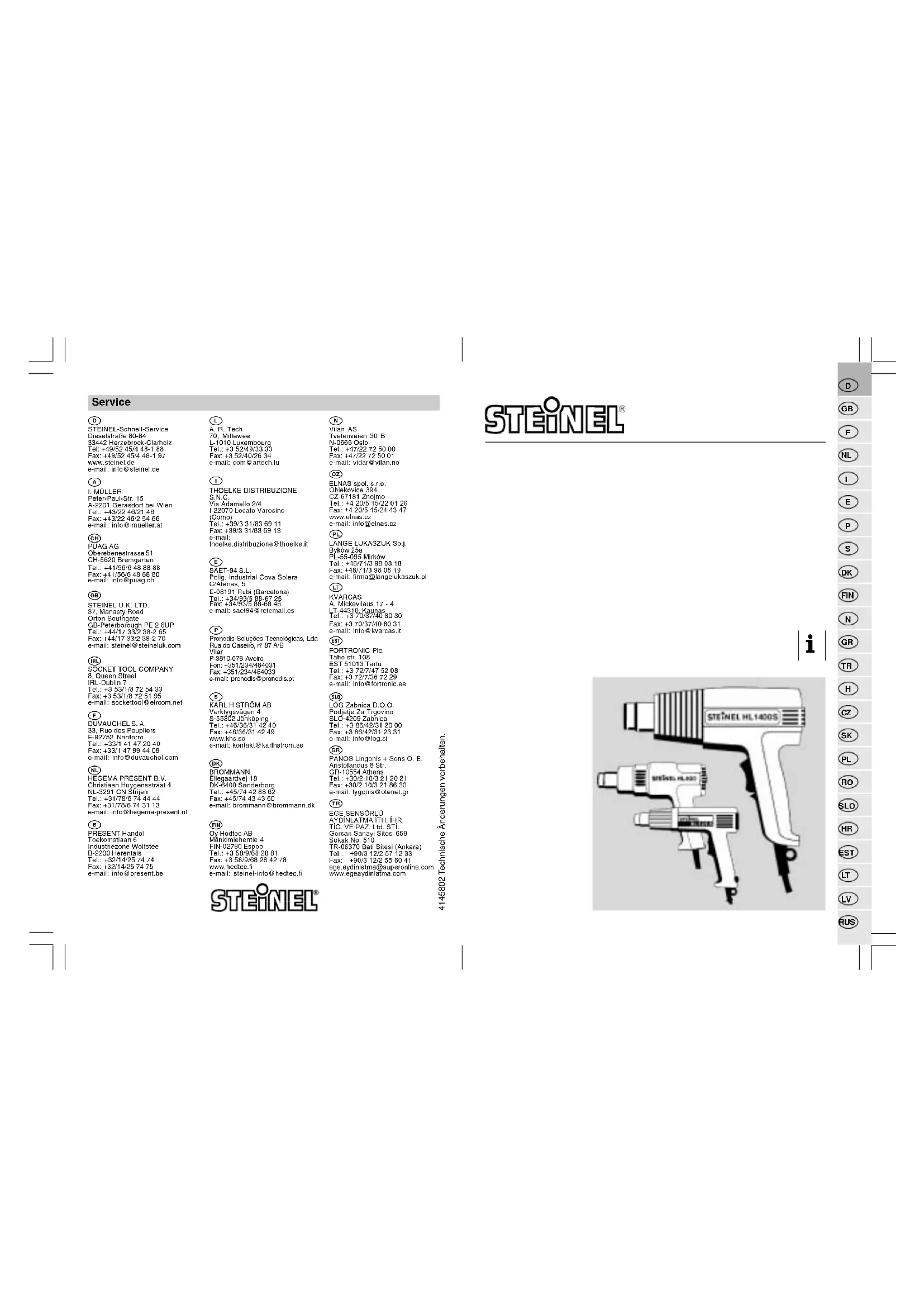Décollage ou pose de chants adhésifs. Caractéristiques techniques HL 500 HL 525 S/HL 1400 S Tension: 230 V ~ C.A. 230 V ~ C.A. Puissance: 1500 W 1400 W Températures: Position 1 = environ 300°C Position 1 = environ 300°C Position 2 = environ 525°C Position 2 = environ 500°C (à 5 mm devant le tube de propulsion d'air) (à 5 mm devant le tube de propulsion d'air) Débit d'air: Position 1 = environ 240 l/min Position 1 = environ 240 l/min Position 2 = environ 450 l/min Position 2 = environ 450 l/min Poids: 550 g 550 g Déclaration de conformité Ce produit répond aux pre- scriptions de la directive basse tension 73/23/CEE et de la directive Compatibilité électro- magnétique 89/336/CEE. Service après-vente et garantie Ce produit STEINEL a été fabriqué avec le plus grand soin. Son fonctionnement et sa sécurité ont été contrôlés suivant des procédures fiables et il a été soumis à un contrôle final par sondage. STEINEL garantit un état et un fonctionnement irréprochables. La durée de garantie est de 36 mois ou 500 heures d'utili- sation et débute au jour de la vente au consommateur. Nous remédions aux défauts prove- nant d'un vice de matière ou de construction. La garantie sera assurée à notre discrétion par réparation ou échange des pièces défectueuses. La garantie ne s'applique ni aux pièces d'usure, ni aux dommages et défauts dus à une utilisation ou maintenance incorrectes, ni aux bris de piè- ces consécutifs à une chute. Les dommages consécutifs causés à d'autres objets sont exclus de la garantie. La garantie ne s'applique que si l'appareil non démonté est retourné à la station de service après-vente la plus proche, dans un emballage adéquat, accompagné d'une facture ou d'un ticket de caisse portant la date d'achat et le cachet du vendeur ou s'il est remis au vendeur dans les 6 premiers mois de la garantie. Service de réparation : Le service après-vente de notre usine effectue également les réparations non couvertes par la garantie ou survenant après l'expiration de celle-ci. Veuillez envoyer le produit correctement emballé à la station de service après-vente la plus proche. FR쎱 Lees de gebruiksaan- wijzing nauwkeurig door en neem de veilig- heidsvoorschriften in acht. – Bij het gebruik van elek- trische apparaten moeten ter voorkoming van elek- trische schokken, licha- melijk letsel en brandge- vaar de volgende veilig- heidsvoorschriften in acht worden genomen. – Lees de voorschriften nauwkeurig door voordat u het apparaat gebruikt. – Berg de gebruiksaan- wijzing en de veiligheids- voorschriften zorgvuldig op.