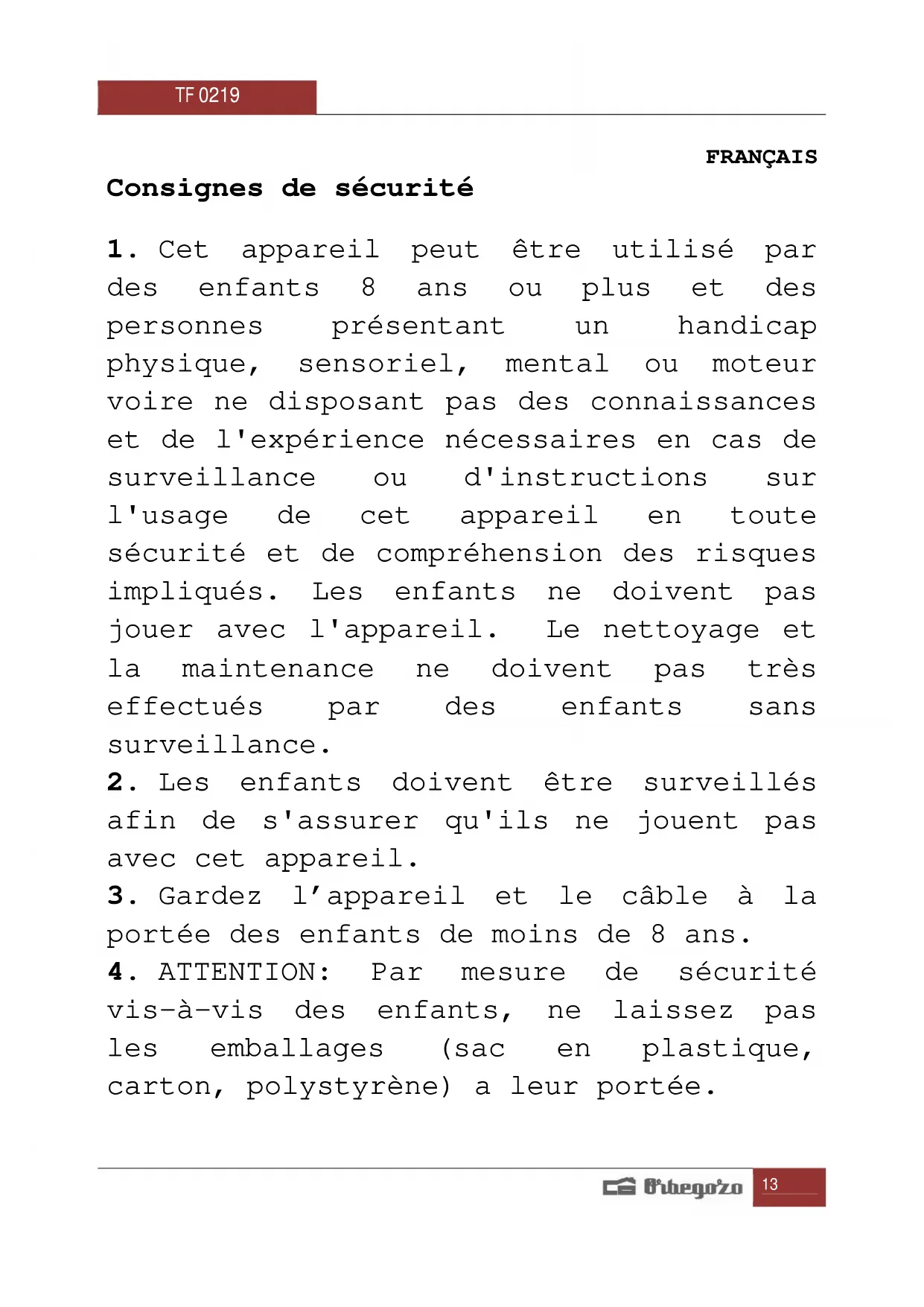 Retrouvez gratuitement la notice de l'appareil TF 0219 Orbegozo au format PDF.