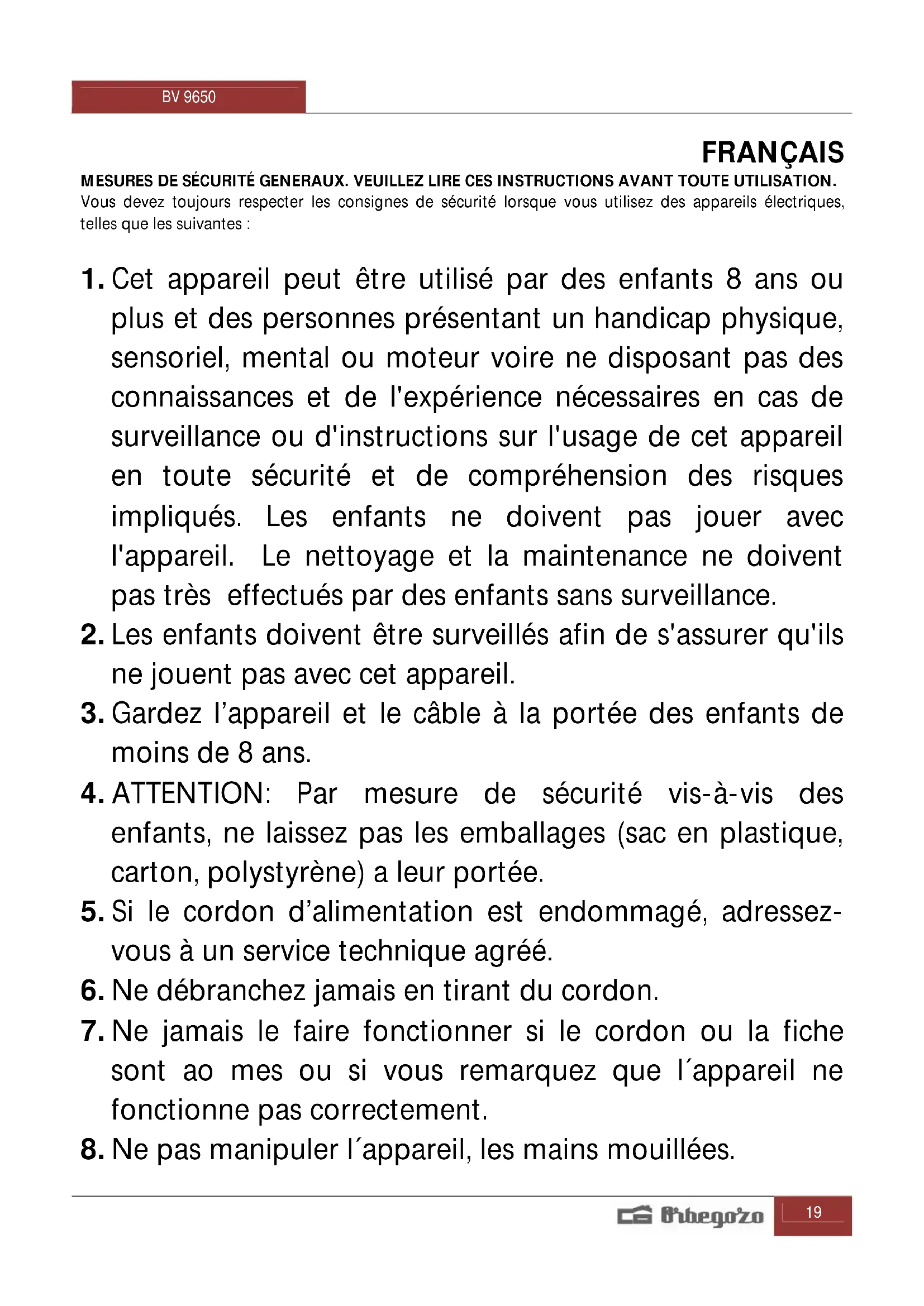 8. Ne pas manipuler l´appareil, les mains mouillées.BV 9650