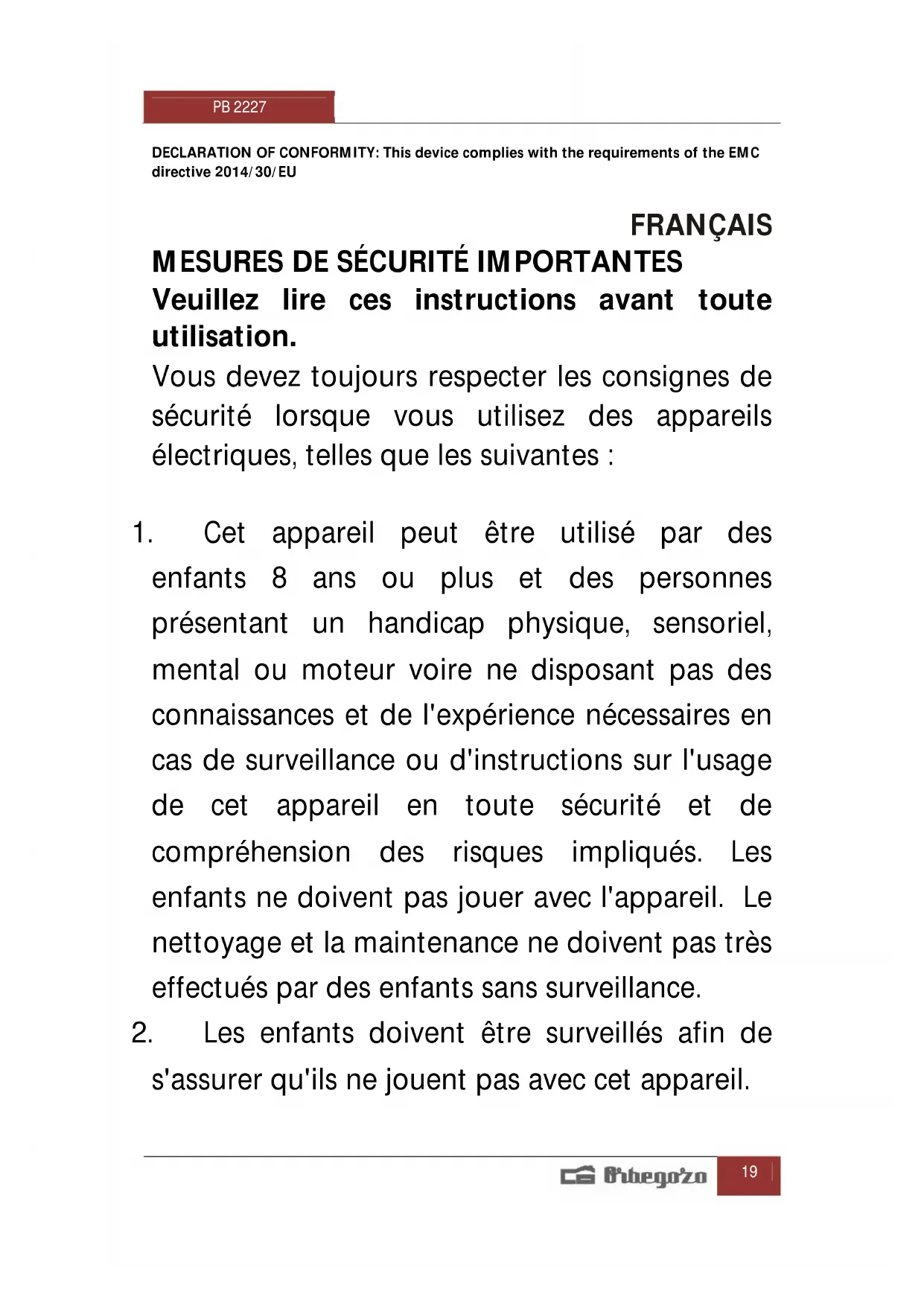 A. Les volumes des pourcentages de graisses et d'eau estimés par le pèse- personne impédancemètre ne constituent qu’une référence (il ne s’agit pas d'un outil médical). Si vos masses graisseuses et hydriques se situent au-dessus ou au-dessous du niveau normal, veuillez consulter un médecin pour un avis professionnel. B. Éloignez l’appareil de tout objet ayant un fort champ électromagnétique lors de l'utilisation. C. L’appareil peut glisser si vous vous pesez sur une surface humide. Ne montez jamais sur le bord de l’appareil et gardez votre équilibre pendant la pesée si la surface du plateau est vitrée. D. ATTENTION: Par mesure de sécurité vis-à-vis des enfants, ne laissez pas les emballages (sac en plastique, carton, polystyrène) a leur portée.PB 2227