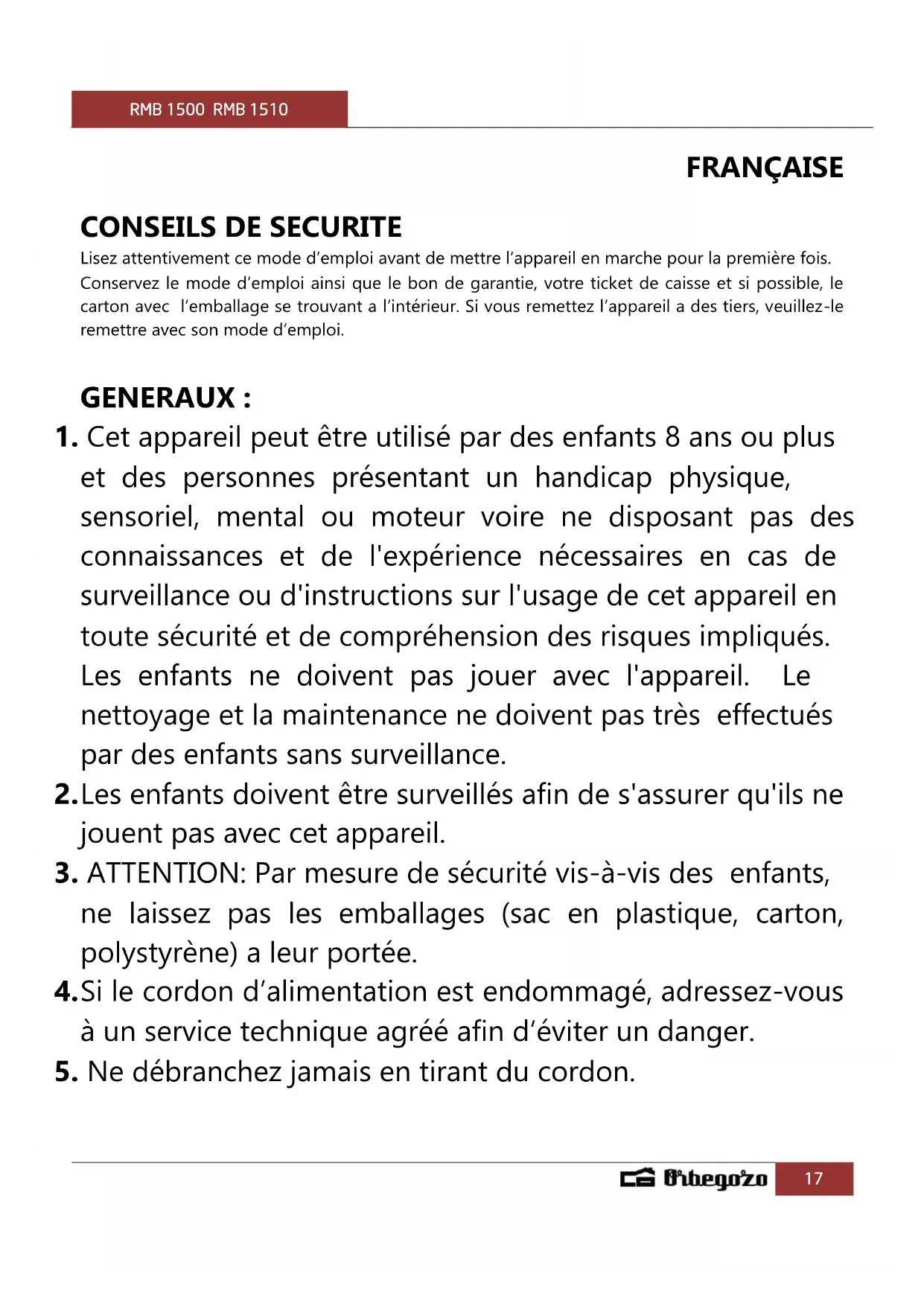 La directive européenne 2012/19/EU sur les Déchets des Equipements Electriques et Electroniques (DEEE), exige que les appareils ménagers usages ne soient pas jetés dans le flux normal des déchets municipaux. Les appareils usagés doivent être collectés séparément afin d’optimiser le taux de récupération et le recyclage des matériaux qui les composent, et réduire l’impact sur la santé humaine et l’environnement. Le symbole de la poubelle barrée est apposée sur tous les produits pour rappeler les obligations de collète séparée. Les consommateurs devront contacter les autorités locales ou leur revendeur concernant la démarche à suivre pour l’enlèvement de leur vieil appareil. DÉCLARATION DE CONFORMITÉ: Cet appareil est conforme aux exigences de la Directive Basse Tension 2014/35/EU et aux exigences de la directive EMC 2014/30/EU. GARANTIE Cet appareil est couvert et bénéficie de la garantie légale conformément à la législation en vigueur à compter de la date d'achat. Conservez le reçu d'achat pour pouvoir faire valoir votre droit à la garantie. Pour trouver le service le plus proche de votre emplacement, contactez via le lien Web suivant : https://orbegozo.com/asistencia-tecnica/ Pour tout type de requête, doute ou incident, vous pouvez nous contacter via notre e-mail indiqué sur la page principale de ce manuel ou via notre service d'assistance technique à https://orbegozo.com/contacto/ Orbegozo n'est pas responsable des composants et accessoires soumis à l'usure due à l'utilisation, ainsi que des composés périssables ou de ceux qui se sont détériorés en raison d'une mauvaise utilisation. Il ne sera pas non plus tenu responsable si le propriétaire a modifié techniquement l'appareil. Consultez les conditions légales sur notre site.RMB 1500 RMB 1510