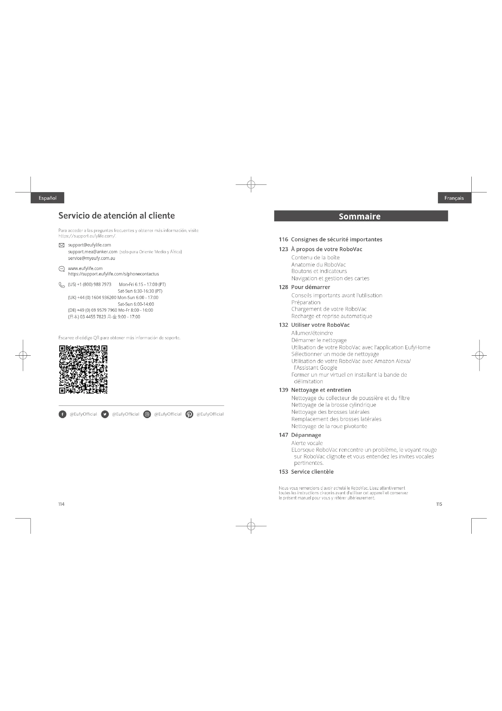Nous vous remercions d'avoir acheté le RoboVac. Lisez attentivement toutes les instructions ci-après avant d’utiliser cet appareil et conservez le présent manuel pour vous y référer ultérieurement. Sommaire Servicio de atención al cliente Para acceder a las preguntas frecuentes y obtener más información, visite https://support.eufylife.com/. support@eufylife.com support.mea@anker.com (solo para Oriente Medio y África) service@myeufy.com.au (US) +1 (800) 988 7973 Mon-Fri 6:15 - 17:00 (PT) Sat-Sun 6:30-16:30 (PT) (UK) +44 (0) 1604 936200 Mon-Sun 6:00 - 17:00 Sat-Sun 6:00-14:00 (DE) +49 (0) 69 9579 7960 Mo-Fr 8:00 - 16:00 (日本) 03 4455 7823 月-金 9:00 - 17:00 www.eufylife.com https://support.eufylife.com/s/phonecontactus Escanee el código QR para obtener más información de soporte. 116Consignesdesécuritéimportantes 123 ÀproposdevotreRoboVac Contenu de la boîte Anatomie du RoboVac Boutons et indicateurs Navigation et gestion des cartes 128 Pourdémarrer Conseils importants avant l'utilisation Préparation Chargement de votre RoboVac Recharge et reprise automatique 132 UtiliservotreRoboVac Allumer/éteindre Démarrer le nettoyage Utilisation de votre RoboVac avec l'application EufyHome Sélectionner un mode de nettoyage Utilisation de votre RoboVac avec Amazon Alexa/ l'Assistant Google Former un mur virtuel en installant la bande de délimitation 139 Nettoyageetentretien Nettoyage du collecteur de poussière et du ltre Nettoyage de la brosse cylindrique Nettoyage des brosses latérales Remplacement des brosses latérales Nettoyage de la roue pivotante 147 Dépannage Alerte vocale ELorsque RoboVac rencontre un problème, le voyant rouge sur RoboVac clignote et vous entendez les invites vocales pertinentes. 153 ServiceclientèleFrançais Français