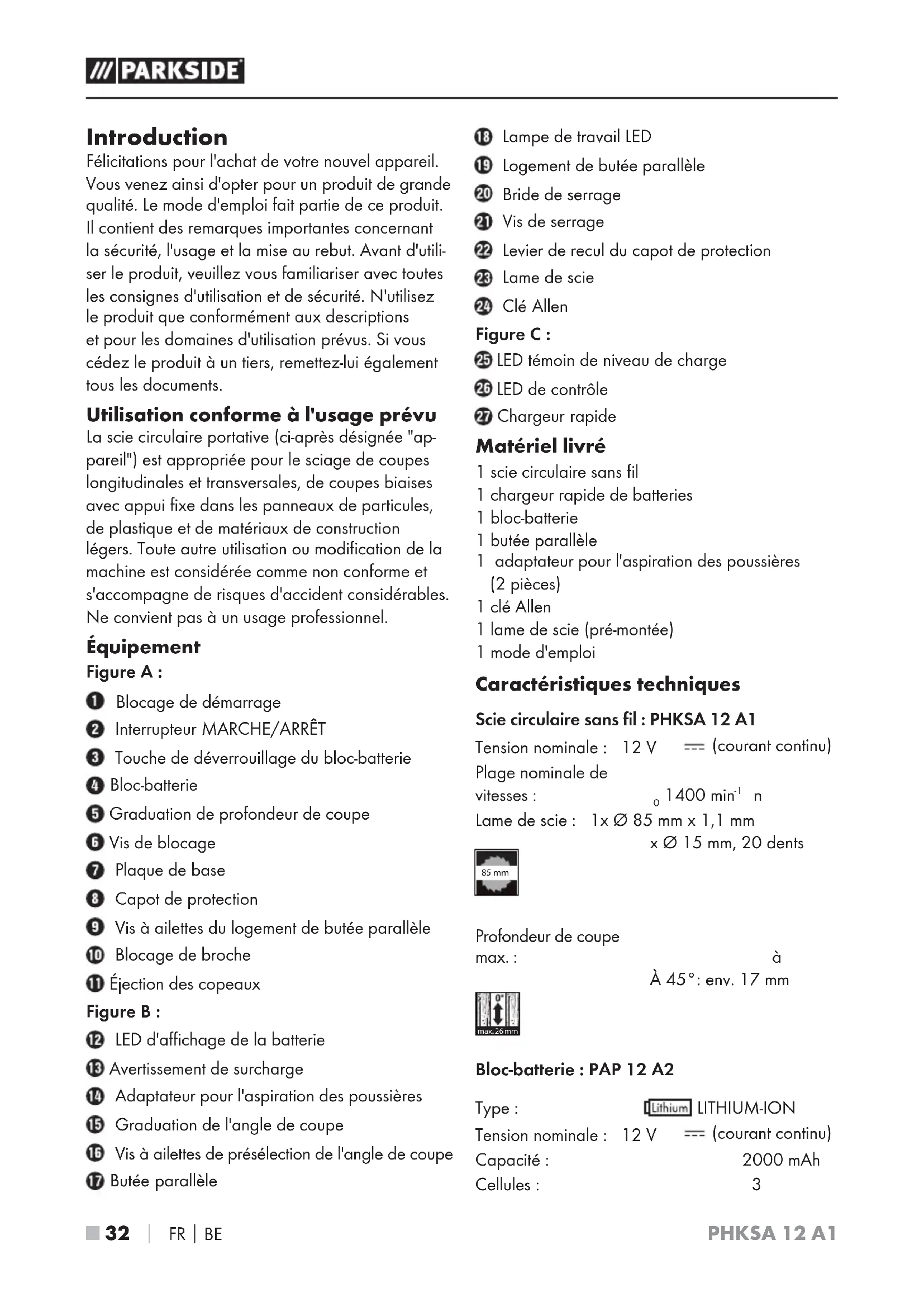 Introduction Félicitations pour l'achat de votre nouvel appareil. Vous venez ainsi d'opter pour un produit de grande qualité. Le mode d'emploi fait partie de ce produit. Il contient des remarques importantes concernant la sécurité, l'usage et la mise au rebut. Avant d'utili- ser le produit, veuillez vous familiariser avec toutes les consignes d'utilisation et de sécurité. N'utilisez le produit que conformément aux descriptions et pour les domaines d'utilisation prévus. Si vous cédez le produit à un tiers, remettez-lui également tous les documents. Utilisation conforme à l'usage prévu La scie circulaire portative (ci-après désignée "ap- pareil") est appropriée pour le sciage de coupes longitudinales et transversales, de coupes biaises avec appui fixe dans les panneaux de particules, de plastique et de matériaux de construction légers. Toute autre utilisation ou modification de la machine est considérée comme non conforme et s'accompagne de risques d'accident considérables. Ne convient pas à un usage professionnel. Équipement Figure A: Blocage de démarrage Interrupteur MARCHE/ARRÊT Touche de déverrouillage du bloc-batterie Bloc-batterie Graduation de profondeur de coupe Vis de blocage Plaque de base Capot de protection Vis à ailettes du logement de butée parallèle Blocage de broche Éjection des copeaux Figure B: LED d'affichage de la batterie Avertissement de surcharge Adaptateur pour l'aspiration des poussières Graduation de l'angle de coupe Vis à ailettes de présélection de l'angle de coupe Butée parallèle Lampe de travail LED Logement de butée parallèle Bride de serrage Vis de serrage Levier de recul du capot de protection Lame de scie Clé Allen Figure C: LED témoin de niveau de charge LED de contrôle Chargeur rapide Matériel livré 1 scie circulaire sans fil 1 chargeur rapide de batteries 1 bloc-batterie 1 butée parallèle 1 adaptateur pour l'aspiration des poussières (2 pièces) 1 clé Allen 1 lame de scie (pré-montée) 1 mode d'emploi Caractéristiques techniques Scie circulaire sans fil: PHKSA 12 A1 Tension nominale: 12V (courant continu) Plage nominale de vitesses: n