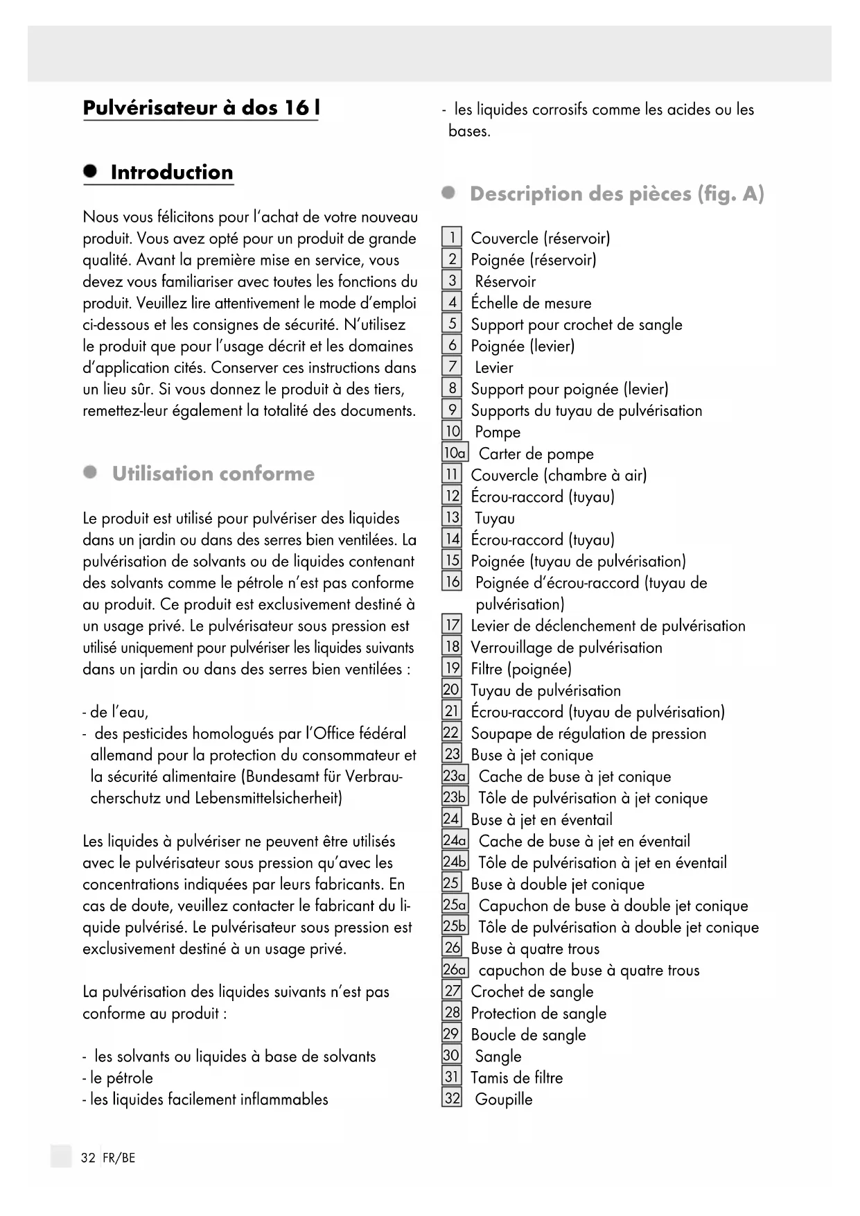 Contenu de la livraison 1 pulvérisateur sous pression 1 tuyau de pulvérisation 1 paires de courroies de transport 1 tuyau 1 manuel contenant les instructions de mon- tage, d’utilisation et de sécurité Pièces de rechange: 1 piston 4 disques d’étanchéité Ø16 mm 2 bagues d’étanchéité Ø15 mm 2 bagues d’étanchéité Ø18,5 mm 2 douilles de serrage 1 dispositif d’aligne- ment 1 support pour poignée34 FR/BE Consignes de sécurité Instructions générales de sécurité