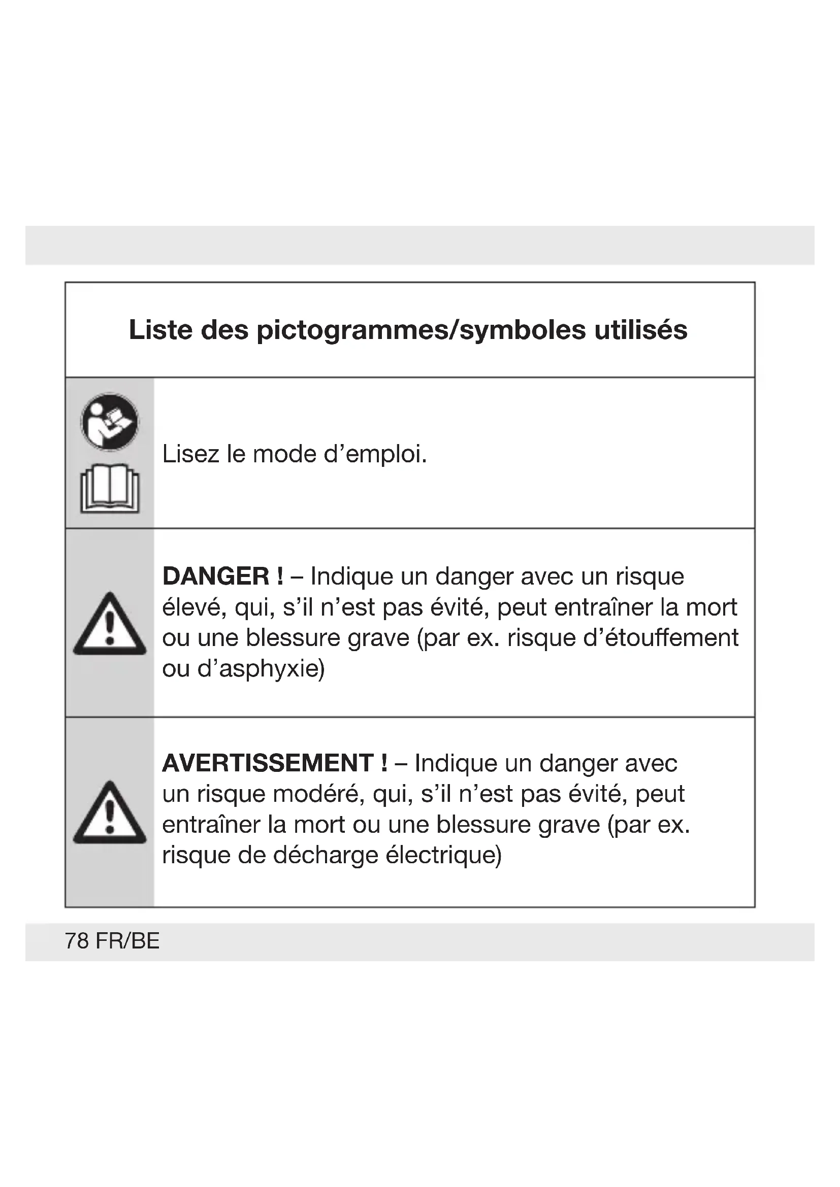 AVERTISSEMENT! Ne jetez pas la batterie avec les déchets ménagers, au feu ou dans l’eau. N’exposez pas la batterie au rayonnement puissant du soleil pendant une longue période, et ne la posez pas sur des radiateurs (maximum 45°C). Manipulation et utilisation d’outils sans l Chargez les batteries uniquement avec les chargeurs appartenant à la série X12VTEAM. Lorsqu'un chargeur est adapté à seulement un certain type de batteries, il existe un risque d’incendie s’il est utilisé avec d’autres batteries. Utilisez seulement les batteries prévues pour ce type d'outils électriques. L’utilisation d’autres batteries peut provoquer des blessures et représente un risque d’incendie.89FR/BE Éloignez la batterie non utilisés de trombones, pièces de monnaie, clés, clous, vis ou autres petits objets métalliques qui pourraient provoquer un pontage des contacts. Un court‑circuit entre les contacts de la batterie peut causer des brûlures ou provoquer un incendie. Lors d'une mauvaise utilisation, un liquide peut fuir de la batterie. Évitez tout contact avec celui‑ci. En cas de contact involontaire, rincez avec de l’eau. Si du liquide pénètre dans les yeux, consultez également un médecin. Le liquide s’écoulant de la batterie peut conduire à des irritations de la peau ou des brûlures. N'utilisez pas de batterie endommagée ou modiée. Les batteries endommagées ou modiées peuvent se comporter de manière imprévisible et provoquer un incendie, une explosion ou entraîner un risque de blessure.90 FR/BE N’exposez pas une batterie à un feu ou à des températures élevées. Des feux ou températures supérieures à +130°C peuvent entraîner une explosion. Respectez toutes les instructions de chargement et ne rechargez jamais la batterie ou l'outil sans l en dehors de la plage de température spéciée dans le mode d'emploi. Une charge incorrecte ou une charge en dehors de la plage de température admise peut détruire la batterie et augmenter le risque d'incendie. Maintenance N'eectuez aucune maintenance sur des batteries endommagées. Toute maintenance de batteries doit être eectuée seulement par le fabricant ou par des services après‑vente agréés. Consignes de sécurité spéciales concernant les appareils à batterie Assurez‑vous que l’appareil est éteint avant d'insérer la batterie. L'insertion d'une batterie dans un outil électrique sous tension peut entraîner des accidents.91FR/BE Chargez vos batteries uniquement en intérieur, le chargeur étant conçu pour cela. An de réduire le risque d'une décharge électrique, débranchez la che du chargeur de la prise de courant avant de le nettoyer. N’exposez pas la batterie au rayonnement puissant du soleil pendant une longue période, et ne la posez pas sur des radiateurs. La chaleur détériore la batterie et il existe un risque d'explosion. Laissez refroidir une batterie qui a chaué avant de la charger. N'ouvrez pas la batterie et évitez toute détérioration mécanique. Il existe un risque de court‑circuit et des vapeurs risquent de s'échapper pouvant irriter les voies respiratoires. Veillez à une arrivée d'air frais et consultez immédiatement un médecin en cas de troubles. Ne rechargez jamais de batteries non rechargeables. L’appareil risquerait d’être détérioré.92 FR/BE Utilisation correcte du chargeur de batterie Les enfants doivent être surveillés pour garantir qu’ils ne jouent pas avec l’appareil. Avant chaque utilisation, vériez le chargeur, le câble et la prise et faites-le réparer par un personnel qualié et uniquement avec des pièces de rechange d'origine. N'utilisez pas un chargeur défectueux et ne l'ouvrez pas vous‑même. Ceci assure que la sûreté de l’appareil est maintenue. Veillez à ce que la tension du secteur corresponde aux indications de la plaque signalétique sur le chargeur. Il y a un risque de décharge électrique. Gardez le chargeur propre et à l'abri de l'humidité et de la pluie. N'utilisez jamais le chargeur à l'extérieur. L'encrassement et la pénétration d'eau augmentent le risque de choc électrique. Le chargeur ne doit être utilisé qu'avec les batteries originales correspondantes. La charge d’autres batteries peut provoquer des blessures et représente un risque d’incendie.93FR/BE Évitez d'endommager mécaniquement le chargeur. Ils peuvent provoquer des courts‑circuits internes. Le chargeur ne doit pas être utilisé sur ou à proximité immédiate de supports inammables (par ex. papier, textiles). Il existe un risque d'incendie en raison de l'échauement qui se produit lors de la charge. Si le cordon d’alimentation servant au branchement de cet appareil est endommagé, il doit être remplacé soit par le fabricant ou par son service après‑vente, soit par un personnel qualié an d’éviter tout danger. La batterie de votre appareil n'est livrée que partiellement préchargée et doit être correctement chargée pour la première fois avant utilisation. Insérez la batterie dans le socle et branchez le chargeur sur le secteur. Débranchez la che secteur lorsque la batterie est complètement chargée et déconnectez la batterie du chargeur. Ne rechargez jamais de piles non rechargeables dans le chargeur.94 FR/BE N'utilisez aucun accessoire non recommandé par le fabricant. Cela peut conduire à une électrocution ou déclencher un feu. Mise en service Déballage du produit et premier nettoyage