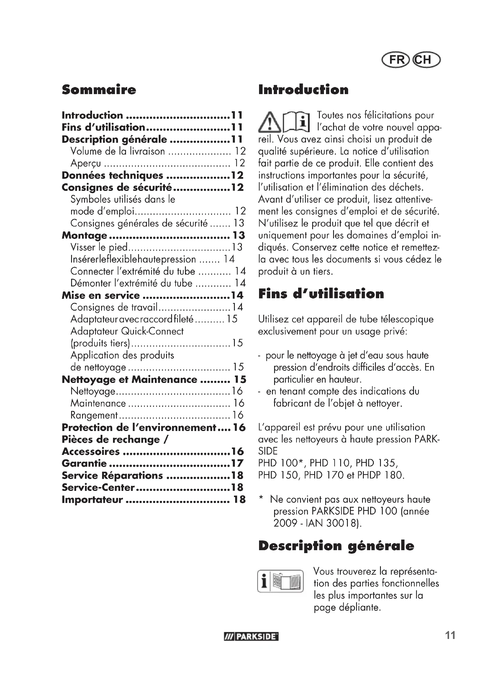 - Ne convient pas aux nettoyeurs haute pression PARKSIDE PHD 100 (année 2009 - IAN 30018). Description générale Vous trouverez la représenta- tion des parties fonctionnelles les plus importantes sur la page dépliante. Sommaire Introduction ...............................11 Fins d’utilisation .........................11 Description générale ..................11 Volume de la livraison ..................... 12 Aperçu .......................................... 12 Données techniques ...................12 Consignes de sécurité .................12 Symboles utilisés dans le mode d’emploi................................ 12 Consignes générales de sécurité ....... 13 Montage .................................... 13 Visser le pied .................................. 13 Insérer le exible haute pression ....... 14 Connecter l‘extrémité du tube ........... 14 Démonter l’extrémité du tube ............ 14 Mise en service ..........................14 Consignes de travail ........................ 14 Adaptateur avec raccord leté .......... 15 Adaptateur Quick-Connect (produits tiers) ................................. 15 Application des produits de nettoyage .................................. 15 Nettoyage et Maintenance ......... 15 Nettoyage ...................................... 16 Maintenance .................................. 16 Rangement ..................................... 16 Protection de l’environnement .... 16 Pièces de rechange / Accessoires ................................16 Garantie ....................................17 Service Réparations ...................18 Service-Center ............................18 Importateur ............................... 1812 FR CH 19 Raccord du coude 20 Levier d‘enclenchement 21 Verrouillage d‘enclenchement 22 Support pour ceinture 23 Poignée et verrouillage rotatif 24 Déverrouillage du exible haute pression 25 Adaptateur pour raccord leté de tuyau à haute pression 26 Adaptateur pour tuyau à haute pression Quick-Connect (produits tiers) 27 Agrafes de sécurité pour le Quick-Connect (produits tiers) Données techniques Tube télescopique ............. PTL 4 B3 Adapté pour des appareils avec les indications de puissance suivantes: Pression de fonctionnement (p) .........................15 MPa / 2175 psi Pression admissible (p max) ..................18 MPa / 2611 psi Débit max. (Q max).....................450 l/h Température d‘entrée (T max) ........................60 °C / 140 °F Consignes de sécurité Cette section traite des principales normes de sécurité lors du travail avec l’appareil. Symboles utilisés dans le mode d’emploi Symbole de danger et indica- tions relatives à la prévention de dommages corporels ou matériels. Volume de la livraison Déballez l‘appareil et contrôlez le volume des livraisons : - Tube télescopique, en plusieurs parties - Embout à jet plat - Coude - Coffret de fusibles - Flexible haute pression - Pied - Bandoulière - Adaptateur pour raccord leté de tuyau à haute pression - Adaptateur pour tuyau à haute pression Quick-Connect (produits tiers) - Agrafes de sécurité pour le Quick- Connect (produits tiers) - Notice d’utilisation Aperçu 1 Embout à jet plat 2 Coude 3 Coffret de fusibles 4 Troisième tube télescopique 5 Deuxième tube télescopique 6 Premier tube télescopique 7 Tube principal 8 Surface de poignée 9 Bandoulière 10 Ouverture du exible haute pres- sion 11 Poignée 12 Raccord du exible haute pres- sion 13 Déverrouillage du exible haute pression 14 Pied 15 Alimentation en eau 16 Déverrouillage de l‘alimentation en eau 17 Flexible haute pression 18 Raccord du tube télescopique13 FR CH Symboles de remarque et informa- tions permettant une meilleure utili- sation de l‘appareil. Consignes générales de sécurité