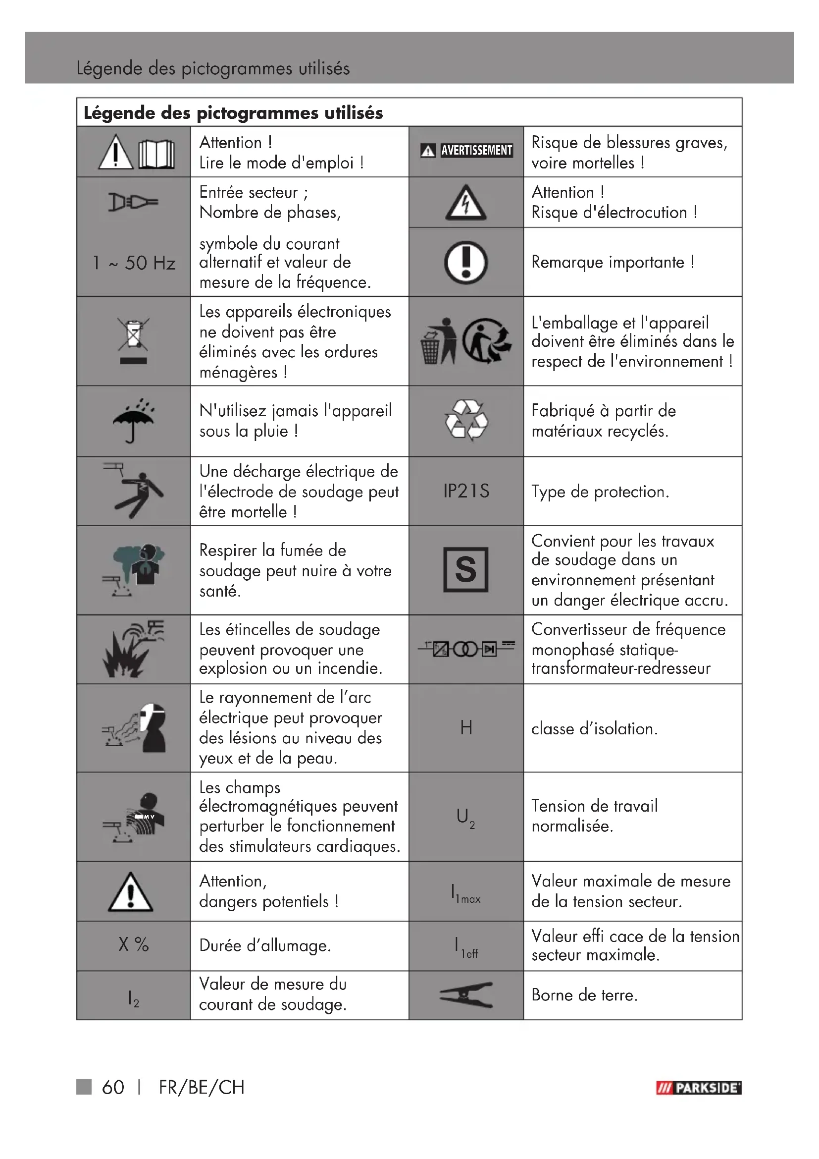 1eff. = 8,9 A Courbe caractéristique Descendante Des modifi cations techniques et visuelles peuvent être apportées sans préavis dans le cadre du développement continu. Pour cette raison, toutes les dimensions, remarques et indications de ce mode d'emploi sont fournies sans garantie. Toute prétention légale formu- lée sur la base de ce mode d'emploi ne pourra donc faire valoir d'aucun droit. Remarque: Le terme «appareil» employé dans le texte ci-après se rapporte au poste à souder multi-procédés décrit dans le présent mode d’emploi. Consignes de sécurité Veuillez lire le mode d'emploi et en observer les consignes avec la plus grande attention. Utilisez le présent mode d'emploi pour vous familiariser avec l'appareil, son utilisation conforme et les consignes de sécurité. La plaque signalétique comprend toutes les données techniques de ce poste à souder. Veuillez vous informer des caractéristiques technique de cet appareil. AVERTISSEMENT Tenir les emballages hors de portée des enfants. Risque d'étouffement. Cet appareil peut être uti- lisé par des enfants à partir de 16ans ainsi que par des personnes avec des capaci- tés physiques, sensorielles ou mentales réduites ou manquant d'expérience et de connais- sances, s'ils sont surveillés ou s'ils ont été formés à une uti- lisation sûre de l'appareil et qu'ils comprennent les risques qui en découlent. Les enfants ne doivent pas jouer avec l'ap- pareil. Le nettoyage et la main- tenance utilisateur ne doivent Introduction / Consignes de sécurité65FR/BE/CH pas être réalisés par des enfants sans surveillance. Les réparations et/ou les tra- vaux de maintenance doivent être effectués uniquement par des électriciens qualifi és. Utiliser uniquement les câbles de soudage fournis avec l’appareil (PMSG 200 A1 H01N2-D1x16mm²). En cours d'utilisation, l'ap- pareil ne doit pas être posé directement contre un mur ni recouvert ou entouré d'autres appareils, de manière à garan- tir une aération toujours suffi - sante par les fentes d'aération. Assurez-vous que l'appareil est correctement raccordé à la tension secteur. Évitez toute traction sur le câble d'alimenta- tion. Débranchez la fi che sec- teur de la prise murale avant de déplacer l'appareil. Lorsque l'appareil n'est pas utilisé, éteignez-le toujours à l'aide du bouton Marche/ Arrêt. Déposez le porte-élec- trodes sur une surface isolée et attendez 15minutes avant de retirer les électrodes, afi n d'éviter de vous brûler. Vérifi ez l'état du câble de sou- dage, du porte-électrodes et des bornes de masse. Toute trace d'usure sur l'isolation et les parties conductrices peut constituer un danger et réduire la qualité de la soudure. Le soudage à l'arc produit des étincelles, des particules de métal fondu et de la fumée. Aussi, respectez les consignes suivantes: éliminez l'ensemble des substances et/ou maté- riaux infl ammables du poste de travail et de son environne- ment direct. Veillez à la bonne aération du poste de travail. Ne travaillez pas sur des contenants, récipients ou tuyaux contenant ou ayant contenu des liquides ou gaz infl ammables. AVERTISSEMENT Évitez tout contact direct avec le circuit électrique de soudage. La tension en circuit ouvert entre la pince porte-électrodes et la borne de masse présente un danger de choc électrique. Ne stockez pas l'appareil dans un environnement humide ou sous la pluie. L'appareil bénéfi cie de l'indice de protec- tion IP21S. Protégez vos yeux avec des verres de protection prévus à cet effet (DIN degré9–10), Consignes de sécurité66 FR/BE/CH que vous fi xerez sur le masque de soudage fourni avec l'ap- pareil. Portez des gants et des vêtements de protection secs, exempts de traces d'huile et de graisse, pour protéger votre peau du rayonnement ultravio- let de l'arc électrique. AVERTISSEMENT N'utilisez pas la source de courant de sou- dage pour dégeler des tuyaux. Remarque: Le rayonnement de l'arc peut provoquer des lésions ocu- laires et des brûlures cutanées. Le soudage à l'arc produit des étincelles et des gouttes de métal fondu, la pièce trai- tée devient incandescente et reste très chaude relativement longtemps. Ne touchez pas la pièce traitée à mains nues. Le soudage à l'arc produit des vapeurs toxiques. Veillez à ne pas les inhaler. Protégez-vous des effets dan- gereux de l'arc et veillez à ce que les personnes présentes se tiennent à au moins 2m lorsque vous travaillez. ATTENTION! L'utilisation du poste à souder peut perturber l'alimentation en tension d'autres utilisateurs en fonction du point de raccor- dement au secteur. En cas de doute, consultez votre fournis- seur d’électricité. L'utilisation du poste à souder peut entraîner le dysfonction- nement d'autres appareils, comme les appareils auditifs, les stimulateurs cardiaques, etc. Sources de danger lors de travaux de soudage à l'arc Le soudage à l'arc présente différentes sources de danger. Le soudeur doit donc impérati- vement respecter les règles sui- vantes pour ne mettre personne en danger et ne pas endomma- ger l'appareil. Seul un électricien spécialisé est habilité à réaliser des tra- vaux côté secteur, par ex. sur des câbles, des prises,etc., toujours dans le respect des dispositions nationales et locales en vigueur. En cas d'accident, débranchez le poste à souder du secteur. En présence de tensions élec- triques de contact, éteignez Consignes de sécurité67FR/BE/CH immédiatement l'appareil et faites-le vérifi er par un électri- cien spécialisé. Vérifi ez que les contacts élec- triques sont toujours en bon état côté courant de soudage. Portez toujours des gants lorsque vous réalisez des travaux de soudage. Ils vous protègeront des chocs élec- triques (tension en circuit ouvert du circuit de courant de soudage), des rayonnements nocifs (rayonnement thermique et UV), du métal incandescent et des éclats de métal. Portez des chauss