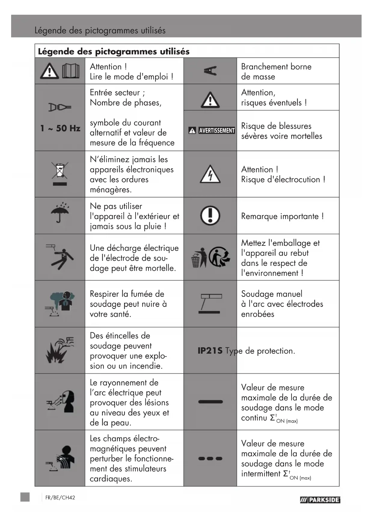 Risque de blessures sévères voire mortelles N’éliminez jamais les appareils électroniques avec les ordures ménagères. Attention! Risque d'électrocution! Ne pas utiliser l'appareil à l'extérieur et jamais sous la pluie! Remarque importante! Une décharge électrique de l'électrode de sou- dage peut être mortelle. Mettez l'emballage et l'appareil au rebut dans le respect de l'environnement! Respirer la fumée de soudage peut nuire à votre santé. Soudage manuel à l'arc avec électrodes enrobées Des étincelles de soudage peuvent provoquer une explo- sion ou un incendie. IP21S Type de protection. Le rayonnement de l’arc électrique peut provoquer des lésions au niveau des yeux et de la peau. Valeur de mesure maximale de la durée de soudage dans le mode continu Σ