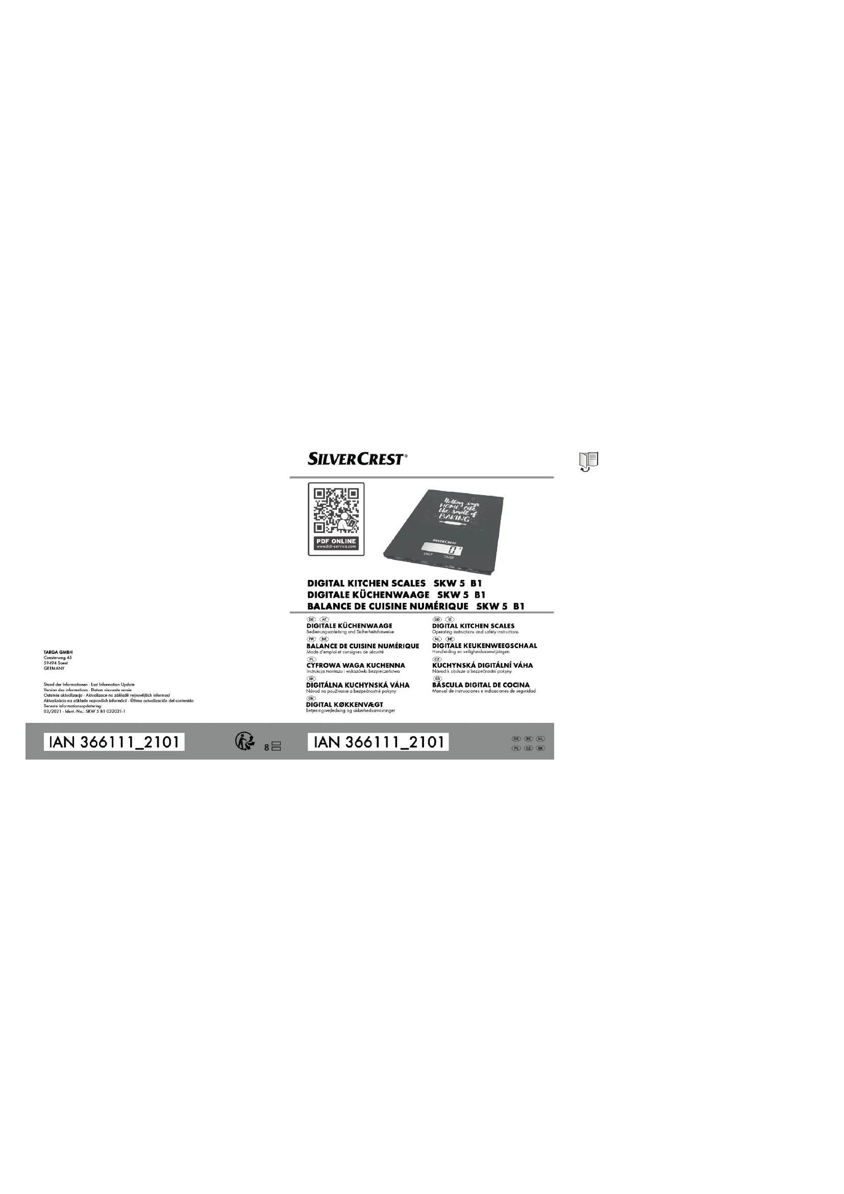 Garantie de TARGA GmbH Cher client, chère cliente, La garantie accordée sur ce produit est de trois ans à partir de la date d'achat. En cas de vice sur ce produit, vous disposez de droits que vous pouvez faire valoir vis-à-vis du vendeur du produit. L’exercice de ces droits n’est pas limité par notre garantie exposée ci-après. Conditions de garantie La période de garantie commence à la date d’achat. Merci de conserver soigneusement le ticket de caisse d’origine. Il vous sera demandé comme preuve d’achat. Si un vice matériel ou de fabrication survient dans les trois ans qui suivent la date d’achat de ce produit, le produit sera réparé ou remplacé gratuitement, le choix restant à notre discrétion. Période de garantie et droits résultant de vices La période de garantie n’est pas prolongée en cas de son exercice. La même chose s’applique pour les pièces remplacées et réparées. Les dégâts et vices éventuellement présents dès l’achat doivent être signalés immédiatement dès le déballage. Une fois la période de garantie écoulée, toute réparation est payante.SilverCrest SKW 5 B1
