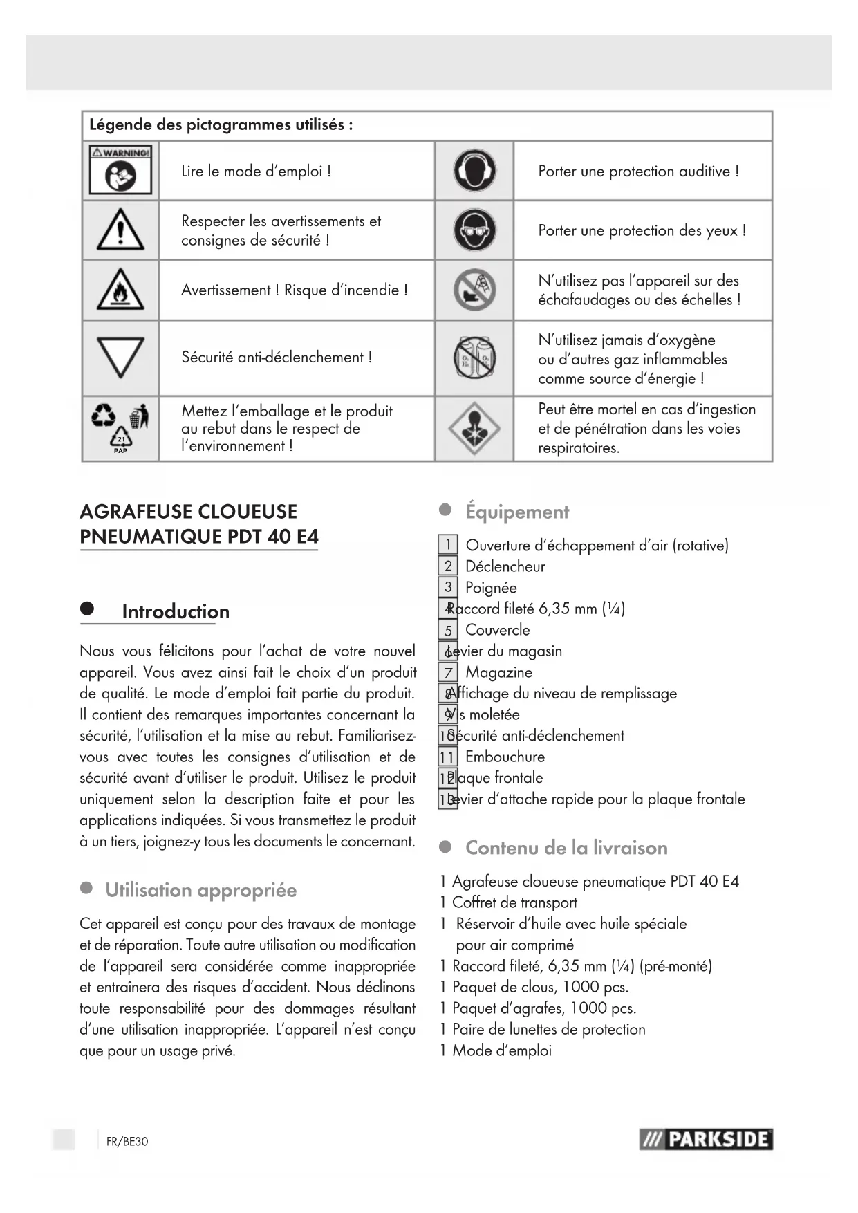 Contenu de la livraison 1 Agrafeuse cloueuse pneumatique PDT 40 E4 1 Coffret de transport 1 Réservoir d’huile avec huile spéciale pour air comprimé 1 Raccord fileté, 6,35 mm (¼) (pré-monté) 1 Paquet de clous, 1000 pcs. 1 Paquet d’agrafes, 1000 pcs. 1 Paire de lunettes de protection 1 Mode d’emploi Lire le mode d’emploi ! Respecter les avertissements et consignes de sécurité! Avertissement! Risque d’incendie! Porter une protection auditive! Porter une protection des yeux! Sécurité anti-déclenchement! N’utilisez pas l’appareil sur des échafaudages ou des échelles! N’utilisez jamais d’oxygène ou d’autres gaz inflammables comme source d’énergie! Mettez l‘emballage et le produit au rebut dans le respect de l‘environnement ! Légende des pictogrammes utilisés :