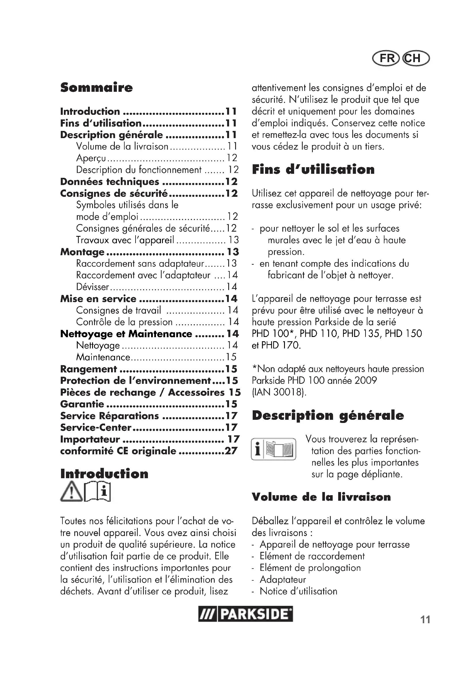- et PHD 170. *Non adapté aux nettoyeurs haute pression Parkside PHD 100 année 2009 (IAN 30018). Description générale Vous trouverez la représen- tation des parties fonction- nelles les plus importantes sur la page dépliante. Volume de la livraison Déballez l‘appareil et contrôlez le volume des livraisons : - Appareil de nettoyage pour terrasse - Elément de raccordement - Elément de prolongation - Adaptateur - Notice d’utilisation Introduction Toutes nos félicitations pour l’achat de vo- tre nouvel appareil. Vous avez ainsi choisi un produit de qualité supérieure. La notice d’utilisation fait partie de ce produit. Elle contient des instructions importantes pour la sécurité, l’utilisation et l’élimination des déchets. Avant d’utiliser ce produit, lisez Sommaire Introduction p. 11