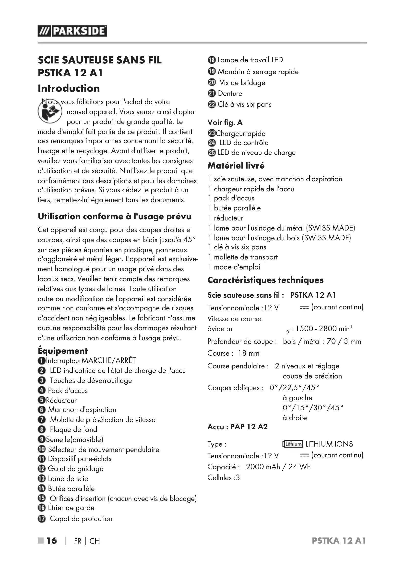 PSTKA 12 A1 Introduction Nous vous félicitons pour l'achat de votre nouvel appareil. Vous venez ainsi d'opter pour un produit de grande qualité. Le mode d'emploi fait partie de ce produit. Il contient des remarques importantes concernant la sécurité, l'usage et le recyclage. Avant d'utiliser le produit, veuillez vous familiariser avec toutes les consignes d'utilisation et de sécurité. N'utilisez le produit que conformément aux descriptions et pour les domaines d'utilisation prévus. Si vous cédez le produit à un tiers, remettez-lui également tous les documents. Utilisation conforme à l'usage prévu Cet appareil est conçu pour des coupes droites et courbes, ainsi que des coupes en biais jusqu'à 45° sur des pièces équarries en plastique, panneaux d'aggloméré et métal léger. L'appareil est exclusive- ment homologué pour un usage privé dans des locaux secs. Veuillez tenir compte des remarques relatives aux types de lames. Toute utilisation autre ou modification de l'appareil est considérée comme non conforme et s'accompagne de risques d'accident non négligeables. Le fabricant n'assume aucune responsabilité pour les dommages résultant d'une utilisation non conforme à l'usage prévu. Équipement Interrupteur MARCHE/ARRÊT LED indicatrice de l'état de charge de l'accu Touches de déverrouillage Pack d'accus Réducteur Manchon d'aspiration Molette de présélection de vitesse Plaque de fond Semelle (amovible) Sélecteur de mouvement pendulaire Dispositif pare-éclats Galet de guidage Lame de scie Butée parallèle Orifices d'insertion (chacun avec vis de blocage) Étrier de garde Capot de protection Lampe de travail LED Mandrin à serrage rapide Vis de bridage Denture Clé à vis six pans Voir fig. A Chargeur rapide LED de contrôle LED de niveau de charge Matériel livré 1 scie sauteuse, avec manchon d'aspiration 1 chargeur rapide de l'accu 1 pack d'accus 1 butée parallèle 1 réducteur 1 lame pour l'usinage du métal (SWISS MADE) 1 lame pour l'usinage du bois (SWISS MADE) 1 clé à vis six pans 1 mallette de transport 1 mode d'emploi Caractéristiques techniques Scie sauteuse sans fil : PSTKA 12 A1 Tension nominale: 12V (courant continu) Vitesse de course à vide: n