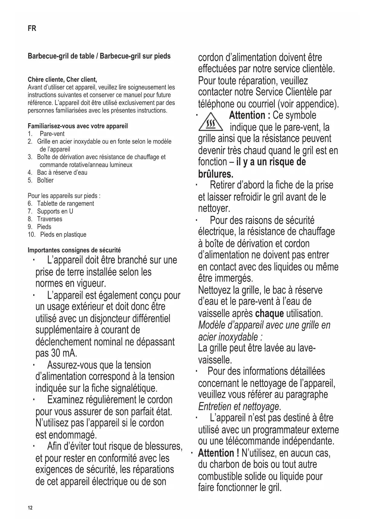 Attention : Ce symbole indique que le pare-vent, la grille ainsi que la résistance peuvent devenir très chaud quand le gril est en fonction – il y a un risque de brûlures. ∙ Retirer d’abord la che de la prise et laisser refroidir le gril avant de le nettoyer. ∙ Pour des raisons de sécurité électrique, la résistance de chauffage à boîte de dérivation et cordon d’alimentation ne doivent pas entrer en contact avec des liquides ou même être immergés. Nettoyez la grille, le bac à réserve d’eau et le pare-vent à l’eau de vaisselle après chaque utilisation. Modèle d’appareil avec une grille en acier inoxydable : La grille peut être lavée au lave- vaisselle. ∙ Pour des informations détaillées concernant le nettoyage de l’appareil, veuillez vous référer au paragraphe Entretien et nettoyage. ∙ L’appareil n’est pas destiné à être utilisé avec un programmateur externe ou une télécommande indépendante. ∙ Attention ! N’utilisez, en aucun cas, du charbon de bois ou tout autre combustible solide ou liquide pour faire fonctionner le gril. FR13 142 x 208 mm ∙ Attention : Ne couvrez pas la grille avec des feuilles d’aluminium, des plats à barbecue ou autres articles car l’accumulation de chaleur qui en résulterait pourrait endommager sérieusement le gril. ∙ Le bac à réserve d’eau ne peut contenir au maximum que 1,1 litre d’eau. ∙ Cet appareil est destiné à être utilisé dans des applications domestiques et analogues telles que : - des coins cuisines réservés au personnel dans des magasins, bureaux et autres environnements professionnels ; - des fermes ; - l’utilisation par les clients des hôtels, motels et autres environnements à caractère résidentiel ; - des environnements de type chambres d’hôtes. ∙ Cet appareil peut être utilisé par des enfants (à partir de 8 ans) et par des personnes souffrant de déciences physiques, sensorielles ou mentales, ou manquant d’expérience ou de connaissances, s’ils ont été formés à l’utilisation de l’appareil et ont été supervisés, et s’ils en comprennent les dangers et les précautions de sécurité à prendre. ∙ Les enfants ne sont pas autorisés à jouer avec l’appareil. ∙ Les enfants ne doivent pas être autorisés à nettoyer ou entretenir l’appareil à moins d’être supervisés et d’avoir plus de 8 ans. ∙ L’appareil et son cordon d’alimentation doivent être, à tout moment, tenus hors de portée des enfants de moins de 8 ans. ∙ Attention : Tenez les enfants à l’écart des emballages, qui représentent un risque potentiel, par exemple, de suffocation. ∙ Avant d’utiliser cet appareil, vériez que tous les accessoires fournis sont en parfait état. Ne l’utilisez pas s’il est tombé sur une surface dure : en effet, des dégâts invisibles peuvent avoir des incidences fâcheuses sur son bon fonctionnement. ∙ Utilisez le gril exclusivement sur une surface résistante à la chaleur et aux éclaboussures. Celles-ci ne sont pas toujours évitables lors de la cuisson d’aliments à forte teneur en graisse ou en eau. ∙ N’installez pas le gril près d’un mur ou dans un coin et assurez-vous qu’il n’y a aucun matériau inammable à proximité. ∙ Tout montage du pare-vent lors d’une utilisation à l’intérieur est à proscrire. ∙ Les articles à griller à forte teneur en graisses peuvent prendre feu, ce pour quoi il est nécessaire de remplir d’eau le bac prévu à cet effet avant toute mise en service ! Ne brancher l’appareil qu’ensuite ! Cela permet de refroidir le bac à réserve d’eau pour ainsi réduire les dégagements de fumée et faciliter le lavage de l’appareil. ∙ Surveillez régulièrement le niveau d’eau. Ajoutez de l’eau en temps voulu en vous assurant qu’elle n’entre pas en contact avec la résistance. Attention : Débranchez le gril de la prise murale avant d’ajouter de l’eau. ∙ Avant la mise en service, contrôlez que la résistance de chauffage est correctement placée dans le boîtier et dans le bac à réserve d’eau. ∙ Ne laissez à aucun moment le gril fonctionner sans surveillance. ∙ La résistance de chauffage et la grille deviennent très chaudes lorsqu’elles sont en service. Même après l’extinction, ne pas toucher la résistance de chauffage tant que celle-ci est encore chaude. Risque de brûlures ! ∙ Assurez-vous que le cordon ne touche aucune partie chaude de l’appareil. ∙ Placez le cordon d’alimentation de façon à ce que personne ne risque de trébucher dessus. ∙ Retirer la che de la prise : - avant de remplir d’eau le bac du gril, - après chaque utilisation, - en cas d’éventuelles perturbations pendant l’emploi, - avant chaque nettoyage. ∙ L’utilisation d’une rallonge ou d’un enrouleur entraîne une perte de puissance qui peut aussi faire chauffer le câble. Il est donc nécessaire de dérouler complètement14 142 x 208 mm le câble avant utilisation. Assurez-vous que le câble est homologué pour une utilisation en extérieur et pour la puissance spéciée (voir la che signalétique). ∙ Pour les appareils sur pieds : La tablette de rangement ne supporte qu’un poids maximal de 4 kg. ∙ Ne déplacez jamais le gril lorsqu’il est en marche. ∙ Attention ! Laissez toujours le gril refroidir complètement avant de le déplacer, de le nettoyer, de le couvrir ou de le ranger. ∙ Attention ! Lorsque le gril n’est pas utilisé, l’élément chauffant et la boîte de dérivation du gril doivent être retirés et rangés dans un endroit sec. ∙ Les autres pièces du gril ne peuvent pas être conservées à l’air libre ou dans un endroit ouvert, où elles peuvent être endommagées par les intempéries. ∙ Le fabricant décline toute responsabilité en cas de dégâts dus à une utilisation erronée ou au non-respect des consignes de sécurité de l’appareil. ∙ Ce produit est conforme à toutes les directives rela
