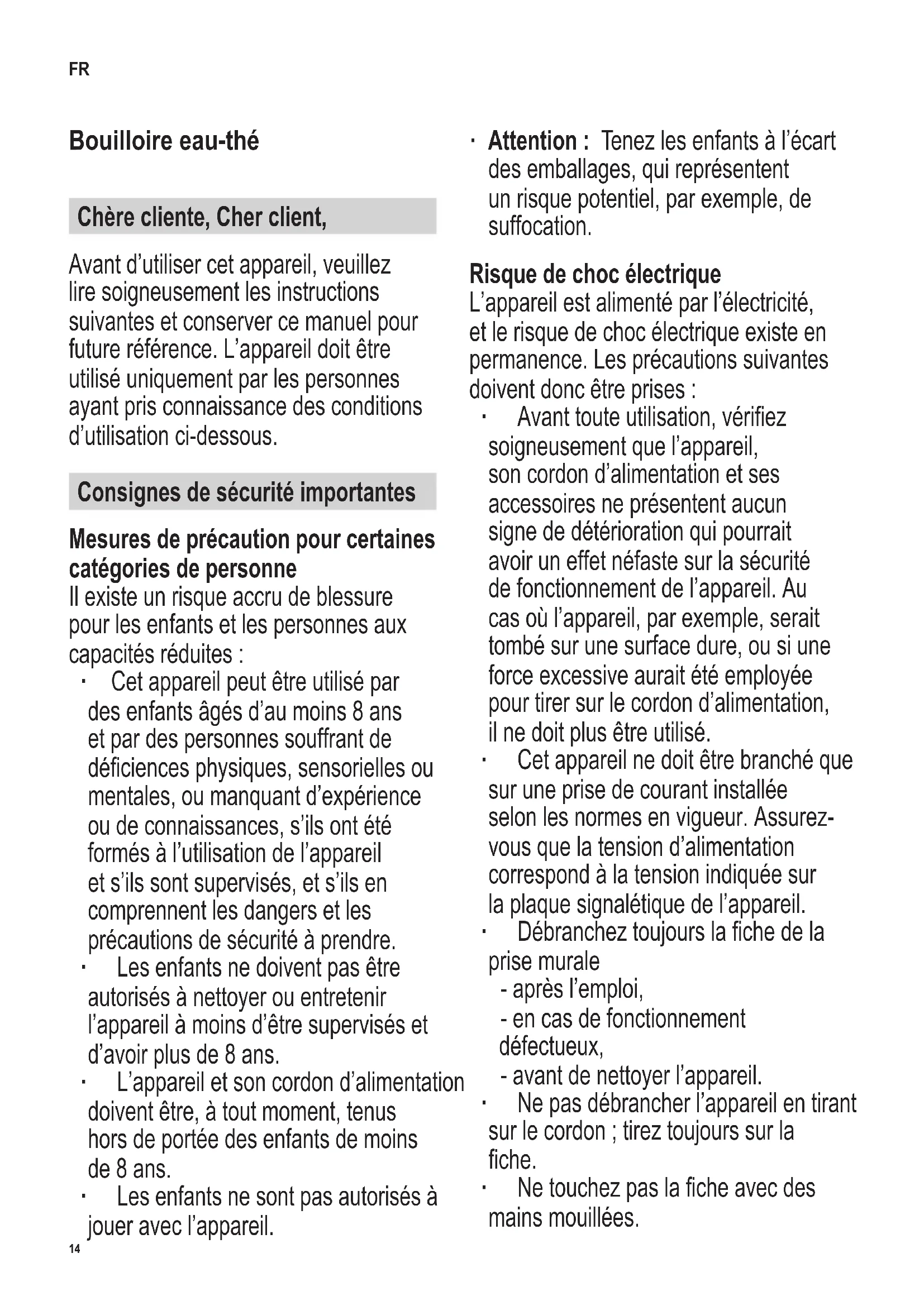 Placez toujours l’appareil sur une surface sèche, plane, antidérapante, résistant à la chaleur et qui ne craint pas le contact avec les pieds en caoutchouc. ∙ Ne pas utiliser l’appareil sous un placard mural ou autre objet similaire, au risque de bloquer le bon échappement de la vapeur. ∙ Ne pas laisser pendre le cordon. ∙ Ne pas entortiller ou pincer le cordon d’alimentation. ∙ Tenez le cordon d’alimentation et l’appareil à l’écart des sources de chaleur (par exemple plaques de cuisson et ammes de gaz). Utilisation correcte ∙ Cet appareil doit être utilisé uniquement pour faire chauffer de l’eau claire et fraîche et pour préparer des boissons chaudes. ∙ Attention ! Toute autre utilisation autre que celle spéciée dans les instructions (mauvaise utilisation), doit être considérée comme inadéquate et peut occasionner des blessures corporelles ou des dommages matériels. ∙ Cet appareil est destiné à être utilisé dans des applications domestiques et analogues telles que : - des coins cuisines réservés au personnel dans des magasins, bureaux et autres environnements professionnels ; - des fermes ; - l‘utilisation par les clients des hôtels, motels et autres environnements à caractère résidentiel ; - des environnements de type chambres d‘hôtes. ∙ Ne pas laisser l’appareil sans surveillance lorsqu’il est branché. En cas d’appareil défectueux Un appareil défectueux peut entraîner des dommages matériels ou des blessures : ∙ Vériez l’appareil an de détecter tout signe de dommage avant chaque utilisation. Ne pas faire fonctionner si l’appareil montre des signes de dommage. ∙ En cas de dommage, veuillez contacter notre service clientèle par téléphone ou par email (voir appendice). ∙ Les réparations sur l’appareil ou son cordon d’alimentation doivent être effectuées uniquement par notre service clientèle.17 142 x 208 mm Aperçu et pièces incluses