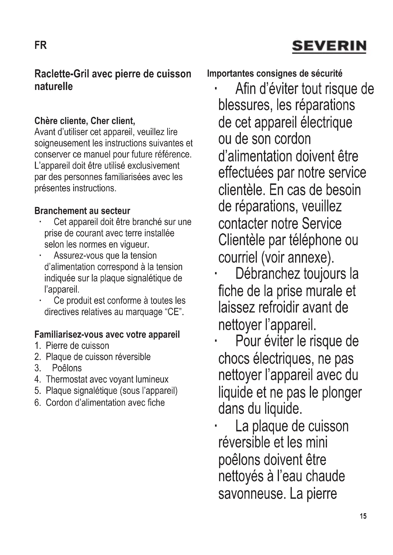 Fonctionnement Conseil : Pour optimiser la cuisson au gril, la viande doit être sortie du réfrigérateur environ 30 minutes avant la cuisson et laissée reposée sur assiette couverte. ∙ Installez la pierre de cuisson et la plaque de cuisson réversible sur l’appareil. ∙ Branchez l’appareil sur une prise murale et tournez le thermostat, à fond, vers la droite. ∙ Laissez préchauffer l’appareil pendant 10 minutes environ. L’utilisation de la pierre de cuisson demande cependant un temps de préchauffage d’environ 25 minutes. ∙ Placez les aliments à cuire soit sur la pierre, soit sur la plaque de cuisson réversible. ∙ Placez le fromage à raclette dans les poêlons, puis laissez les poêlons sous la résistance de l’appareil, jusqu’à la fonte du fromage. ∙ Avertissement : Ne pas placer les poêlons vides dans l’appareil lorsqu’il est en marche. ∙ Tournez le thermostat, à fond, vers la gauche et débranchez l’appareil après utilisation. Préparation du fromage Nous vous conseillons d’utiliser environ 200 à 300 gr. de fromage par personne. Coupez le fromage en tranches d’une épaisseur de 3 à 5 mm, puis mettez-les dans les poêlons. Utilisez de préférence des fromages de type raclette ou à pâte molle. Conseils pratiques ∙ Avant de les griller, faites décongeler les aliments congelés. ∙ Pour éviter d’endommager le revêtement antiadhésif de la plaque de cuisson réversible et des poêlons, utilisez uniquement des ustensiles non abrasifs. ∙ Lors de la cuisson de quantités d’aliments importantes, retirez régulièrement la graisse accumulée à l’aide d’un papier essuie-tout ou similaire.20 104 x 142 mm Entretien et nettoyage ∙ Avant tout nettoyage, débranchez d’abord la che de la prise de courant et laissez refroidir l’appareil. ∙ Pour éviter le risque de chocs électriques, ne pas nettoyer l’appareil avec du liquide et ne pas le plonger dans du liquide. ∙ Ne pas utiliser de produits d’entretien surpuissants ou abrasifs. ∙ Essuyez le corps de l’appareil avec un chiffon humide. ∙ Retirez les poêlons et la plaque de cuisson réversible après le refroidissement de l’appareil et rincez à l’eau chaude additionnée d’un détergent doux, si nécessaire. Séchez-le ensuite à l’aide d’un chiffon doux. ∙ Assurez-vous que la pierre est sufsamment refroidie avant de la retirer pour la nettoyer. Nettoyez-la sous l’eau courante à l’aide d’une éponge synthétique (sans détergent), puis séchez-la soigneusement avec un chiffon doux. Ne pas immerger la pierre dans l’eau. Mise au rebut Les appareils qui portent ce symbole doivent être collectés et traités séparément de vos déchets ménagers, car ils contiennent des matériaux précieux qui peuvent être recyclés. En vous débarrassant correctement de ces appareils, vous contribuez à la prévention de potentiels effets négatifs sur la santé humaine et l’environnement. Votre mairie ou le magasin auprès duquel vous avez acquis l’appareil peuvent vous donner des informations à ce sujet. Garantie Cet appareil est garanti par le fabricant pendant une durée de deux ans à partir de la date d‘achat, contre tous défauts de matière et vices de fabrication. Au cours de cette période, toute pièce défectueuse sera remplacée gratuitement. Cette garantie ne couvre pas l‘usure normale de l‘appareil, les pièces cassables telles que du verre, des ampoules, etc., ni les détériorations provoquées par une mauvaise utilisation et le non-respect du mode d‘emploi. Aucune garantie ne sera due si l‘appareil a fait l‘objet d‘une intervention à titre de réparation ou d‘entretien par des personnes non-agréées par nous-mêmes. Cette garantie n‘affecte pas les droits légaux des consommateurs sous les lois nationales applicables en vigueur, ni les droits du consommateur face au revendeur résultant du contrat de vente/d‘achat. Si votre appareil ne fonctionne plus normalement, veuillez l‘adresser, sous emballage solide, à une de nos stations de service après-vente agréées, muni de votre nom et adresse. Si vous retournez votre appareil pendant la période de garantie, n‘oubliez pas de joindre à votre envoi la preuve de garantie (ticket de caisse, facture etc.) certiée par le vendeur.104 x 142 mm