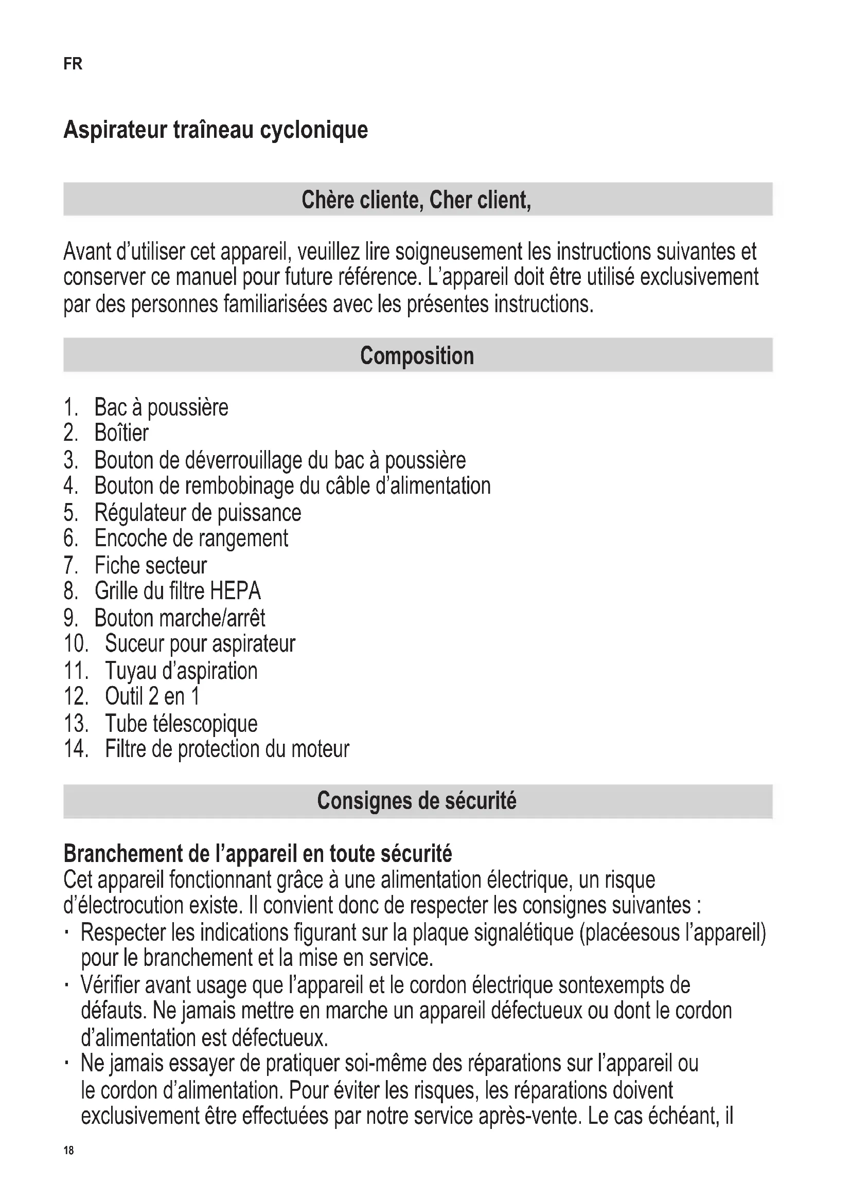 Remettre en marche l’appareil refroidi. L’appareil n’aspire pas beaucoup de saletés, la puissance d’aspiration a fortement baissé Vous devez vider le bac à poussière (voir « Vidange/nettoyage du bac à poussière »). À cette occasion, il est recommandé de nettoyer aussi le ltre (voir « Nettoyage ou remplacement du ltre »). Le commutateur « tapis et moquettes/sols durs » de la brosse combinée n’est pas sur la position qui convient au revêtement de sol. Sélectionnez la position du commutateur adaptée. Une odeur survient en passant l’aspirateur ou de la poussière sort de l’appareil Vraisemblablement, des éléments du bac à poussière ou des accessoires de l'aspirateur, démontés pour nettoyer les ltres ou changer les accessoires, n'ont pas été remontés ou refermés correctement. Vériez que tous les éléments sont bien en place et bien serrés. ∙ Si cela ne suft pas, contactez notre service après-vente. ∙ Vous trouverez ses coordonnées dans les annexes de cette notice ou sur notre page d’accueil. Pièces de rechange, garantie et mise au rebut 5103-048: 1 ltre du bac à poussière + 1 ltre HEPA PB7217: 1 brosse pour parquet TB7216: 1 brosse turbo ZB7214: 1 suceur long exible24 142 x 208 mm Mise au rebut Les appareils qui portent ce symbole doivent être collectés et traités séparément de vos déchets ménagers, car ils contiennent des matériaux précieux qui peuvent être recyclés. En vous débarrassant correctement de ces appareils, vous contribuez à la prévention de potentiels effets négatifs sur la santé humaine et l’environnement. Votre mairie ou le magasin auprès duquel vous avez acquis l’appareil peuvent vous donner des informations à ce sujet. Garantie Cet appareil est garanti par le fabricant pendant une durée de deux ans à partir de la date d‘achat, contre tous défauts de matière et vices de fabrication. Au cours de cette période, toute pièce défectueuse sera remplacée gratuitement. Cette garantie ne couvre pas l‘usure normale de l‘appareil, les pièces cassables telles que du verre, des ampoules, etc., ni les détériorations provoquées par une mauvaise utilisation et le non-respect du mode d‘emploi. Aucune garantie ne sera due si l‘appareil a fait l‘objet d‘une intervention à titre de réparation ou d‘entretien par des personnes non-agréées par nous- mêmes. Cette garantie n‘affecte pas les droits légaux des consommateurs sous les lois nationales applicables en vigueur, ni les droits du consommateur face au revendeur résultant du contrat de vente/d‘achat. Si votre appareil ne fonctionne plus normalement, veuillez l‘adresser, sous emballage solide, à une de nos stations de service après-vente agréées, muni de votre nom et adresse. Si vous retournez votre appareil pendant la période de garantie, n‘oubliez pas de joindre à votre envoi la preuve de garantie (ticket de caisse, facture etc.) certiée par le vendeur.25 142 x 208 mm Cycloonstofzuiger Geachte klant, Lees de gebruiksaanwijzing zorgvuldig door voordat u het apparaat gebruikt en bewaar deze voor toekomstig gebruik. Het apparaat mag alleen worden gebruikt door personen die bekend zijn met de veiligheidsinstructies. Ontwerp