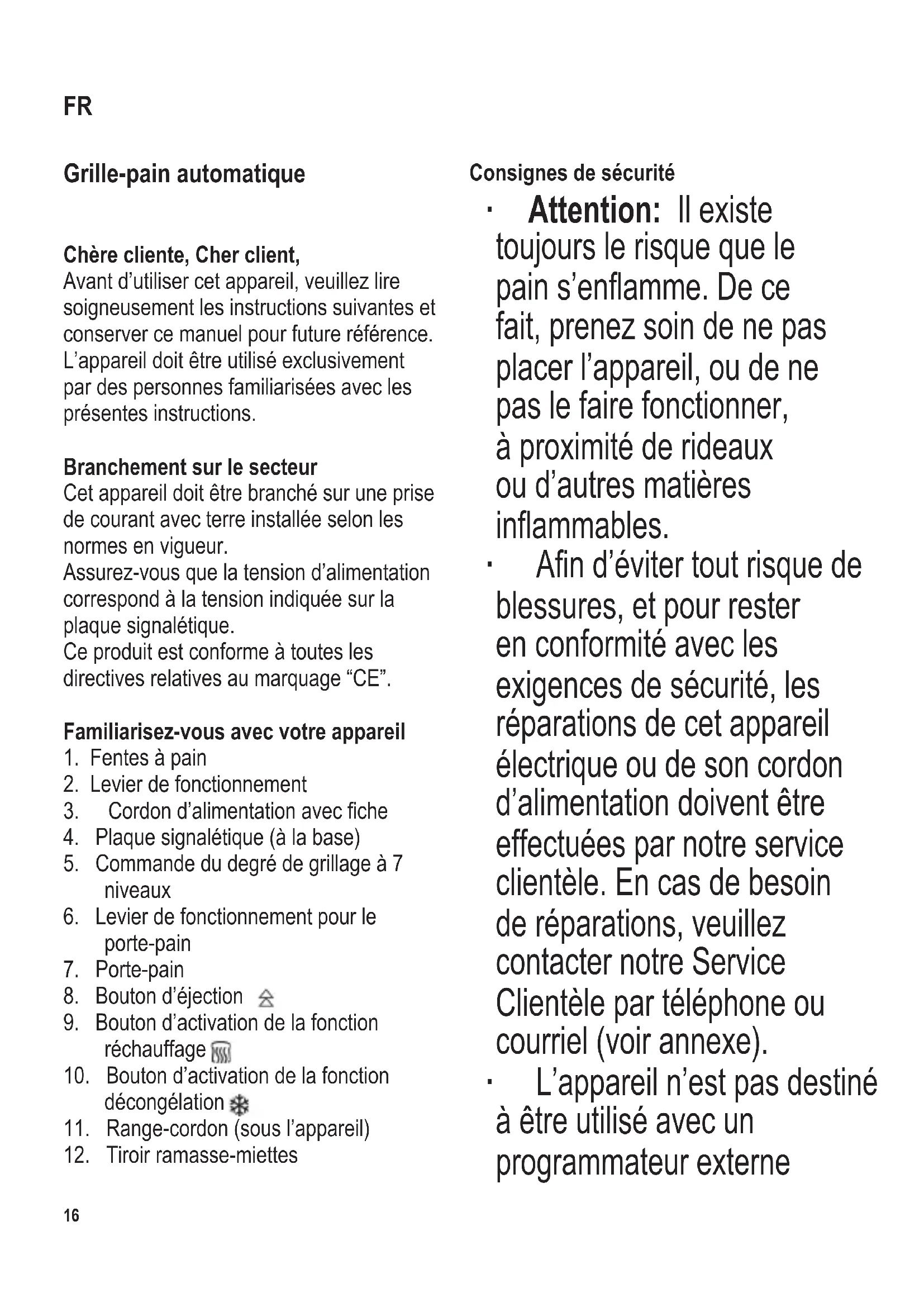 Consignes de sécurité ∙ Attention : Il existe toujours le risque que le pains’enamme.Dece fait, prenez soin de ne pas placer l’appareil, ou de ne pas le faire fonctionner, à proximité de rideaux ou d’autres matières inammables. ∙ And’évitertoutrisquede blessures, et pour rester en conformité avec les exigences de sécurité, les réparations de cet appareil électrique ou de son cordon d’alimentation doivent être effectuées par notre service clientèle. En cas de besoin de réparations, veuillez contacter notre Service Clientèle par téléphone ou courriel (voir annexe). ∙ L’appareil n’est pas destiné à être utilisé avec un programmateur externe FR104 x 142 mm