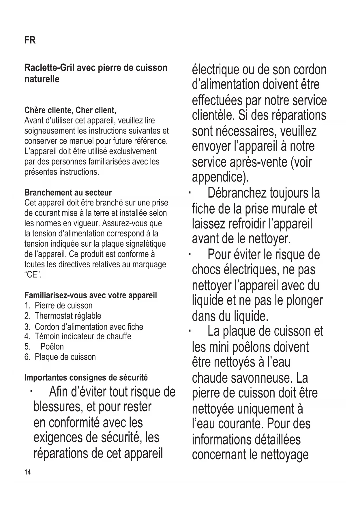 Importantes consignes de sécurité ∙ An d’éviter tout risque de blessures, et pour rester en conformité avec les exigences de sécurité, les réparations de cet appareil électrique ou de son cordon d’alimentation doivent être effectuées par notre service clientèle. Si des réparations sont nécessaires, veuillez envoyer l’appareil à notre service après-vente (voir appendice). ∙ Débranchez toujours la che de la prise murale et laissez refroidir l’appareil avant de le nettoyer. ∙ Pour éviter le risque de chocs électriques, ne pas nettoyer l’appareil avec du liquide et ne pas le plonger dans du liquide. ∙ La plaque de cuisson et les mini poêlons doivent être nettoyés à l’eau chaude savonneuse. La pierre de cuisson doit être nettoyée uniquement à l’eau courante. Pour des informations détaillées concernant le nettoyage FR104 x 142 mm