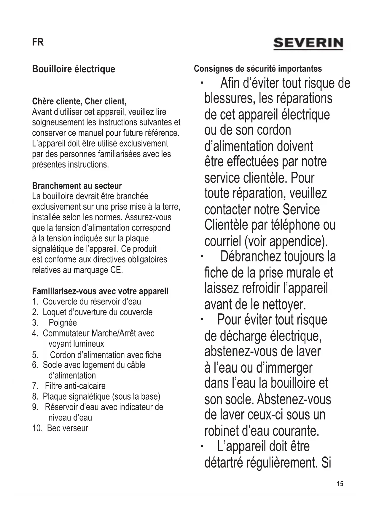 Consignes de sécurité importantes ∙ And’évitertoutrisquede blessures, les réparations de cet appareil électrique ou de son cordon d’alimentation doivent être effectuées par notre service clientèle. Pour toute réparation, veuillez contacter notre Service Clientèle par téléphone ou courriel (voir appendice). ∙ Débranchez toujours la chedelaprisemuraleet laissez refroidir l’appareil avant de le nettoyer. ∙ Pour éviter tout risque de décharge électrique, abstenez-vous de laver à l’eau ou d’immerger dans l’eau la bouilloire et son socle. Abstenez-vous de laver ceux-ci sous un robinet d’eau courante. ∙ L’appareil doit être détartré régulièrement. Si FR16 104 x 142 mm nécessaire, nettoyez le réservoir d’eau avec un chiffon humide. ∙ Des informations détaillées concernant le nettoyage de l’appareil se trouvent dans le paragraphe Entretien et nettoyage. ∙ Cet appareil peut être utilisé par des enfants (à partir de 8 ans) et par des personnes souffrant de déciencesphysiques, sensorielles ou mentales, ou manquant d’expérience ou de connaissances, s’ils ont été formés à l’utilisation de l’appareil et s’ils sont supervisés, et s’ils en comprennent les dangers et les précautions de sécurité à prendre. ∙ Les enfants ne sont pas autorisés à jouer avec l’appareil. ∙ Les enfants ne doivent pas être autorisés à nettoyer ou entretenir l’appareil à moins d’être supervisés et d’avoir plus de 8 ans. ∙ L’appareil et son cordon d’alimentation doivent être, à tout moment, tenus hors de portée des enfants de moins de 8 ans. ∙ Cet appareil est destiné à être utilisé dans des applications domestiques et analogues telles que : - des coins cuisines réservés au personnel dans des magasins, bureaux et autres environnements professionnels ; - des fermes ; - l’utilisation par les clients des hôtels, motels et autres environnements à caractère résidentiel ; - des environnements de type chambres d’hôtes.104 x 142 mm
