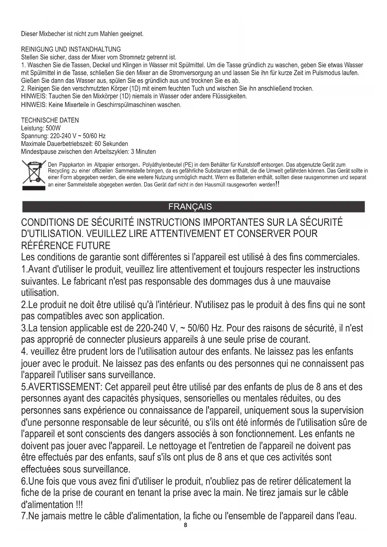 Temps de pause minimum entre les cycles de travail: 3 minutes Temps de fonctionnement continu maximum: 60 secondes Respect de l'environnement. Nous vous prions de bien vouloir trier les emballages en carton ainsi que les sachets plastiques (en polyéthylène). L'appareil usagé ne doit pas être jeté à la poubelle mais remis au point de collecte prévu à cet effet car il contient des éléments pouvant être nocifs pour l'environnement. L'appareil électrique doit être remis de manière à limiter au maximum une éventuelle utilisation ultérieure. Si l'appareil contient des piles, il faut les retirer et les remettre à un autre point de collecte. Ne pas jeter l'appareil dans une poubelle de déchets ménagers !!! ESPAÑOL