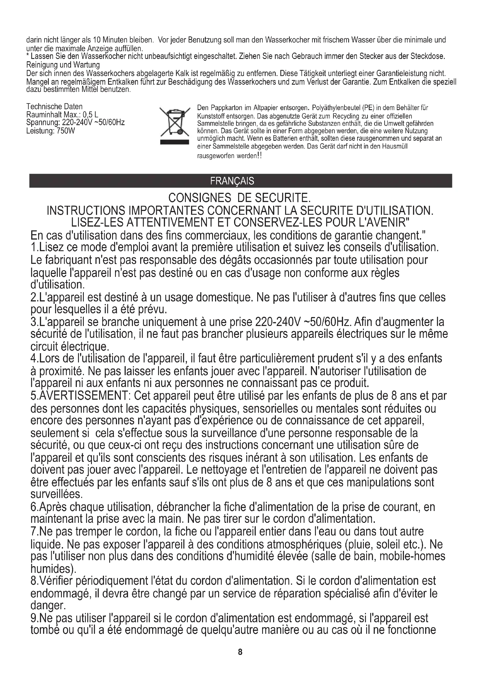 - Lassen Sie den Wasserkocher nicht unbeaufsichtigt eingeschaltet. Ziehen Sie nach Gebrauch immer den Stecker aus der Steckdose. Technische Daten Rauminhalt Max.: 0,5 L Leistung: 750W Spannung: 220-240V ~50/60Hz Den Pappkarton im Altpapier entsorgen. Polyäthylenbeutel (PE) in dem Behälter für Kunststoff entsorgen. Das abgenutzte Gerät zum Recycling zu einer offiziellen Sammelstelle bringen, da es gefährliche Substanzen enthält, die die Umwelt gefährden können. Das Gerät sollte in einer Form abgegeben werden, die eine weitere Nutzung unmöglich macht. Wenn es Batterien enthält, sollten diese rausgenommen und separat an einer Sammelstelle abgegeben werden. Das Gerät darf nicht in den Hausmüll rausgeworfen werden!! FRANÇAIS 9.Ne pas utiliser l'appareil si le cordon d'alimentation est endommagé, si l'appareil est tombé ou qu'il a été endommagé de quelqu'autre manière ou au cas où il ne fonctionne 5.AVERTISSEMENT: Cet appareil peut être utilisé par les enfants de plus de 8 ans et par des personnes dont les capacités physiques, sensorielles ou mentales sont réduites ou encore des personnes n'ayant pas d'expérience ou de connaissance de cet appareil, seulement si cela s'effectue sous la surveillance d'une personne responsable de la sécurité, ou que ceux-ci ont reçu des instructions concernant une utilisation sûre de l'appareil et qu'ils sont conscients des risques inérant à son utilisation. Les enfants de doivent pas jouer avec l'appareil. Le nettoyage et l'entretien de l'appareil ne doivent pas être effectués par les enfants sauf s'ils ont plus de 8 ans et que ces manipulations sont surveillées. 1.Lisez ce mode d'emploi avant la première utilisation et suivez les conseils d'utilisation. Le fabriquant n'est pas responsable des dégâts occasionnés par toute utilisation pour laquelle l'appareil n'est pas destiné ou en cas d'usage non conforme aux règles d'utilisation. 3.L'appareil se branche uniquement à une prise 220-240V ~50/60Hz. Afin d'augmenter la sécurité de l'utilisation, il ne faut pas brancher plusieurs appareils électriques sur le même circuit électrique. 4.Lors de l'utilisation de l'appareil, il faut être particulièrement prudent s'il y a des enfants à proximité. Ne pas laisser les enfants jouer avec l'appareil. N'autoriser l'utilisation de l'appareil ni aux enfants ni aux personnes ne connaissant pas ce produit. 2.L'appareil est destiné à un usage domestique. Ne pas l'utiliser à d'autres fins que celles pour lesquelles il a été prévu. INSTRUCTIONS IMPORTANTES CONCERNANT LA SECURITE D'UTILISATION. 8.Vérifier périodiquement l'état du cordon d'alimentation. Si le cordon d'alimentation est endommagé, il devra être changé par un service de réparation spécialisé afin d'éviter le danger.