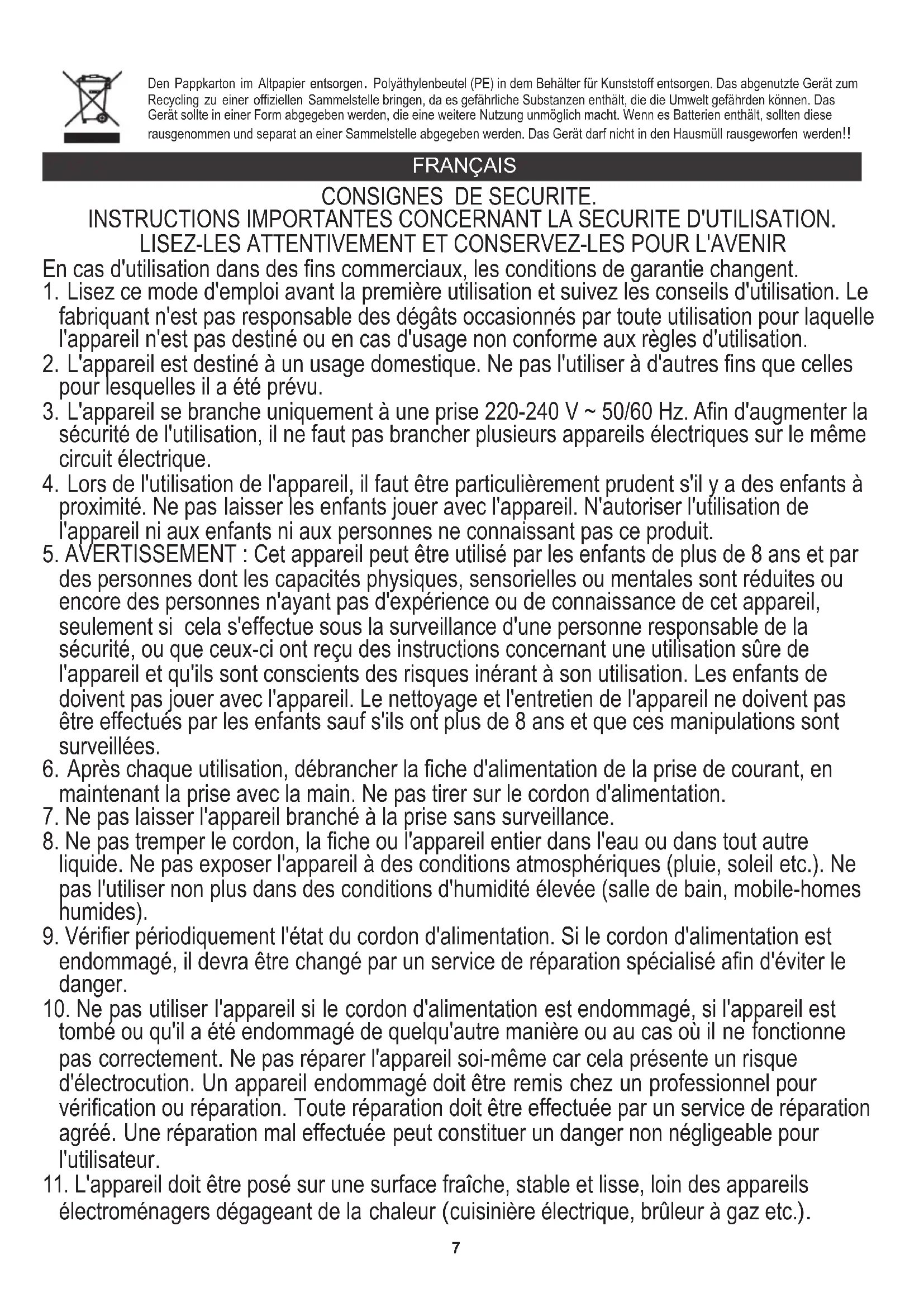 proximité. Ne pas laisser les enfants jouer avec l'appareil. N'autoriser l'utilisation de l'appareil ni aux enfants ni aux personnes ne connaissant pas ce produit. FRANÇAIS Den Pappkarton im Altpapier entsorgen. Polyäthylenbeutel (PE) in dem Behälter für Kunststoff entsorgen. Das abgenutzte Gerät zum Recycling zu einer offiziellen Sammelstelle bringen, da es gefährliche Substanzen enthält, die die Umwelt gefährden können. Das Gerät sollte in einer Form abgegeben werden, die eine weitere Nutzung unmöglich macht. Wenn es Batterien enthält, sollten diese rausgenommen und separat an einer Sammelstelle abgegeben werden. Das Gerät darf nicht in den Hausmüll rausgeworfen werden!!8