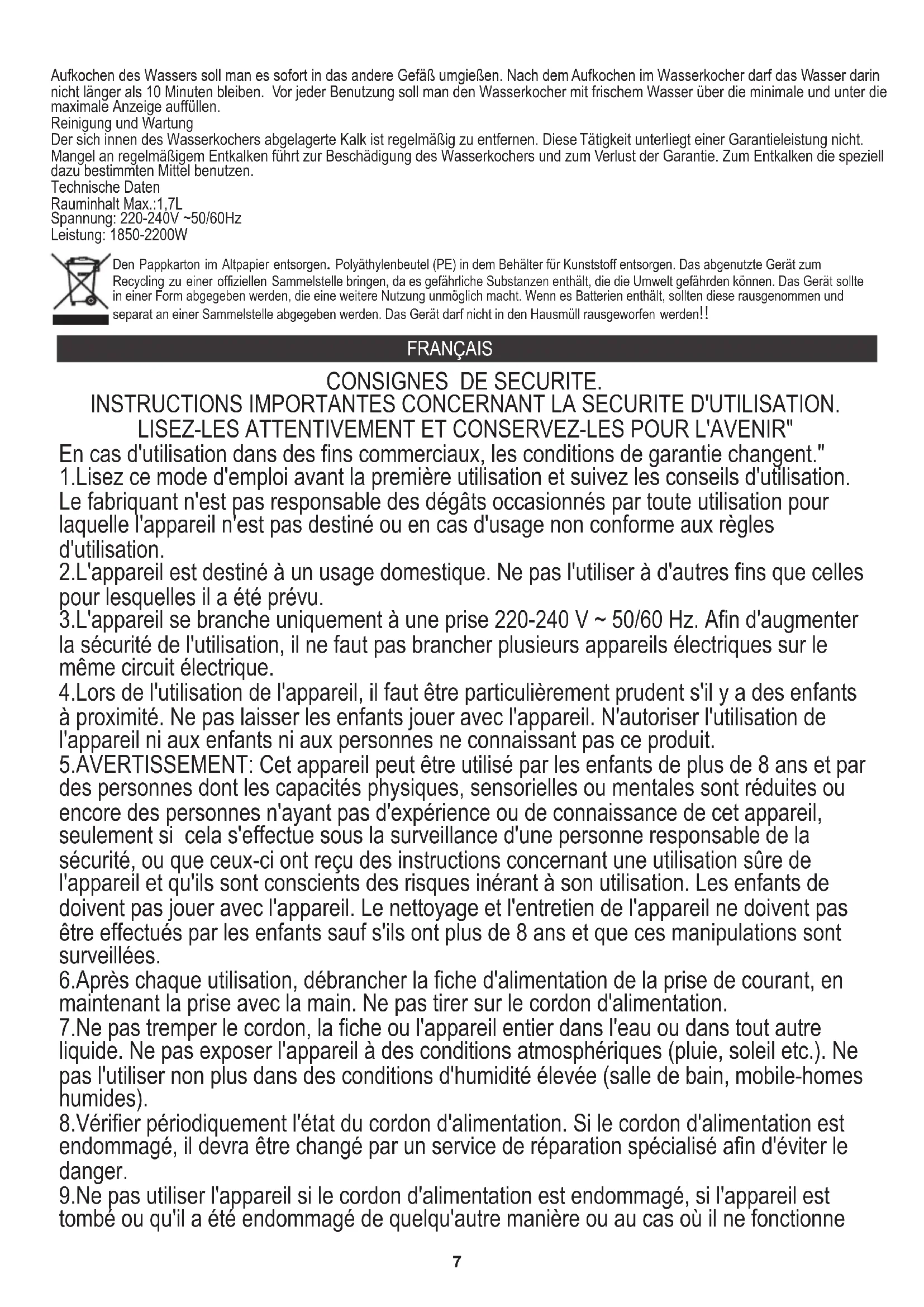 Aufkochen des Wassers soll man es sofort in das andere Gefäß umgießen. Nach dem Aufkochen im Wasserkocher darf das Wasser darin nicht länger als 10 Minuten bleiben. Vor jeder Benutzung soll man den Wasserkocher mit frischem Wasser über die minimale und unter die maximale Anzeige auffüllen. Reinigung und Wartung Der sich innen des Wasserkochers abgelagerte Kalk ist regelmäßig zu entfernen. Diese Tätigkeit unterliegt einer Garantieleistung nicht. Mangel an regelmäßigem Entkalken führt zur Beschädigung des Wasserkochers und zum Verlust der Garantie. Zum Entkalken die speziell dazu bestimmten Mittel benutzen. Leistung: 1850-2200W Rauminhalt Max.:1,7L Spannung: 220-240V ~50/60Hz Technische Daten Den Pappkarton im Altpapier entsorgen. Polyäthylenbeutel (PE) in dem Behälter für Kunststoff entsorgen. Das abgenutzte Gerät zum Recycling zu einer offiziellen Sammelstelle bringen, da es gefährliche Substanzen enthält, die die Umwelt gefährden können. Das Gerät sollte in einer Form abgegeben werden, die eine weitere Nutzung unmöglich macht. Wenn es Batterien enthält, sollten diese rausgenommen und separat an einer Sammelstelle abgegeben werden. Das Gerät darf nicht in den Hausmüll rausgeworfen werden!! FRANÇAIS 7.Ne pas tremper le cordon, la fiche ou l'appareil entier dans l'eau ou dans tout autre liquide. Ne pas exposer l'appareil à des conditions atmosphériques (pluie, soleil etc.). Ne pas l'utiliser non plus dans des conditions d'humidité élevée (salle de bain, mobile-homes humides). 5.AVERTISSEMENT: Cet appareil peut être utilisé par les enfants de plus de 8 ans et par des personnes dont les capacités physiques, sensorielles ou mentales sont réduites ou encore des personnes n'ayant pas d'expérience ou de connaissance de cet appareil, seulement si cela s'effectue sous la surveillance d'une personne responsable de la sécurité, ou que ceux-ci ont reçu des instructions concernant une utilisation sûre de l'appareil et qu'ils sont conscients des risques inérant à son utilisation. Les enfants de doivent pas jouer avec l'appareil. Le nettoyage et l'entretien de l'appareil ne doivent pas être effectués par les enfants sauf s'ils ont plus de 8 ans et que ces manipulations sont surveillées. 8.Vérifier périodiquement l'état du cordon d'alimentation. Si le cordon d'alimentation est endommagé, il devra être changé par un service de réparation spécialisé afin d'éviter le danger. 9.Ne pas utiliser l'appareil si le cordon d'alimentation est endommagé, si l'appareil est tombé ou qu'il a été endommagé de quelqu'autre manière ou au cas où il ne fonctionne En cas d'utilisation dans des fins commerciaux, les conditions de garantie changent." CONSIGNES DE SECURITE. 2.L'appareil est destiné à un usage domestique. Ne pas l'utiliser à d'autres fins que celles pour lesquelles il a été prévu. 3.L'appareil se branche uniquement à une prise 220-240 V ~ 50/60 Hz. Afin d'augmenter la sécurité de l'utilisation, il ne faut pas brancher plusieurs appareils électriques sur le même circuit électrique.