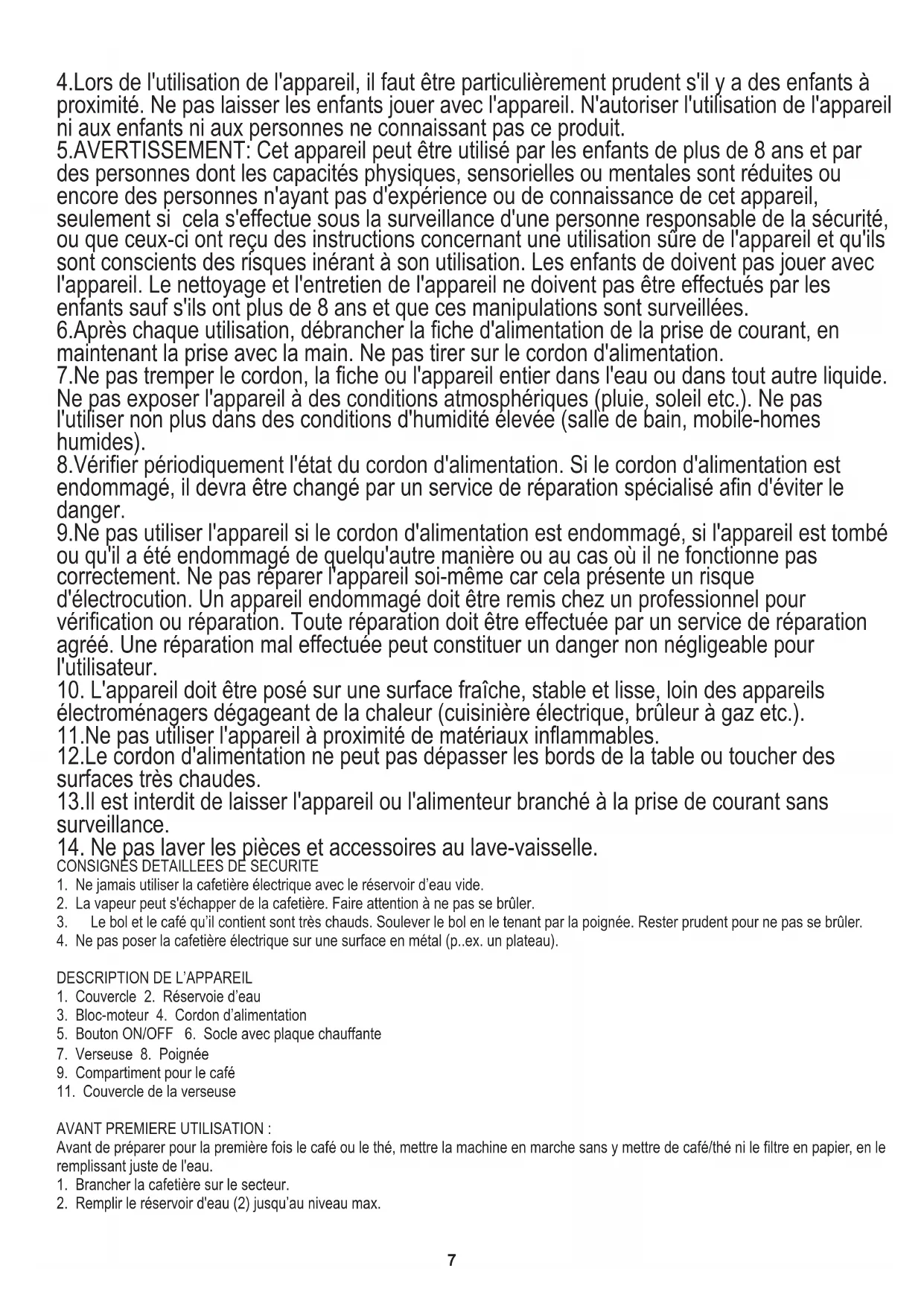 En cas d'utilisation dans des fins commerciaux, les conditions de garantie changent." 1.Lisez ce mode d'emploi avant la première utilisation et suivez les conseils d'utilisation. Le fabriquant n'est pas responsable des dégâts occasionnés par toute utilisation pour laquelle l'appareil n'est pas destiné ou en cas d'usage non conforme aux règles d'utilisation. 2.L'appareil est destiné à un usage domestique. Ne pas l'utiliser à d'autres fins que celles pour lesquelles il a été prévu. 3.L'appareil se branche uniquement à une prise 230 V ~ 50 Hz. Afin d'augmenter la sécurité de l'utilisation, il ne faut pas brancher plusieurs appareils électriques sur le même circuit électrique.7 4.Lors de l'utilisation de l'appareil, il faut être particulièrement prudent s'il y a des enfants à proximité. Ne pas laisser les enfants jouer avec l'appareil. N'autoriser l'utilisation de l'appareil ni aux enfants ni aux personnes ne connaissant pas ce produit. 5.AVERTISSEMENT: Cet appareil peut être utilisé par les enfants de plus de 8 ans et par des personnes dont les capacités physiques, sensorielles ou mentales sont réduites ou encore des personnes n'ayant pas d'expérience ou de connaissance de cet appareil, seulement si cela s'effectue sous la surveillance d'une personne responsable de la sécurité, ou que ceux-ci ont reçu des instructions concernant une utilisation sûre de l'appareil et qu'ils sont conscients des risques inérant à son utilisation. Les enfants de doivent pas jouer avec l'appareil. Le nettoyage et l'entretien de l'appareil ne doivent pas être effectués par les enfants sauf s'ils ont plus de 8 ans et que ces manipulations sont surveillées. 6.Après chaque utilisation, débrancher la fiche d'alimentation de la prise de courant, en maintenant la prise avec la main. Ne pas tirer sur le cordon d'alimentation. 7.Ne pas tremper le cordon, la fiche ou l'appareil entier dans l'eau ou dans tout autre liquide. Ne pas exposer l'appareil à des conditions atmosphériques (pluie, soleil etc.). Ne pas l'utiliser non plus dans des conditions d'humidité élevée (salle de bain, mobile-homes humides). 8.Vérifier périodiquement l'état du cordon d'alimentation. Si le cordon d'alimentation est endommagé, il devra être changé par un service de réparation spécialisé afin d'éviter le danger. 9.Ne pas utiliser l'appareil si le cordon d'alimentation est endommagé, si l'appareil est tombé ou qu'il a été endommagé de quelqu'autre manière ou au cas où il ne fonctionne pas correctement. Ne pas réparer l'appareil soi-même car cela présente un risque d'électrocution. Un appareil endommagé doit être remis chez un professionnel pour vérification ou réparation. Toute réparation doit être effectuée par un service de réparation agréé. Une réparation mal effectuée peut constituer un danger non négligeable pour l'utilisateur.