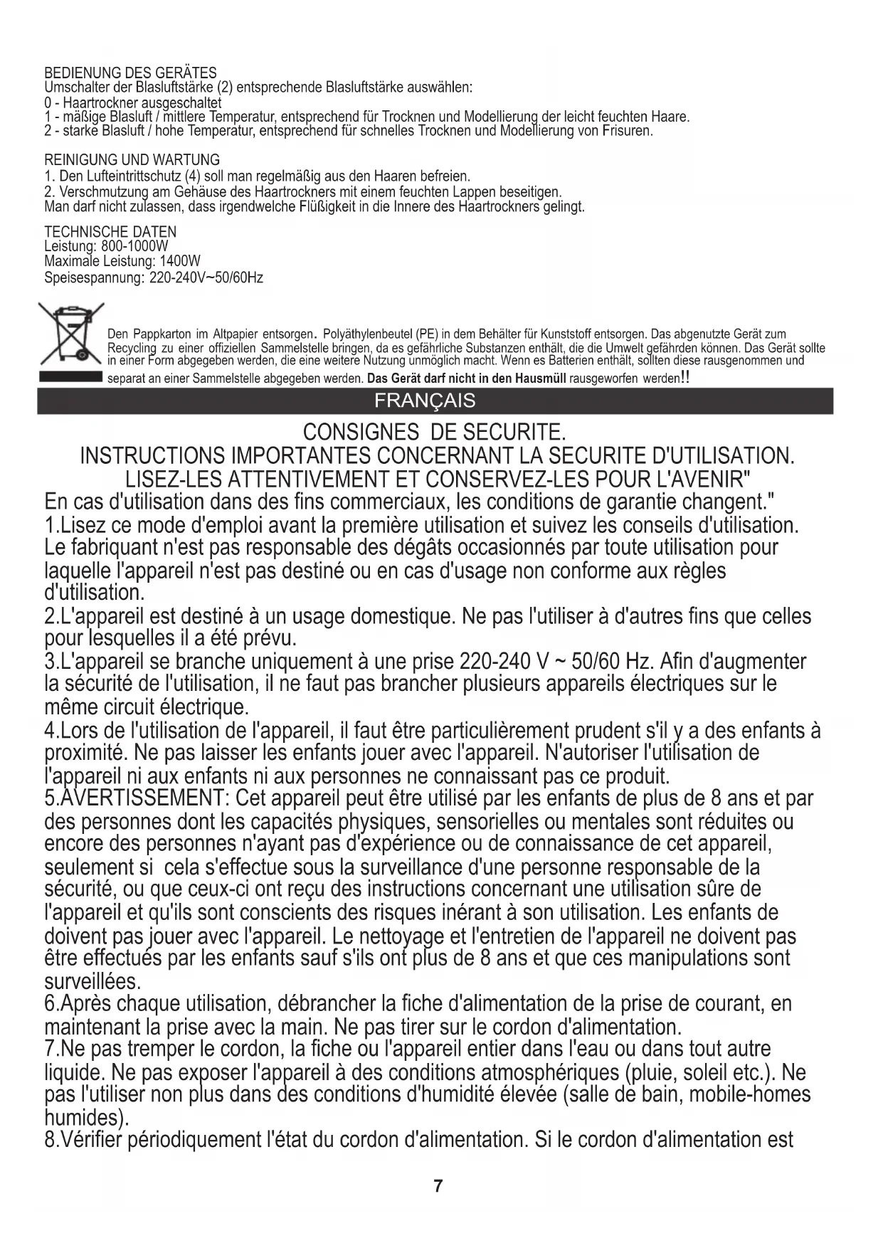 TECHNISCHE DATEN Leistung: 800-1000W FRANÇAIS CONSIGNES DE SECURITE. 1.Lisez ce mode d'emploi avant la première utilisation et suivez les conseils d'utilisation. Le fabriquant n'est pas responsable des dégâts occasionnés par toute utilisation pour laquelle l'appareil n'est pas destiné ou en cas d'usage non conforme aux règles d'utilisation. INSTRUCTIONS IMPORTANTES CONCERNANT LA SECURITE D'UTILISATION. En cas d'utilisation dans des fins commerciaux, les conditions de garantie changent."