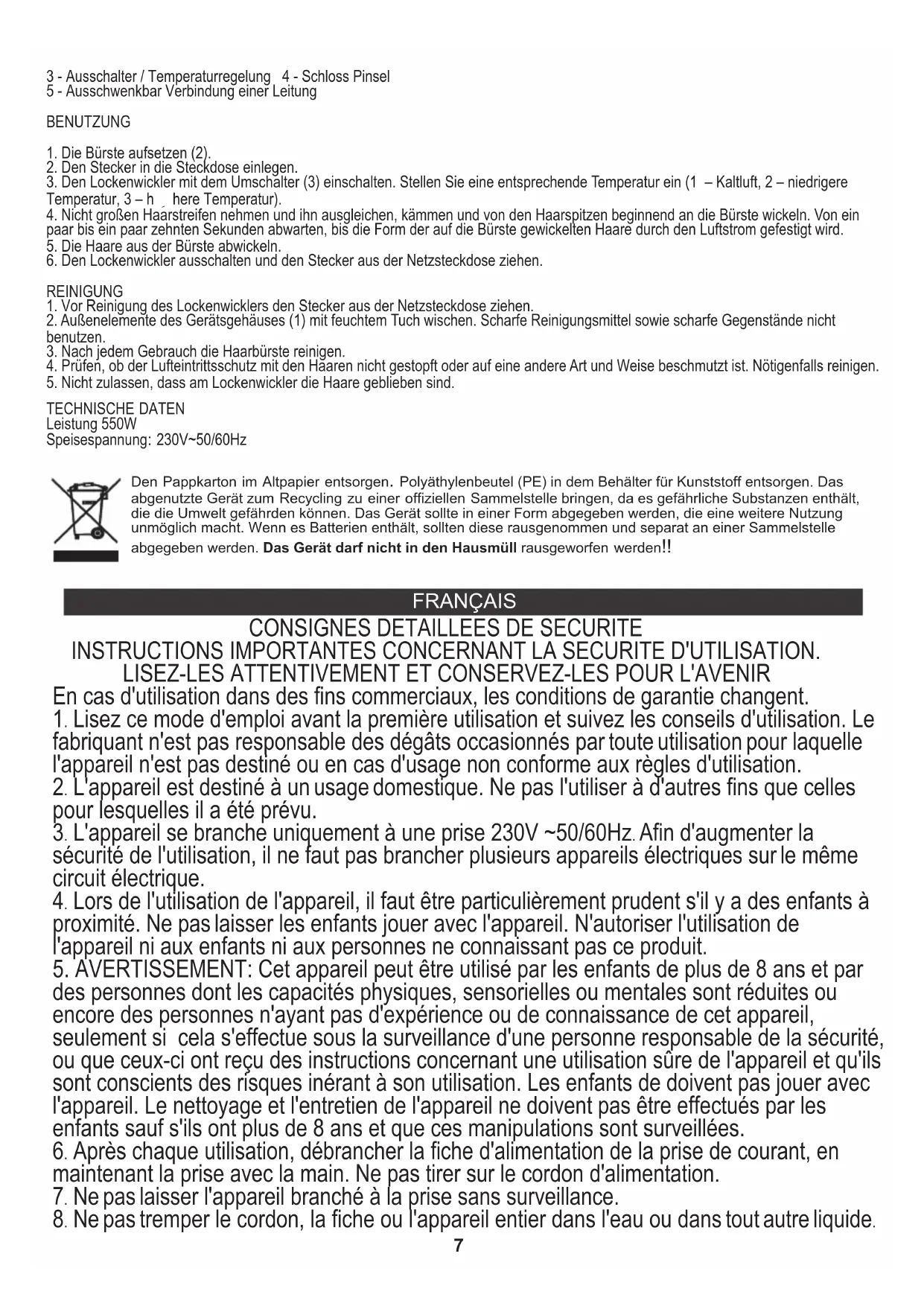 Respect de l'environnement. Nous vous prions de bien pouvoir trier les emballages en carton ainsi que les sachets plastiques (en polyéthylene). L'appareil usagé ne doit pas être jeté à la poubelle mais remis au point de collecte prévu à cet effet car il contient des éléments pouvant être nocifs pour l'environnement. L'appareil électrique doit être remis de manière à limiter au maximum une éventuelle utilisation ultérieure. Si l'appareil contient des piles, il faut les retirer et les remettre à un autre point de collecte.