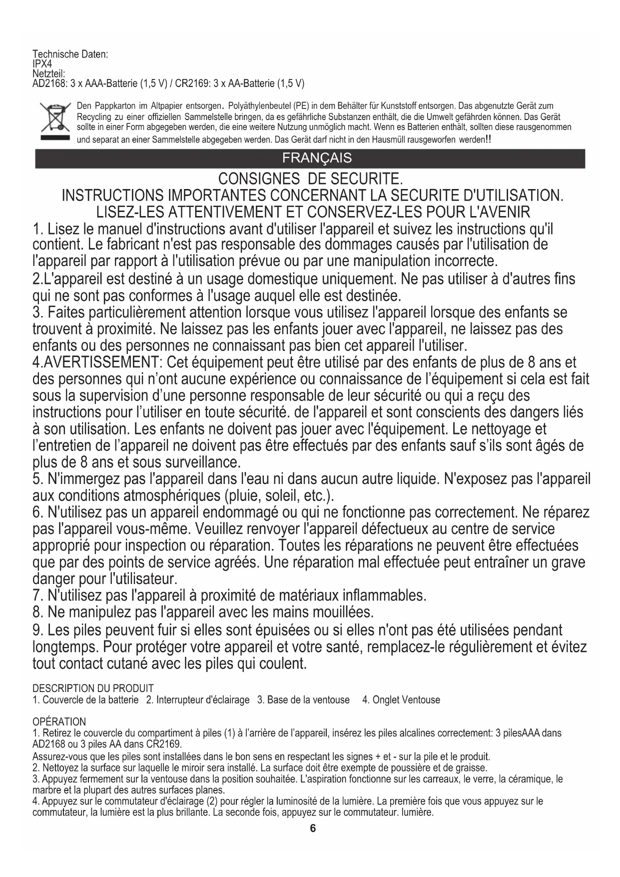 IPX4 6. Retirez les piles usagées ou usées de l'appareil et éliminez-les pour les recycler conformément aux réglementations nationales en matière d'élimination des déchets. Informations de sécurité importantes Ces informations s'appliquent aux produits qui utilisent des piles jetables. Utilisez uniquement des piles de même taille et de même type (alcalines, zinc-carbone, chlorure de zinc ou nickel-métal-hydrure).