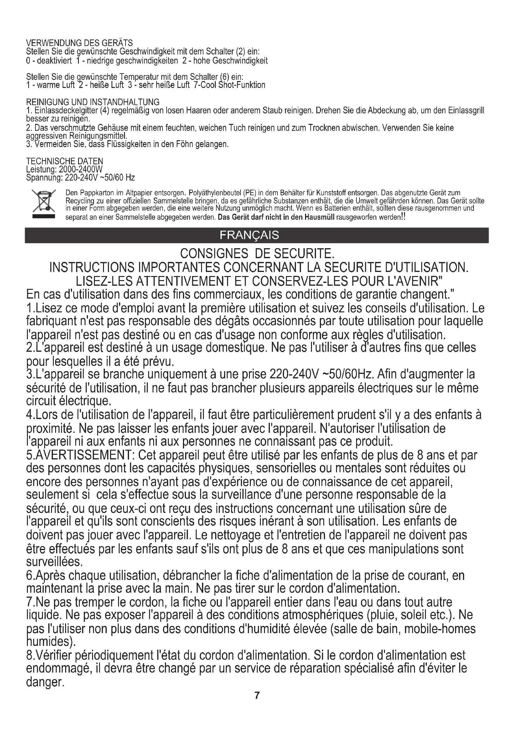 En cas d'utilisation dans des fins commerciaux, les conditions de garantie changent." 1.Lisez ce mode d'emploi avant la première utilisation et suivez les conseils d'utilisation. Le fabriquant n'est pas responsable des dégâts occasionnés par toute utilisation pour laquelle l'appareil n'est pas destiné ou en cas d'usage non conforme aux règles d'utilisation. 4.Lors de l'utilisation de l'appareil, il faut être particulièrement prudent s'il y a des enfants à proximité. Ne pas laisser les enfants jouer avec l'appareil. N'autoriser l'utilisation de l'appareil ni aux enfants ni aux personnes ne connaissant pas ce produit. 7.Ne pas tremper le cordon, la fiche ou l'appareil entier dans l'eau ou dans tout autre liquide. Ne pas exposer l'appareil à des conditions atmosphériques (pluie, soleil etc.). Ne pas l'utiliser non plus dans des conditions d'humidité élevée (salle de bain, mobile-homes humides). 2.L'appareil est destiné à un usage domestique. Ne pas l'utiliser à d'autres fins que celles pour lesquelles il a été prévu. 8.Vérifier périodiquement l'état du cordon d'alimentation. Si le cordon d'alimentation est endommagé, il devra être changé par un service de réparation spécialisé afin d'éviter le danger. 5.AVERTISSEMENT: Cet appareil peut être utilisé par les enfants de plus de 8 ans et par des personnes dont les capacités physiques, sensorielles ou mentales sont réduites ou encore des personnes n'ayant pas d'expérience ou de connaissance de cet appareil, seulement si cela s'effectue sous la surveillance d'une personne responsable de la sécurité, ou que ceux-ci ont reçu des instructions concernant une utilisation sûre de l'appareil et qu'ils sont conscients des risques inérant à son utilisation. Les enfants de doivent pas jouer avec l'appareil. Le nettoyage et l'entretien de l'appareil ne doivent pas être effectués par les enfants sauf s'ils ont plus de 8 ans et que ces manipulations sont surveillées. 3.L'appareil se branche uniquement à une prise 220-240V ~50/60Hz. Afin d'augmenter la sécurité de l'utilisation, il ne faut pas brancher plusieurs appareils électriques sur le même circuit électrique. 6.Après chaque utilisation, débrancher la fiche d'alimentation de la prise de courant, en maintenant la prise avec la main. Ne pas tirer sur le cordon d'alimentation. CONSIGNES DE SECURITE.
