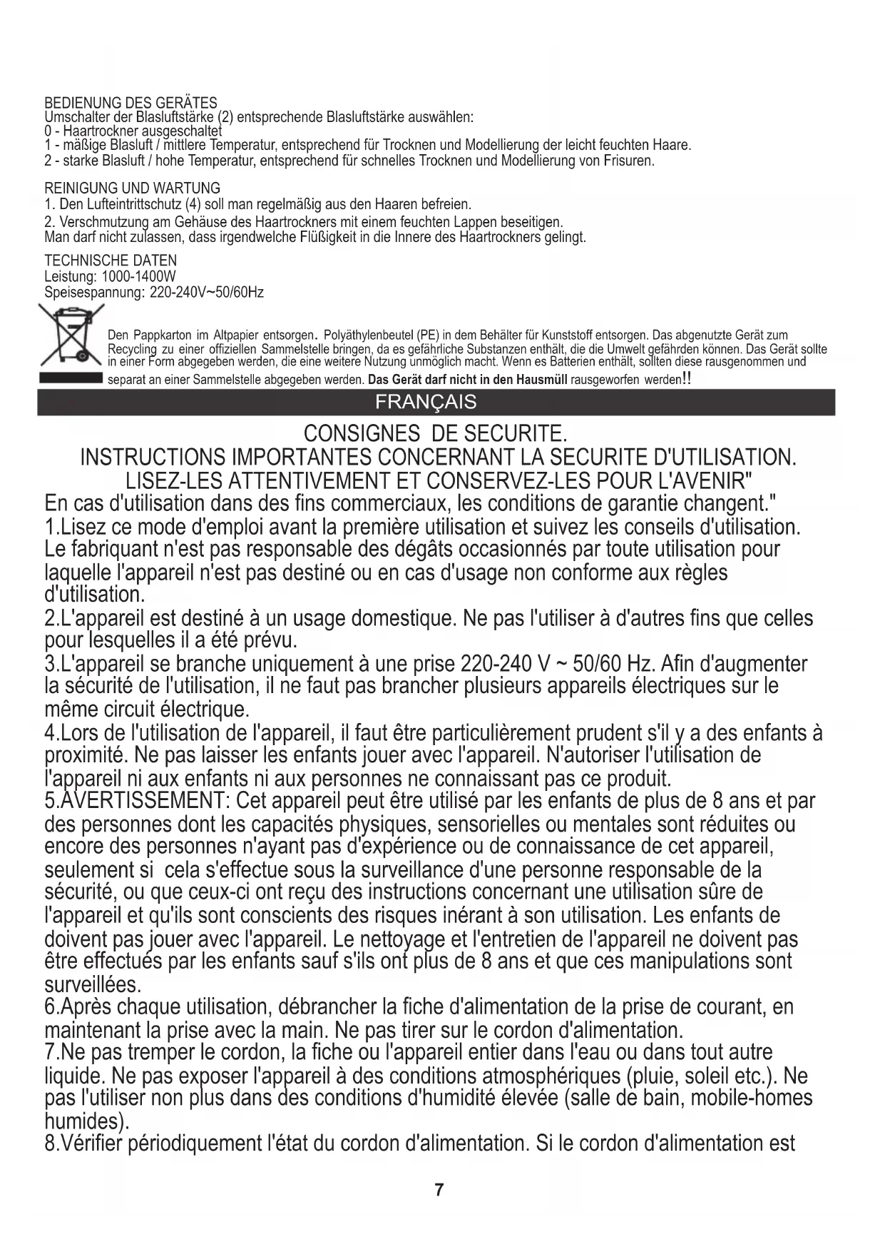Leistung: 1000-1400W TECHNISCHE DATEN FRANÇAIS 7.Ne pas tremper le cordon, la fiche ou l'appareil entier dans l'eau ou dans tout autre liquide. Ne pas exposer l'appareil à des conditions atmosphériques (pluie, soleil etc.). Ne pas l'utiliser non plus dans des conditions d'humidité élevée (salle de bain, mobile-homes humides). 4.Lors de l'utilisation de l'appareil, il faut être particulièrement prudent s'il y a des enfants à proximité. Ne pas laisser les enfants jouer avec l'appareil. N'autoriser l'utilisation de l'appareil ni aux enfants ni aux personnes ne connaissant pas ce produit. 6.Après chaque utilisation, débrancher la fiche d'alimentation de la prise de courant, en maintenant la prise avec la main. Ne pas tirer sur le cordon d'alimentation.
